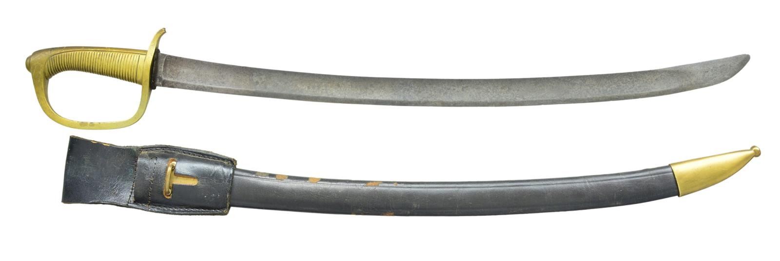Overall length 30" with a 23 3/8" blade. Plain blade with a single wide fuller. Solid brass hilt with horizontally reeded grip. Brass mounted black leather scabbard with black leather frog. CONDITION: blade has a gray patina. Quillon is missing. Scabbard shows light overall wear. (02-18995/BF). $100-200.