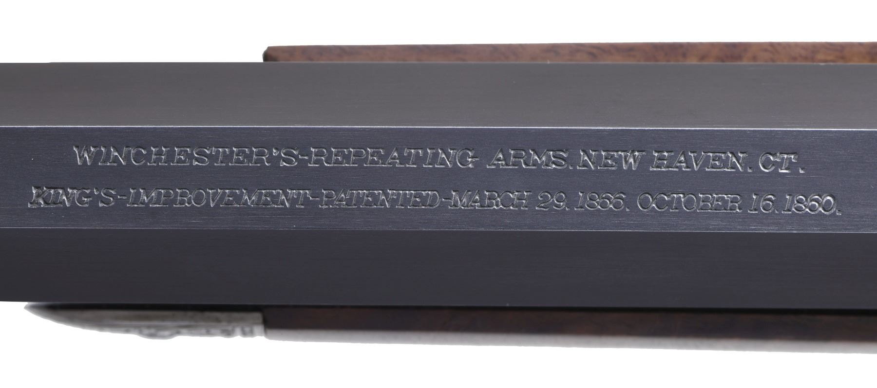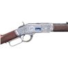 ENGRAVERS OF THE LATE 1800s; WINCHESTER 1873 LEVER ACTION RIFLE BY MASTER ENGRAVER MIKE DUBBER. Please note as of 4/30/25 this item description has been updated. Please revisit this description and contact us with any questions. Cal. 44-40. S# 338450B. Bbl. 24" Octagon. This rifle was awarded "Best Engraved Rifle" at the January 2025 FEGA Convention in Las Vegas, NV. This masterpiece stands alone as the only Winchester 1873 ever to be engraved by noted FEGA Master Engraver Mike Dubber. As noted in accompanying letter, the inspiration for this rifle was none other than L.D. Nimschke's renowned Solid Silver 1866 which was commissioned by President Jose Balta of Peru for presentation to President Mariano Melgarejo of Bolivia in 1868. French grayed action, which was restored to original specifications by Bruce Farman, Riflemaker of Bremertonn, WA, features traditional Nimschke style full coverage hand engraved Germanic scroll set amongst #4 dot punch background. Front right side of receiver bears left facing profile of bestial face which is present on the Silver '66. Left front of receiver is adorned with the Nimschke eagle. In addition to the Nimschke elements of this piece, the Ulrich representation comes in the form of well executed game scenes on both sideplates with right side featuring a walking bear and left side showing a charging bison. Additionally, Ulrich can be found on sides of hammer which display the Ulrich style wolf. Top of receiver transitions from cross hatched punch dots and star bursts into the Germanic scroll terminating at front with emblazoned "1873" Bottom of receiver displays engraver's signature "M DUBBER" in rolling scroll which is nearly identical to the fashion of Nimschke's signature on the bottom of the Silver '66. Case hardened forend cap, buttplate & lever are all engraved with foliate scroll. Brass parts such as bottom of carrier block and trapdoor for cleaning rod are fully engraved. Action engraving has ornate borders throughout. Loading gate, lever latch and all visible screws are a bright and vivid nitre blue with all visible screw heads showing tasteful floral bloom engraving. as stated in letter, barrel is a rust blued replacement with lettering applied by Turnbull Restorations. Barrel has silver bands inlaid at both breech and muzzle end with each flat having either floral scroll, cross hatched star burst, intertwining scroll and sun bursts appearing at muzzle end. Stock set is highly figured English walnut with 32 line per inch checkering, all of which has been done by Turnbull Restorations and finished in hand rubbed oils. Final finishes were applied by Gunsmith John Powers of Duson, LA. UNATTACHED ACCESSORIES: Letter of authenticity from engraver detailing work done to this rifle. CONDITION: all aspects near excellent as professionally rebuilt and expertly customized. (01-26503/BH) ANTIQUE. $17,500-25,000