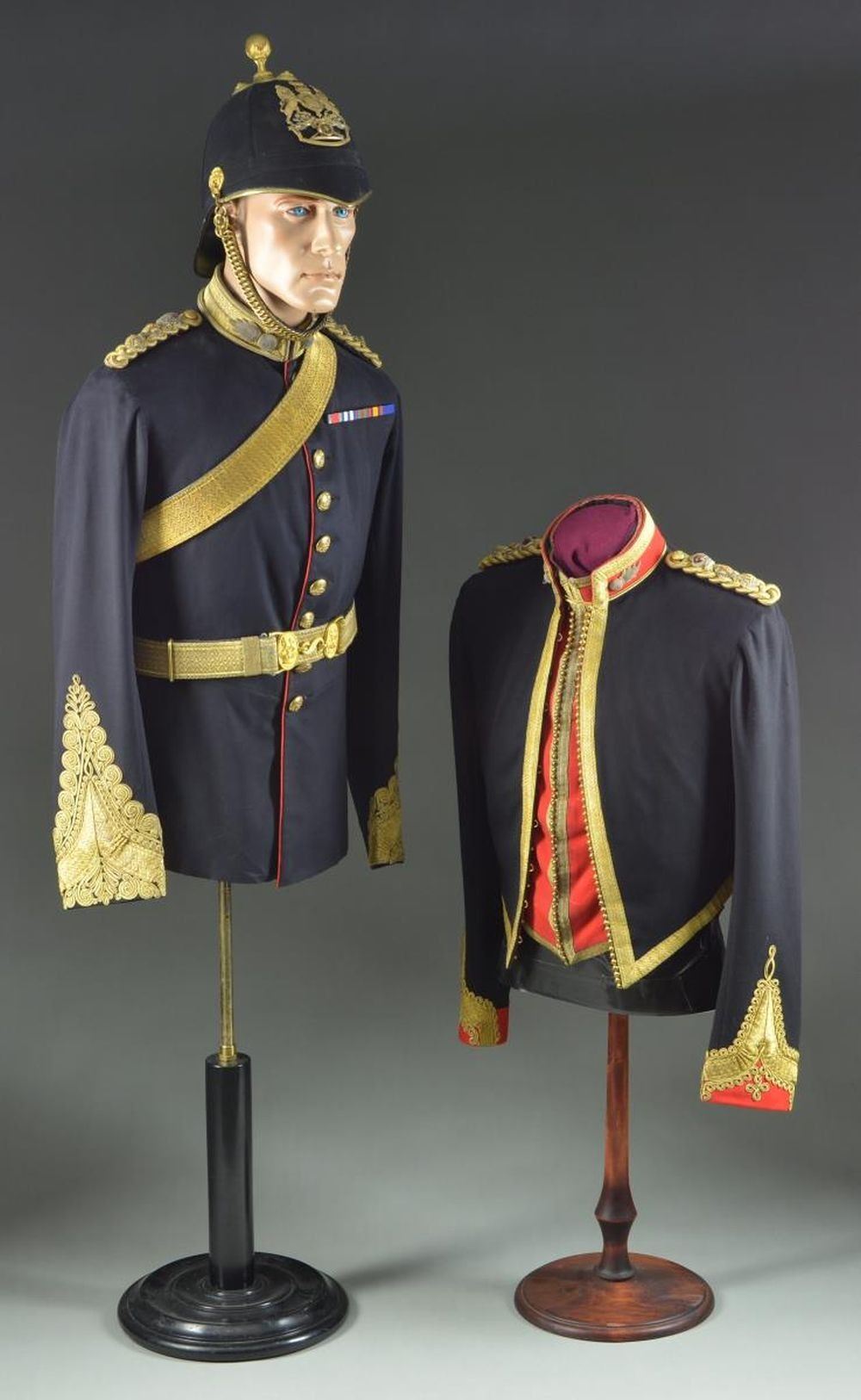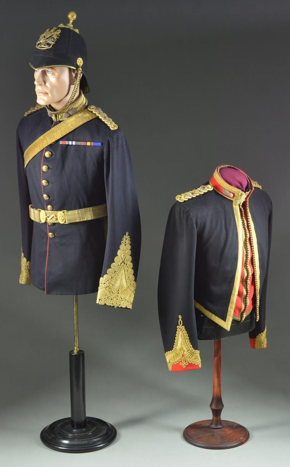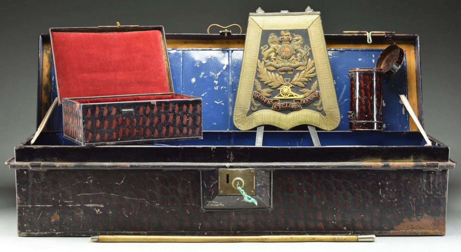 UNIFORM WITH TRIMMINGS, MESS UNIFORM, HELMET & ASSOCIATED TRUNK. This superb group belonged to a Colonel of artillery in the British Army. His dress uniform includes the tunic, belt, cross belt & pouch, helmet & sabretache. His mess dress uniform includes the jacket & vest. Also included is a swagger stick, painted tinned iron trunk, storage box & plume box.