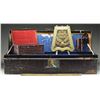 10) TRUNK. A painted iron storage trunk approx. 41" x 12" x 9" high. It is a lockable trunk with heavy duty handles on each end. The trunk is painted black with red hashmarks. The trunk contains a smaller box measuring approx. 12 1/2" x 9 1/2" x 4" high decorated in a similar manner with a red velvet interior for holding medals, insignia & personal items. The trunk also contains a metal plume box measuring 7" in height and 3 1/2" in diameter. It is decorated in the same style as the trunk & the smaller box.