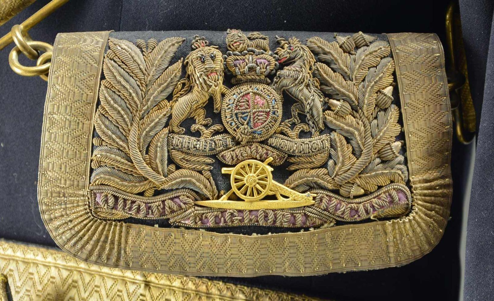 5) CARTRIDGE POUCH. An exceptionally high grade officer’s dress cartridge pouch with an intricate silver & gold bullion Royal Arms on the front. A ribbon below reads “QUO FAS ET GLORIA DUCUNT” in gold bullion with a heavily gilded cannon above. The cross belt is completely faced in gold bullion & features beautifully rendered & heavily gilded belt tip adornments.