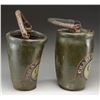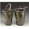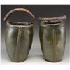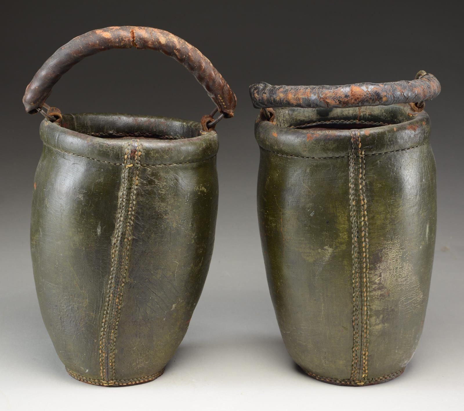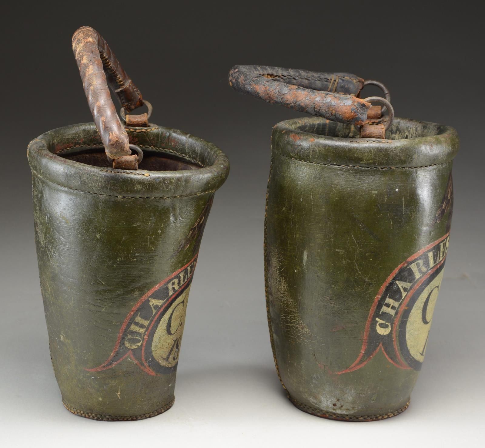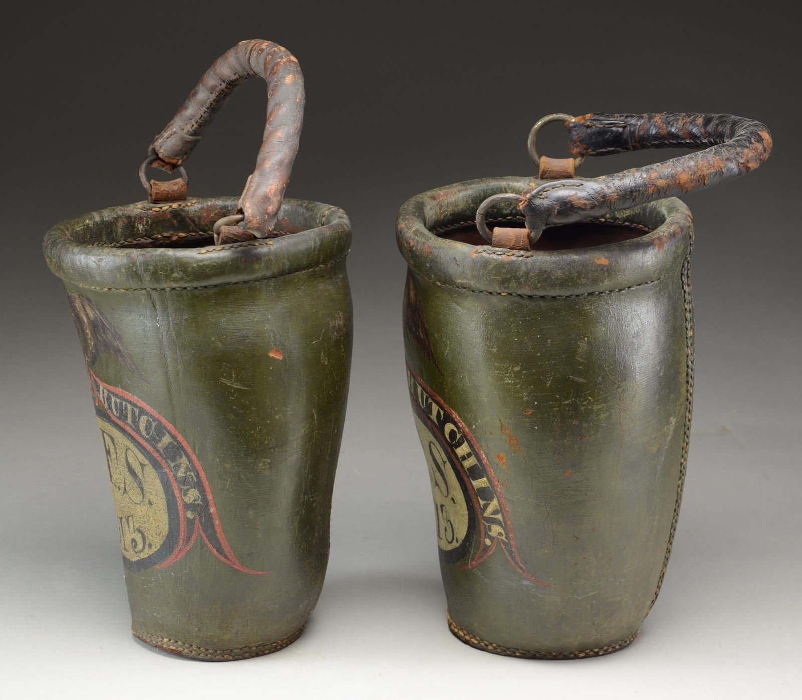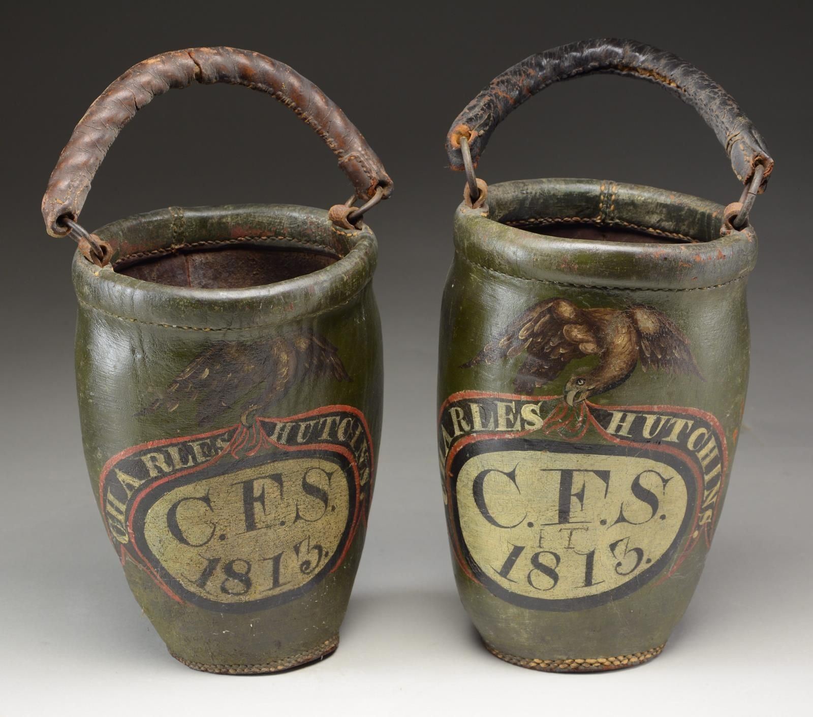 BUCKETS BELONGING TO CHARLES HUTCHINS. These two buckets stand approx. 12” tall and are 7 1/2" in width at the mouth. The bodies of the buckets are painted green with an American eagle at the top, grasping a black, white, and red ribbon in its beak that reads “CHARLES HUTCHINS.” Below the ribbon is a horizontal oval in black and white that reads “C.F.S. 1813.” This likely stands for “C ? FIRE SOCIETY”, and the 1813 date was likely when the society was founded. Each bucket has two rings on the sides with a leather handle for carrying or suspension. CONDITION: the buckets are a bit misshaped, but the painted finish is original and nearly complete. The colors are vivid and attractive. Both handles are connected on one side and separated on the other. An exceptional pair of early American fire buckets worthy of the most advanced Americana collections. (02-21035/BF). $2,400-3,600.