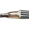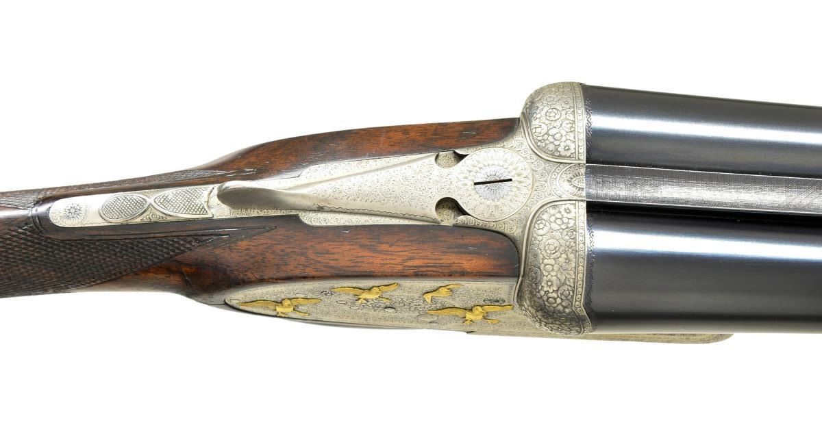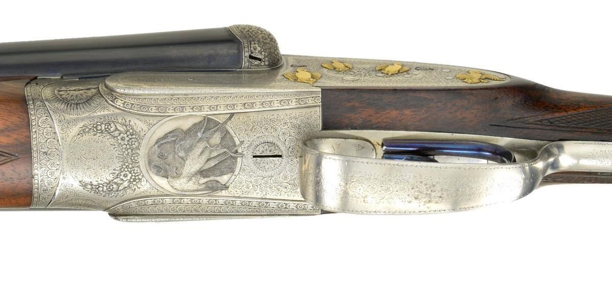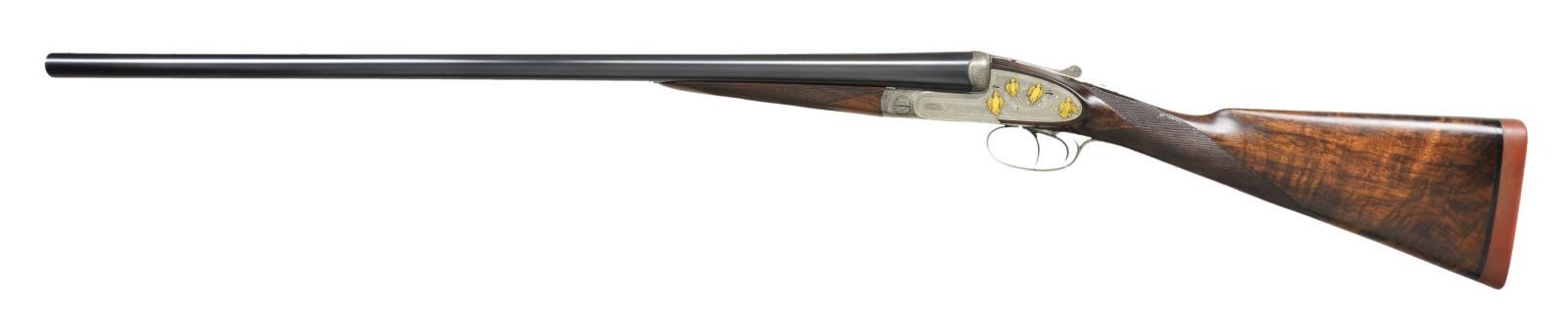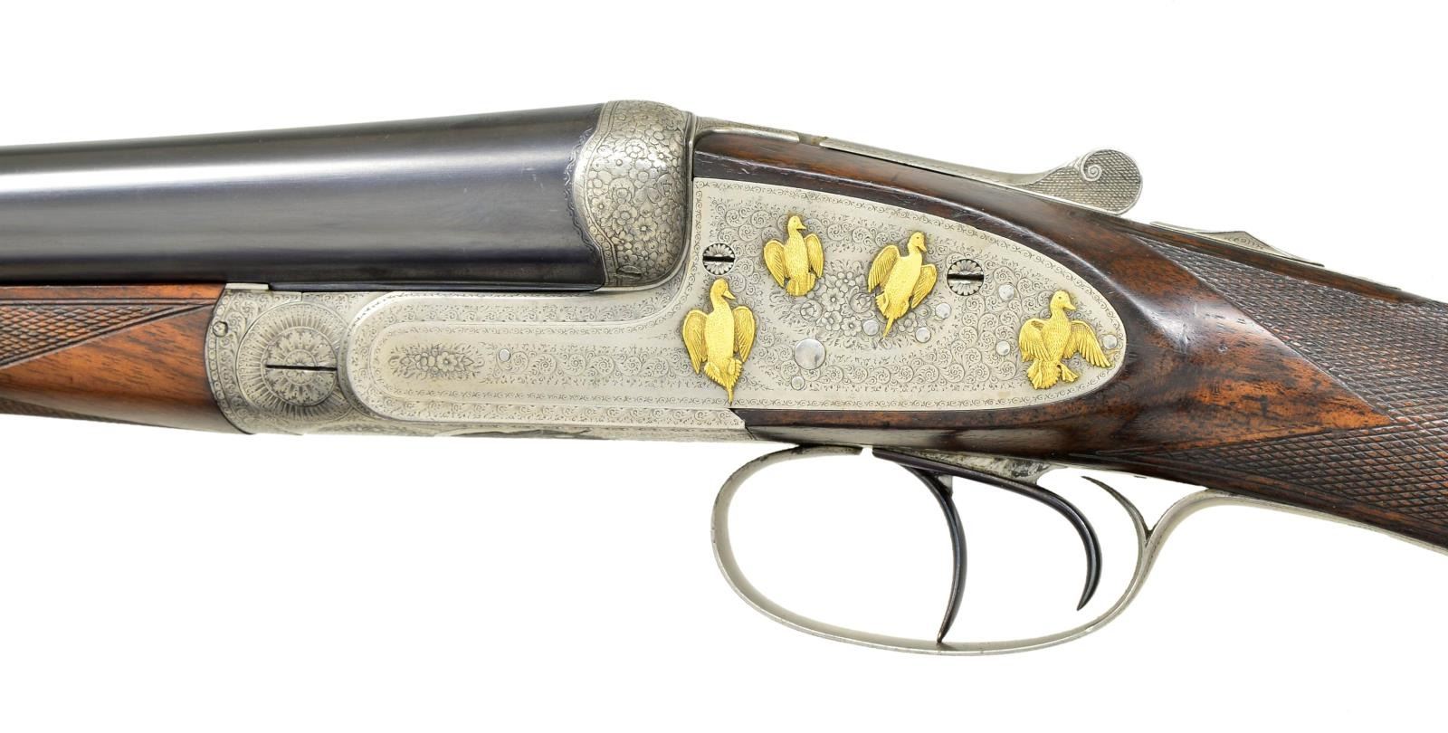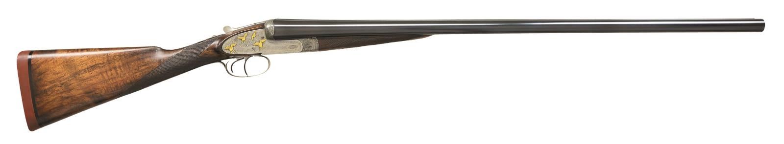Cal. 12 Ga. 2 3/4". S# on bbls. 13496 (on action 2638). The 28 3/8" dovetailed steel bbls. with narrow swamped matted game rib are engraved "Aug-Francotte. Liege" and "Made in Belgium" on the tops. Bbl. flats are stamped with Belgian nitro proofs for 2 3/4" chambers with a crowned "AF". Serial number is on the bottom of the right bbl., and there are also remnants of bore diameters. Flats are not marked "Francotte Choke Bore" or with other markings associated with Francotte-made guns. Coin-finished sidelock action has watertable stamped with the crowned "V" British-type proofs, Belgian nitro proof, the number "2638", "A.J.D.", and "PATENT 587" (A. J. Defourney). Action is stocked to the fences and features automatic safety ("S" inlaid in gold), a hidden third fastener, sideclips, bushed strikers, & double triggers (front articulated). Action is engraved with near-full coverage, very small simple scroll within scroll, and geometric borders. Fences and a crescent on the bottom of action are engraved with a semi-relief multi-floral design. Lockplates are relief gold inlaid with an array of waterfowl. Four pintail ducks are in poses as if either rising from or settling into a body of water on the left lockplate. Right side depicts four mallards as if they were about to land. Bottom of action has a central oval of silver inlaid, depicting a labrador retrieving a duck. This work is of very high quality. Trigger guard has a matching small scroll on the bow & trigger guard tang. Straight-grip buttstock of well-streaked & nicely figured European walnut measures 14 1/4" over a red "Old English" pad. Borderless point pattern checkering is at grip. Small splinter ejector forend has checkering that is much more closely spaced than buttstock and has line borders. MEASUREMENTS: BBLS: Bore Diameter: R .725", L .730". Restriction: R .005" (IC), L .015" (MOD). Min. Wall Thickness: R .031", L .026". STOCK: DAH: 1 3/4"+. DAC: 1 1/2"+. LOP: 14 1/4". CAST: neutral. WEIGHT: 6 lb. 12 oz. CONDITION: very good to fine, as nicely restored. Bbls. retain nearly all of a good-quality reblack. Action cleaned to a coin finish; engraving remains good with some wear; later engraving is clear & sharp. Buttstock retains most of an old oil refinish with some subsequent marks and checkering recut. Pad is relatively new. Replaced forend wood retains most of its original finish; checkering is lightly worn. Bores are bright & shiny, without any visible problems. Action is tight. Bbls. are on the face. Ejectors are slightly out of time. Front trigger jams on the trigger guard bow when pushed into forward position (the bow needs some adjustment). There is a 1/2" stress crack behind the right lockplate. A very attractive, high-grade shotgun. (22-2242/MGM). CURIO. $5,000-6,500.