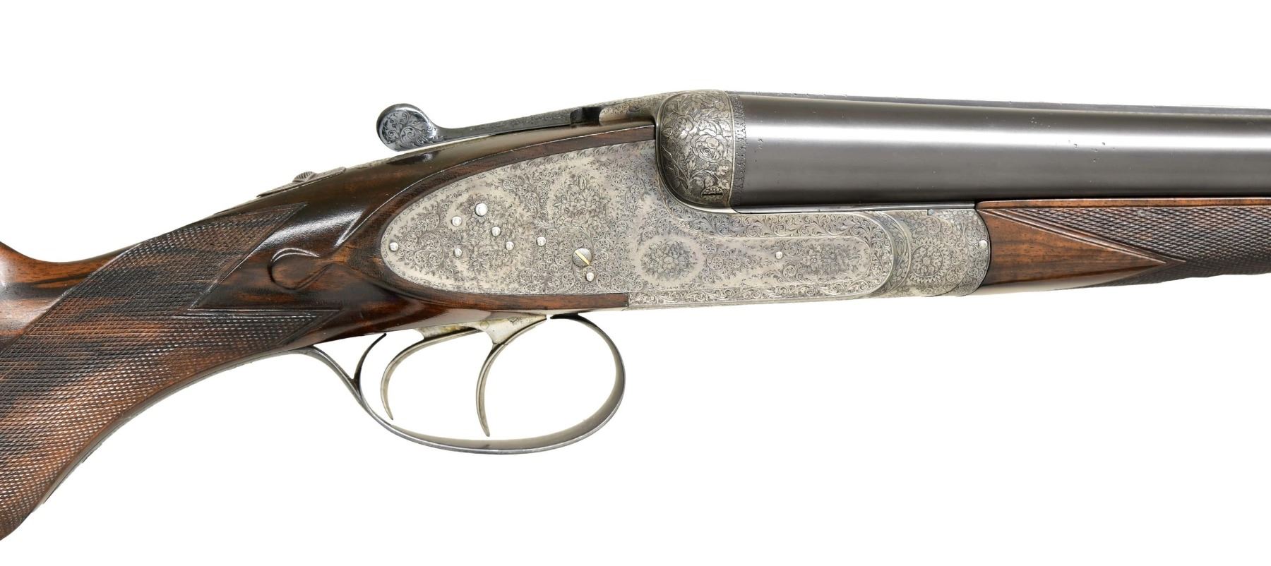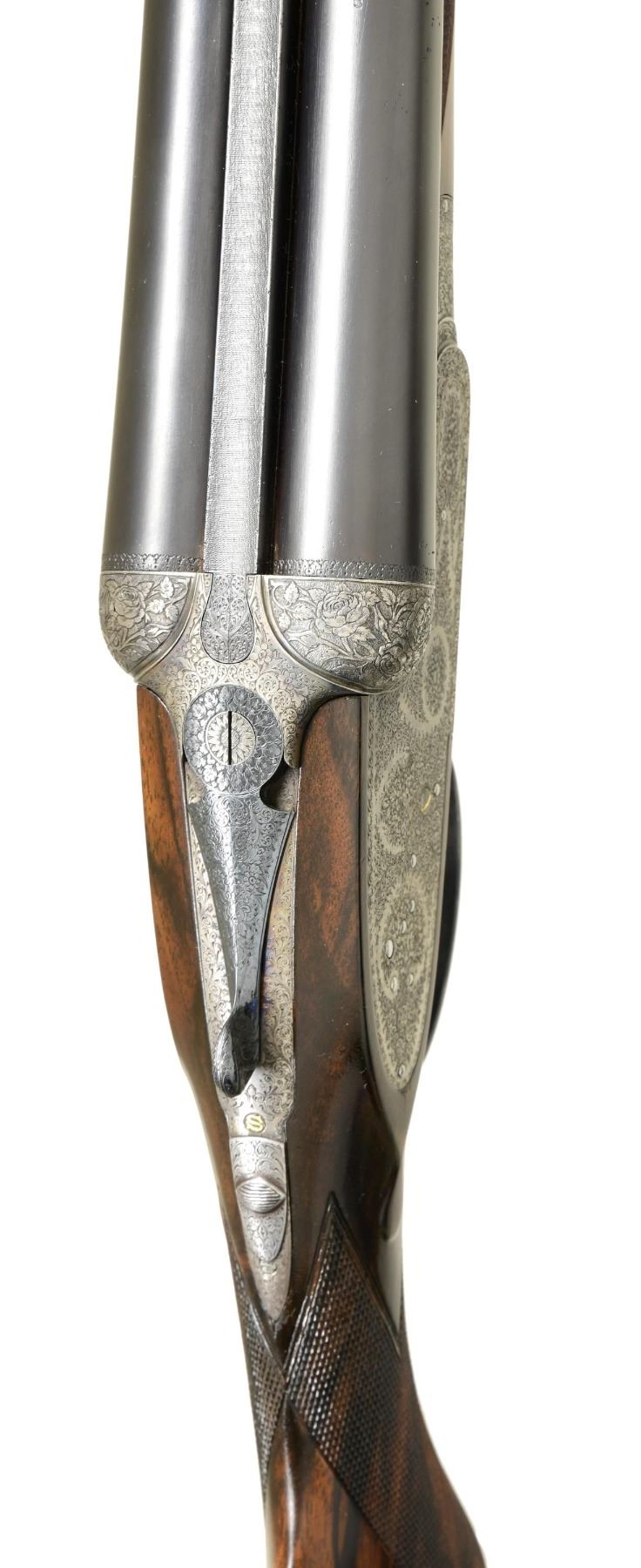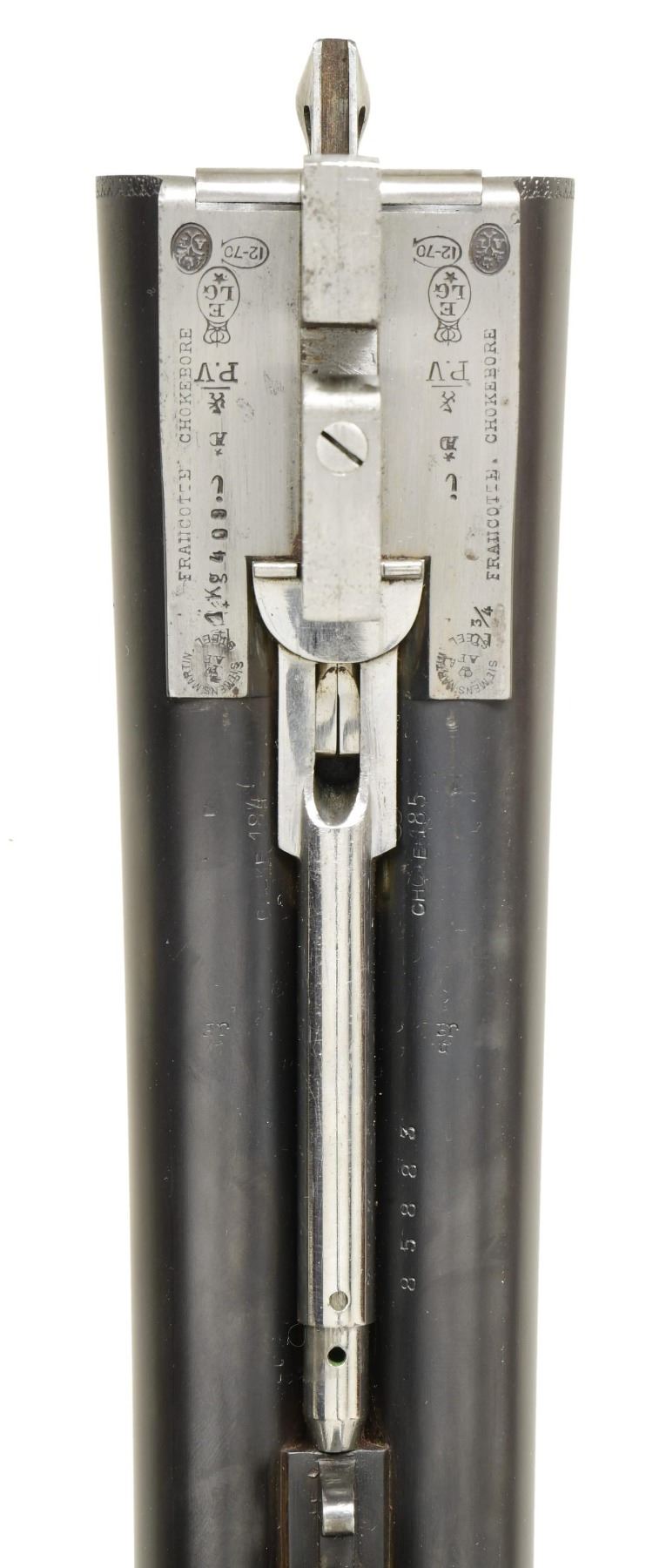 -OPENING DOUBLE TRIGGER HEAVY GAME GUN. Cal. 12 Ga. 2-3/4". S# 85883. Francotte true sidelock guns were quite expensive and can be considered rare. They are exceptionally well built and are avidly sought after today. This example has 30" chopper lump barrels of Siemans Martin steel and are fitted with narrow matted game rib. Tops of barrels are engraved "Von Lengerke & Detmold" "U.S. Agents New - York". Barrel flats are stamped with 1930 Belgian nitro proof for 2-3/4" chambers along with classic "AF" maker's marks "FRANCOTTE CHOKEBORE". Barrels are also fitted with H&H type self opening assist spring. Case hardened full sidelock action is engraved "A. Francotte Maker & Patentee" "Liege Belgium" on watertable. Action features automatic safety ("S" inlaid in gold), cross bolt third fastener which is coupled with dolls head rib extension, bushed strikers and double triggers (front articulated). Action and lockplates are engraved with near full coverage very nicely cut small scroll with rose bouquet highlights. Fences are more deeply cut with roses, stems and leaves in semi-relief. Bottom of action is engraved with patent information. Single beaded trigger guard is engraved with matching rose and scroll and with S# on tang. Round knob buttstock of dramatically marbled and lightly figured European walnut measures 14-5/8" over checkered horn buttplate. Closely spaced point pattern checkering is at grip with drop points and a vacant gold oval is on toeline. Matching splinter ejector forend has Anson release. MEASUREMENTS: BBLS: Bore Diameter: L .724. R .725. Restriction: L .032 (Full). R .021 (Mod). Wall thickness: L .031. R .029. STOCK: DAH: 2-3/8". DAC: 1-1/2"+. CAST: neutral. LOP: 14-5/8". WEIGHT: 7 lb. 3 oz. CONDITION: fine as partially refinished. Barrels retaining nearly all of a good quality re-black. Rib matting somewhat softened. Action and lockplates retain at least 50% of their original muted case hardening color with hand worn silver accents on beads and fences. Top lever and trigger guard retain nearly all of their shiny charcoal re-blue. Stocks retain nearly all of a shiny refinish, checkering competently re-cut. Bores are bright and shiny and without any noticeable defects. Ejectors are strong and in time. (24-3927/MGM). CURIO. $5,000-7,000.