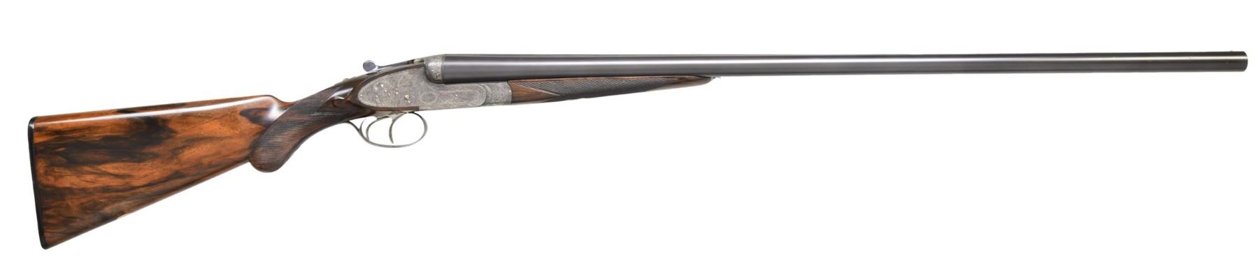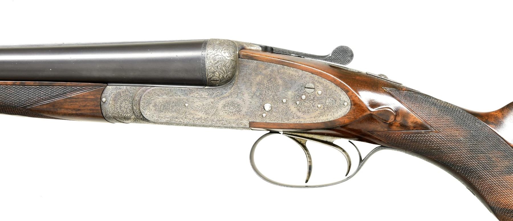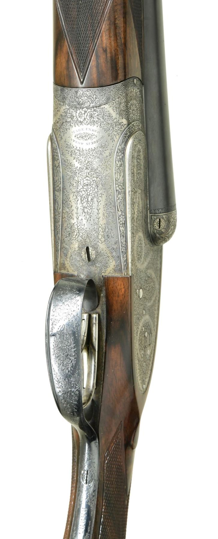 -OPENING DOUBLE TRIGGER HEAVY GAME GUN. Cal. 12 Ga. 2-3/4". S# 85883. Francotte true sidelock guns were quite expensive and can be considered rare. They are exceptionally well built and are avidly sought after today. This example has 30" chopper lump barrels of Siemans Martin steel and are fitted with narrow matted game rib. Tops of barrels are engraved "Von Lengerke & Detmold" "U.S. Agents New - York". Barrel flats are stamped with 1930 Belgian nitro proof for 2-3/4" chambers along with classic "AF" maker's marks "FRANCOTTE CHOKEBORE". Barrels are also fitted with H&H type self opening assist spring. Case hardened full sidelock action is engraved "A. Francotte Maker & Patentee" "Liege Belgium" on watertable. Action features automatic safety ("S" inlaid in gold), cross bolt third fastener which is coupled with dolls head rib extension, bushed strikers and double triggers (front articulated). Action and lockplates are engraved with near full coverage very nicely cut small scroll with rose bouquet highlights. Fences are more deeply cut with roses, stems and leaves in semi-relief. Bottom of action is engraved with patent information. Single beaded trigger guard is engraved with matching rose and scroll and with S# on tang. Round knob buttstock of dramatically marbled and lightly figured European walnut measures 14-5/8" over checkered horn buttplate. Closely spaced point pattern checkering is at grip with drop points and a vacant gold oval is on toeline. Matching splinter ejector forend has Anson release. MEASUREMENTS: BBLS: Bore Diameter: L .724. R .725. Restriction: L .032 (Full). R .021 (Mod). Wall thickness: L .031. R .029. STOCK: DAH: 2-3/8". DAC: 1-1/2"+. CAST: neutral. LOP: 14-5/8". WEIGHT: 7 lb. 3 oz. CONDITION: fine as partially refinished. Barrels retaining nearly all of a good quality re-black. Rib matting somewhat softened. Action and lockplates retain at least 50% of their original muted case hardening color with hand worn silver accents on beads and fences. Top lever and trigger guard retain nearly all of their shiny charcoal re-blue. Stocks retain nearly all of a shiny refinish, checkering competently re-cut. Bores are bright and shiny and without any noticeable defects. Ejectors are strong and in time. (24-3927/MGM). CURIO. $5,000-7,000.