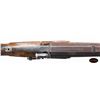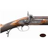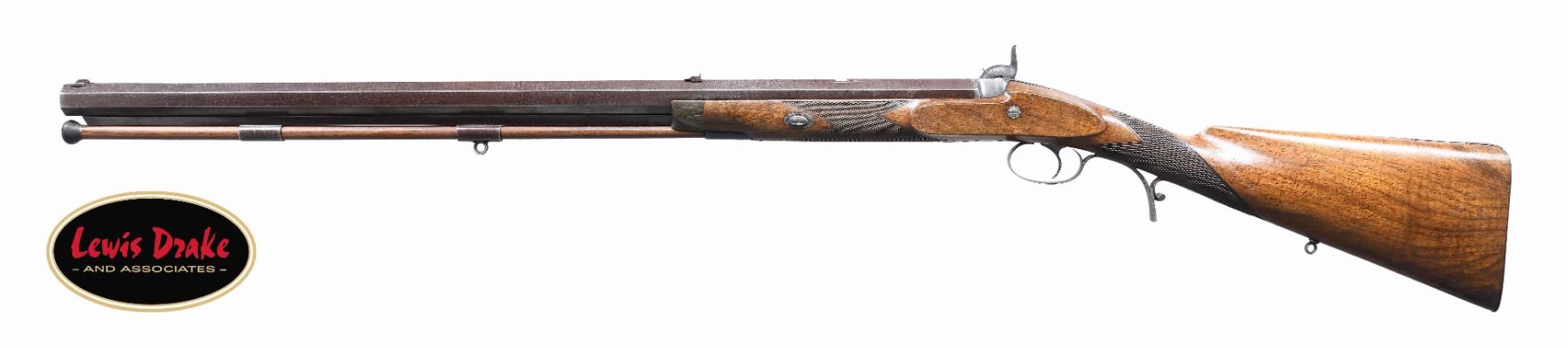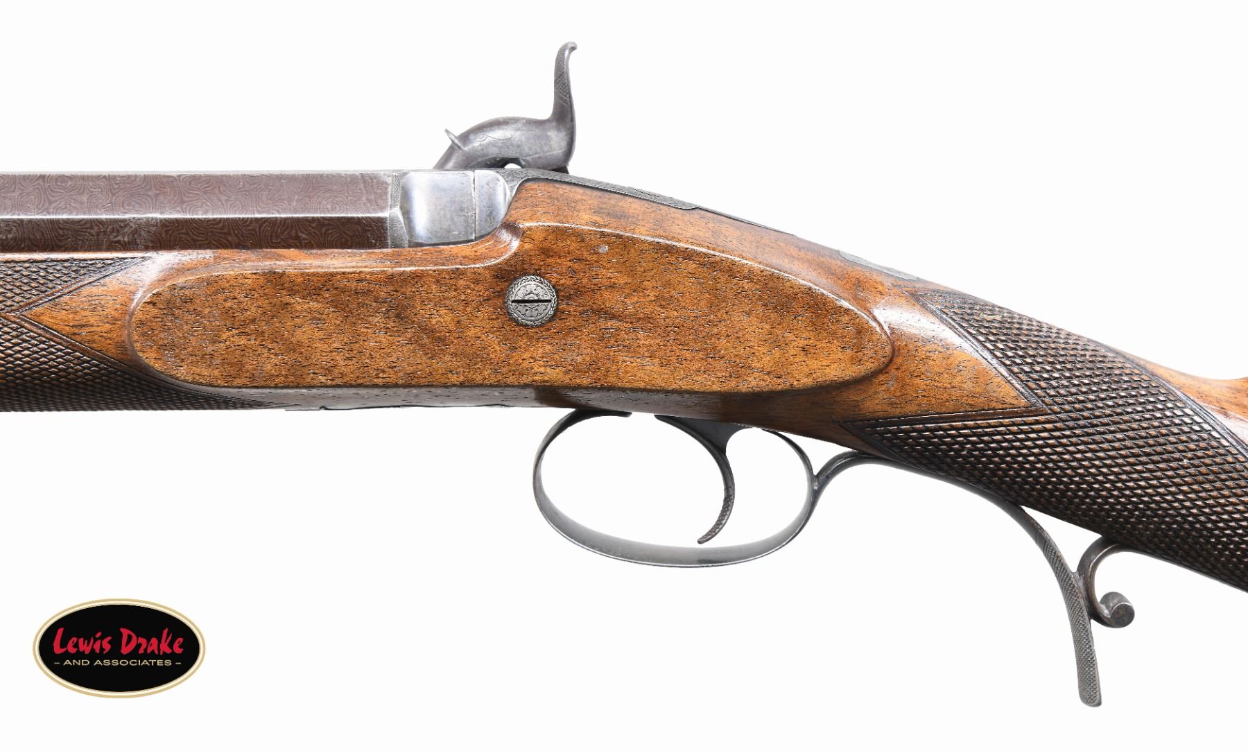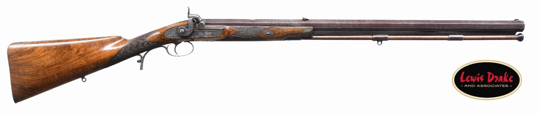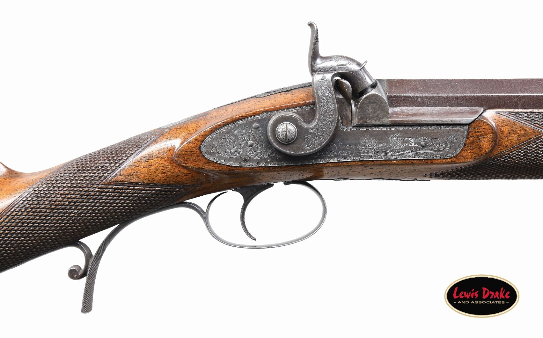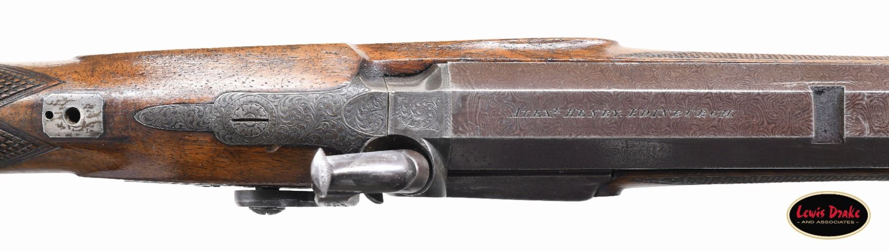 SPORTING RIFLE. Cal. 55. S# 314 (1859). Factory records indicate that this is a second quality single shot rifle with two groove rifling. In fact this barrel's rifling is multi- groove, but obviously original! Octagon damascus barrel measures 29" and is fitted with one standing and three nested leaf folding rear sight which appears to have been moved 4" closer to muzzle. Front sight is a rather modern sourdough type. Top flat is engraved "Alex.r Henry. Edinburgh". Barrel is fitted with an under rib and has London black powder proofs on bottom flat along with S#, "A.H." and caliber "33" bore. Breech plug with scroll engraving on top flat is unvented. Front spring lock without safety has flat faced serpentine hammer. It and case hardened breech iron are scroll engraved. "Alex.r Henry" is in front of running stag scene. Trigger plate has pineapple finial. Trigger guard, engraved with hounds chasing a stag on bow, has S# behind bow and extends to a spur forming grip. European walnut stock with some fiddle figure has horn tip and measures 14-3/8" over steel buttplate with long top tang engraved with scroll and deer scene. Walnut ramrod with horn tip and brass tail (worm under cap) mounts through two plain pipes and well filed thimble. Stock attaches to barrel with side bolt through steel escutcheons and is checkered at grip and forend. A silver rectangle at top of grip is pierced and threaded for a lollipop type tang sight. CONDITION: very good to fine. Barrel retaining over 60% original brown with good definition to pattern. Over 30% case hardening color remains on lock, breech iron and trigger plate. Traces of re-blue remain on buttplate and trigger guard. Stock shows some oil rubbed in over what appears to be original finish and has a fair number of marks and scratches. Bore is bright, sharp and shiny with one or two minor small pits toward muzzle. Locks is crisp. Original rear sight dovetail has not been filled. PROVENANCE: from the renowned collection of quality sporting arms from Lewis Drake together with inventory of Lewis Drake Associates. (01-26117/MGM). ANTIQUE. $3,000-6,000.