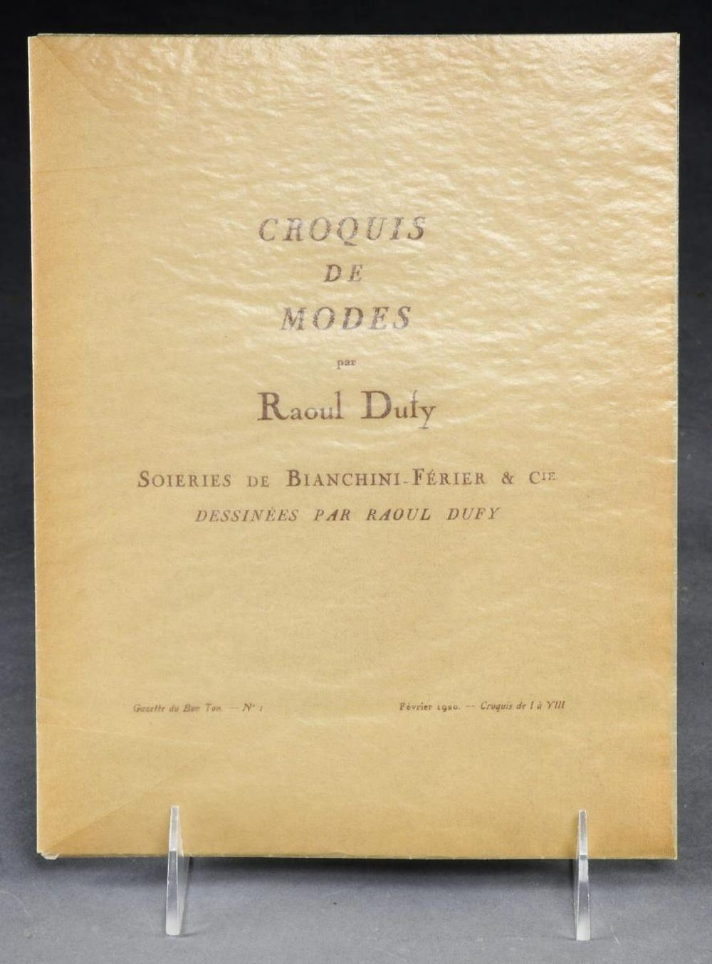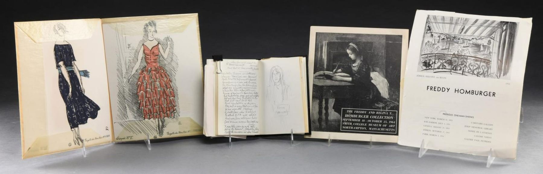 HOMBURGER, REGINA HOMBURGER, AND RAOUL DUFY. 2nd, 3rd quarter 20th century. This lot was purchased from a member of the Homburger family who explained Homburger and Dufy were friends. Two pencil and watercolor sample drawings from the Croquis Collection of fashion art titled "Croquis De Modes par Raoul Dufy" for Soieries de Bianchini-Ferier & Co", designs by Raoul Dufy, together with a brochure for a one man art show of Freddy Homburger, a calling card for Eric Homburger with a note to Freddy, a note from F. Homburger regarding an appointment or ball in January of 1977, and a small poster board announcing the collection of Freddy and Regina T. Homburger at Smith College Musuem of Art, September 18 to October 25, 1964. Accompanied by a sketch book of Fred Humburger with a self portrait dated May 19, 1981, followed by pages of notes sketches. CONDITION: all items are very good. (05-321/TG). $4,000-6,000.