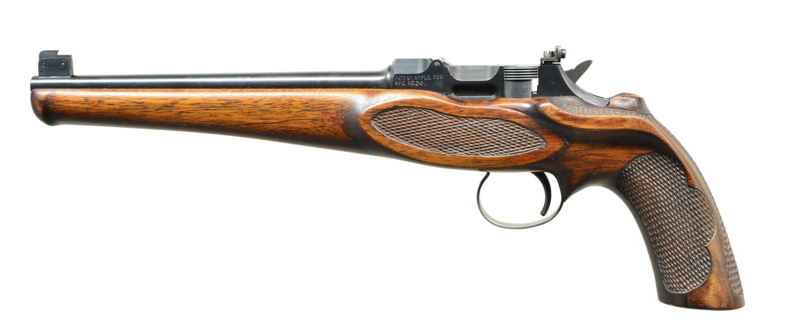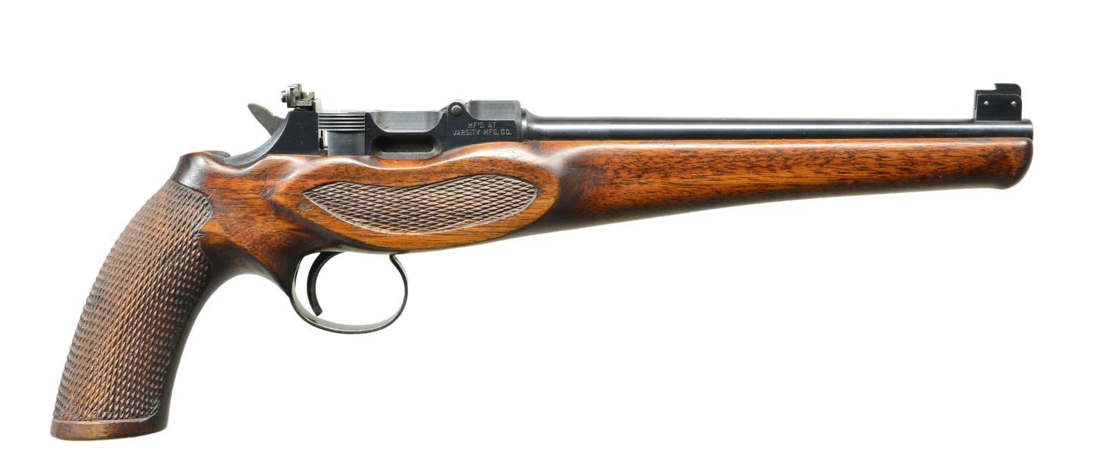 Cal. 22 LR. S# 36. Bbl. 8" rnd. w/ pinned blade patridge front sight & square notch adj. target rear sight. Approx. 200 of these high quality pistols were mfg. 1947-1953. Trapdoor style action. Breechblock is hinged at front & swings up & forward for loading. Full length Roper walnut stock featuring schnabel tip, thumbrest for right hand shooter & borderless hand checkering on ears, wrist & backstrap. Top action flat is marked "A.H. TOMKINS / SPRINGFIELD / MASS., U.S.A." Left flat is marked "PATENT APPLD. FOR / MFG. NO. 36." Right flat is marked "MF'D. AT / VARSITY MFG. CO." CONDITION: very fine retaining over 97% original blue. Original stock finish shows a few sm. handling marks. Bright near excellent bore. (21-4446/DS). CURIO. $2,500-3,000.
