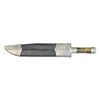 This fine Kalfayan made knife measures 18 3/8” overall with a 12 1/2" blade. The blade was finely engraved by Fred Harrington with flourishes & a foliate motif over approx. 10” of its length. The engraving on one side incorporates the name “Kalfayan” in the center of the etching. The blade has a 9” false edge along the top. There’s a small cloverleaf cutout of the edge near the ricasso. The cross guard, ferrule & pommel also have a beautifully engraved finish with silver & gold inlays. The 2-piece grip is of mastodon tusk and is secured by 2 pins on each side. The sheath is black leather covered wood with large silver mounts & a silver frog stud. CONDITION: the blade is stunning with original factory polish. The hilt shows little or no wear. The sheath shows primarily storage wear with a few tiny dents at the tip. (02-17999/BF). $4,000-6,000.