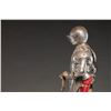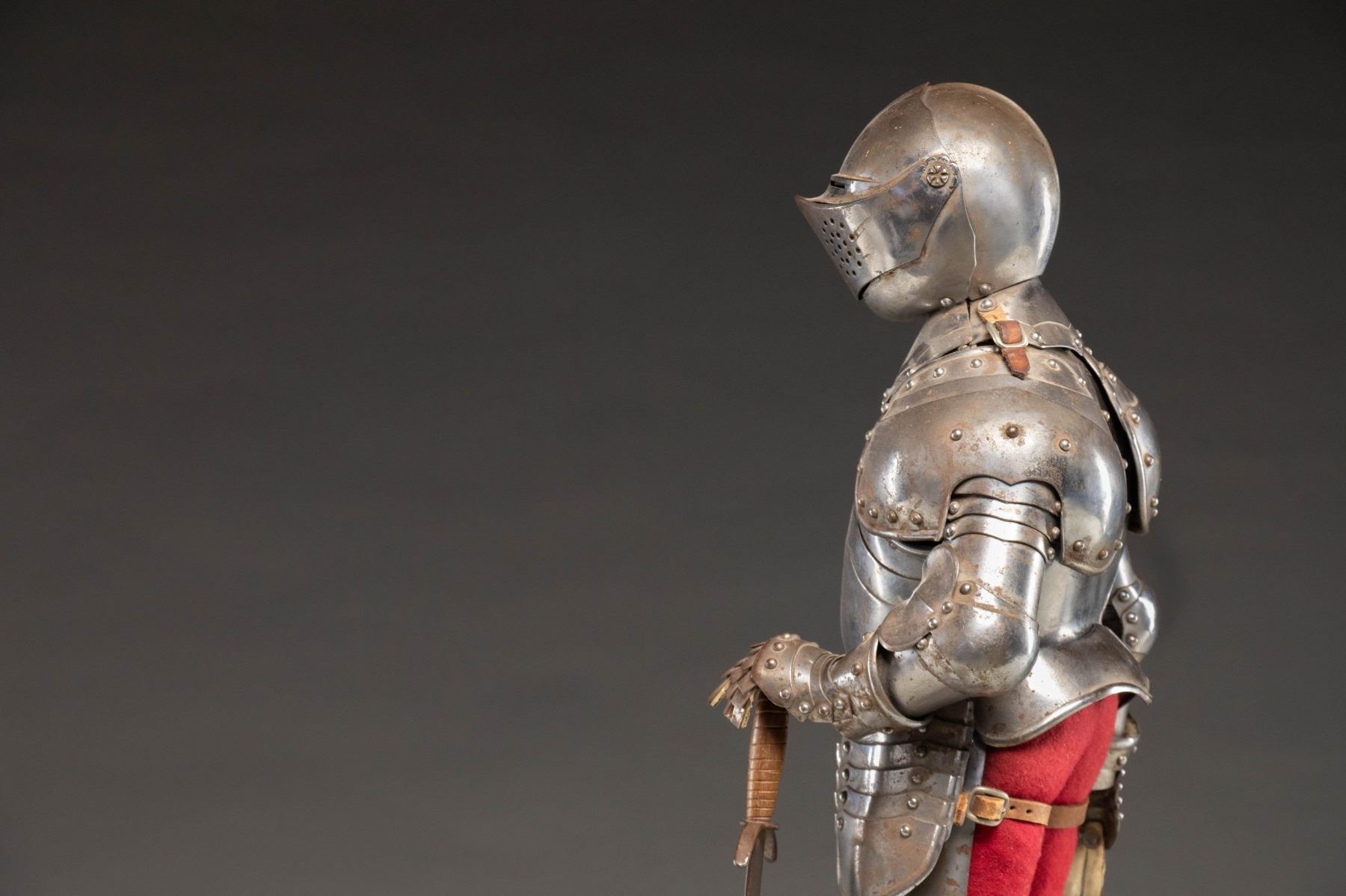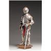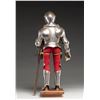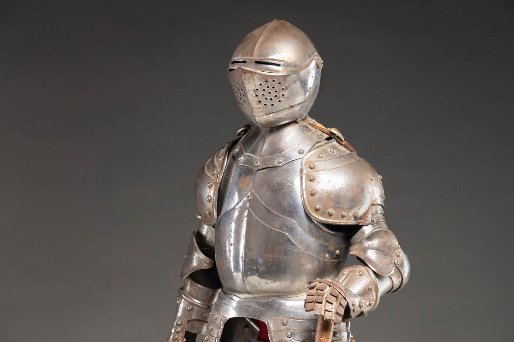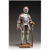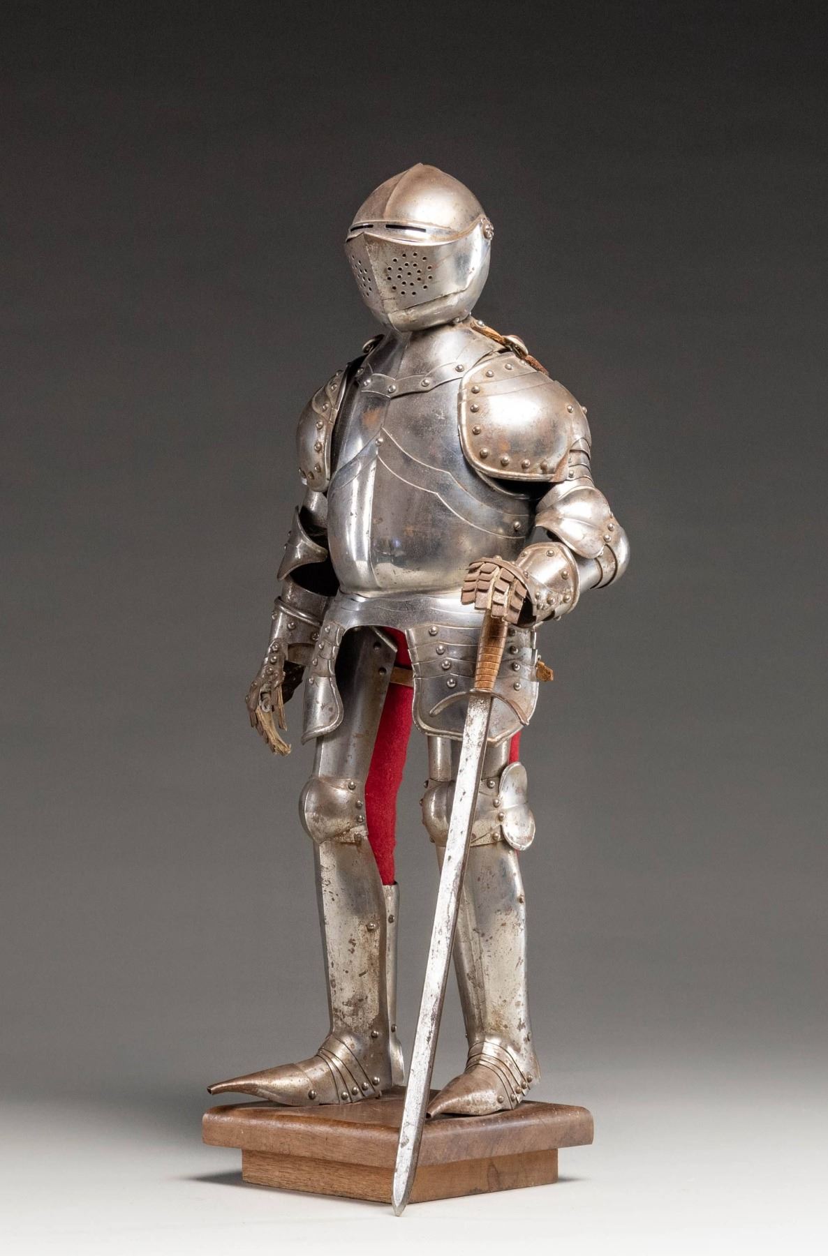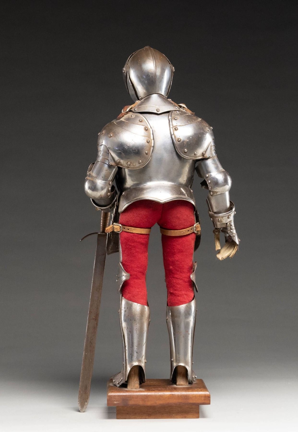 This armor measures approx 24" in height and is set on a 2" wooden stand. It has a closed helmet with fully articulated hinged and riveted joints and is made virtually exactly like a full size set of armor in 1/3 scale. The armor is complete with leg and arm protection as well as articulated gauntlets. There is a sword included of the correct scale to display with this exceptionally well made armor. CONDITION: armor generally has a light gray patina with some scattered oxidized areas. All hinges appear to function and plates seem to move freely. PROVENANCE: Estate Collection of Nicholas Apergis. (02-24805/BF). NON-GUN. $800-1,600.
