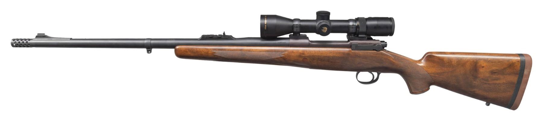 Cal. 416 Hoffman. S# 486470. Bbl. 24 3/4". Hannibal bolt action rifle chambered in .416 Hoffman mfg. from a U.S. Model 1917 action by A-Square. Left side of the bbl. is marked "416 HOFFMAN", with "A-SQUARE/ MADE IN USA" marked on the right. Left receiver wall exhibits a partially visible U.S. flaming ordnance bomb proof. Metal components exhibit a dull/matte gray finish overall. 1-piece plain wood brown epoxy bedded stock features checkered panels at the forearm and wrist, a checkered steel grip cap, as well as a textured red rubber Decelerator recoil pad. Ramped brass beaded blade front sight with 3-leaf Express rear sight graduated "100" (fixed), "200" (folding), and "300" (folding). Receiver is drilled and tapped with a Nikon Monarch UCC 1.5-6x42mm scope. Bbl. features an integral radial ported muzzle brake, banded sling swivel, as well as a flat lug (stock inletted to accommodate lug). Receiver features an integral mag. well with a Timney trigger. UNATTACHED ACCESSORIES: 1995 dated A-Square brochure. CONDITION: fine, with metal components retaining virtually all of their original A-Square applied finish overall, exhibiting few light superficial handling marks, with some spots of light pitting and/or porosity present beneath the finish on surplus parts (bolt, bolt stop housing, forward tang of trigger guard). Brilliant mirror bore, exhibiting some apparent hardened grease and/or firing residue, while retaining well defined rifling throughout. Proper manual mechanics. Stock exhibits a few scattered superficial marks and small impressions, but otherwise remains very good overall and presents nicely. Scope retains a clear and sharp optic. PROVENANCE: From the Buckstix Collection. (25-6477/MLW). MODERN. $3,000-4,500.