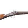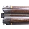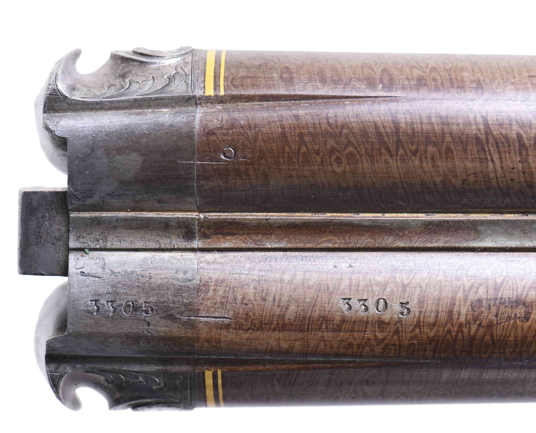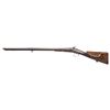 Cal. tight 12 bore. S# 3305. The beautifully patterned 32" laminated steel barrels are gold inlaid "A.V. Lebeda v Praze" on flat top rib between gold inlaid scrolls. Breech plugs with vented platinum blow outs are nicely scroll engraved and the relief scene of a nesting duck is on rib extension. Breech iron has very long tang and is scroll engraved surrounding scene of a standing bunny. Back spring locks having fancy outlined plates are also engraved with exceptional scrolling acanthus which extends to flat faced hammers. Lockplate tails are relief engraved with game scenes with a setter and huddling covey of quail on left plate; a hound chasing a roebuck is on right. Front of right lock is engraved "Lebeda"; left "in Prag". Trigger plate is engraved with matching scroll which also appears on nicely filed trigger guard with face of kitty on bow; S# on tang. Nicely marbled and stump figured European walnut straight grip stock measures 14" over scroll engraved steel buttplate with fox at base of long top tang. In place of checkering nicely carved scroll and lines of leaves are at grip and around forend. Stock also features large swept right hand cheekpiece and broad sling loop. Stock attaches to barrel with captive sidebolt through shaped and engraved steel escutcheons. Old hickory ramrod with brass tip and tail (worm under cap) mounts through two plain pipes and thimble matching trigger plate. Rear pipe is fitted with sling loop. MEASUREMENTS: BBLS: Bore Diameter: L .702. R .700. Restriction: L .000 (cyl). R .000 (cyl). Wall thickness: L .050. R .050. STOCK: DAH: 1-7/8". DAC: 1-7/8". CAST: about 1/2" off. LOP: 14". WEIGHT: 8 lb. 7 oz. CONDITION: good as lightly refinished. Barrels retaining most of a well done re-brown, other metal cleaned to coin finish; engraving remains sharp. Stock shows old oil refinish over some marks and a few subsequent marks. Carving shows light wear. Bores are good; show some pitting toward muzzles. Locks are good. An attractive gun by a famous maker. (01-26473/MGM). ANTIQUE. $3,000-4,000.