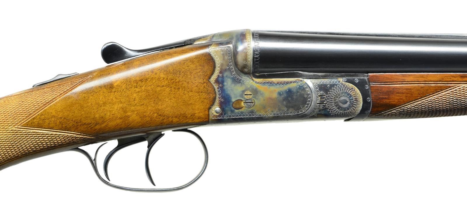 Cal. 20 ga., 2 3/4". S# 4314. Delightful upland gun mfg. in Italy by Zoli & F.lli Rizzini for Abercrombi & Fitch. Bbls. 26" with fixed IC and Mod chokes. Brass bead. Scalloped case colored boxlock action with sunburst and border engraving. Double triggers. Extractors. Splinter forearm and round knob walnut stock with hand checkering having brass nameplate at wrist. LOP: 14 1/2" over original buttplate. Weight: 5 lbs., 14.2 oz. UNATTACHED ACCESSORIES: 2 Azoom snap caps. CONDITION: near excellent retaining over 98% wood and metal finish. Bright near excellent bores. (22-3882/DS). MODERN. $1,500-2,500.