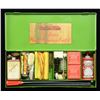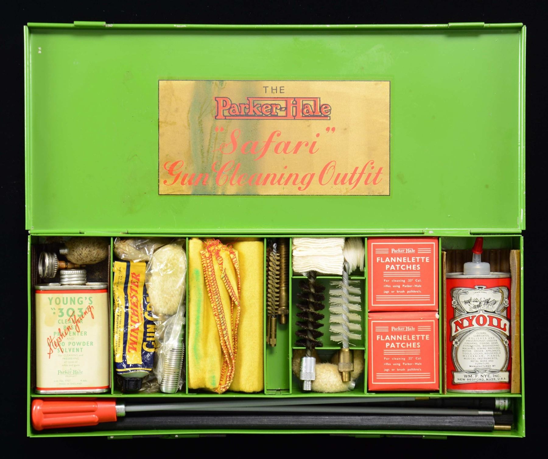 GUN CLEANING OUTFIT. Parker Hale "Safari" Gun Cleaning Outfit retailed by Abercombie & Fitch. Metal case exhibits a green painted finish, with the exterior of the lid exhibiting an Abercombie & Fitch label. Interior of lid is marked with a label that reads "THE/ Parker-Hale/ "Safari"/ Gun Cleaning Outfit". Case contains cleaning rods, oils, solvent, bore brushes, patches, etc. CONDITION: exterior of case exhibits some loses to its green painted finish, showing marks from handling and storage, as well as some spots of flaking. Interior and interior items are very good overall. (02-23125/MLW). $75-150.