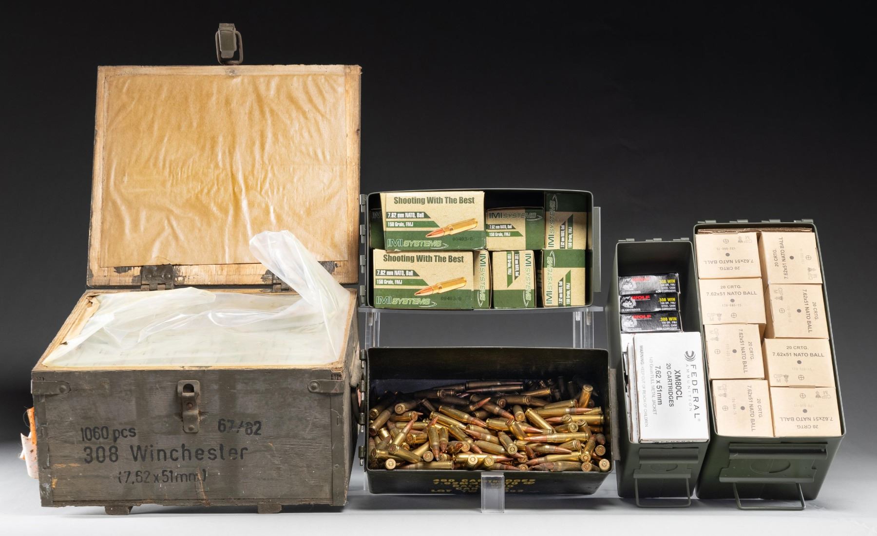 All good, clean serviceable ammo. Most is boxed, but one partial can of loose Nato ammo. Includes wooden crate, 3 GI style 50 cal. cans plus 1 of 30 cal. 308 WINCHESTER AMMO: 1 wooden crate of 1,060 rounds having caliber marking on crate in English. Packed in 20 round boxes. Headstamps are "308W 82". / 6 boxes having 20 rounds each of Wolf with 150 grain bullets. Non-Corrosive, boxer primed and steel cases; made in Russia. / 7.62 NATO AMMO: 10 boxes having 50 rounds each of IMI with 150 grain bullets. / 32 boxes having 20 rounds each of Lithuanian ammo with "GGG 15" headstamps plus "CIP/M" on boxes. Especially fresh and bright appearing. / 5 boxes having 20 rounds each of Federal XM80CL with 150 grain bullets. / 1/2 can (50 cal.) of mixed military ammo that seems to be mostly US Military; includes some orange tipped tracers (estimated to be 200+ rounds). (02-25177-18/NW). AMMO. $800-1,200.
