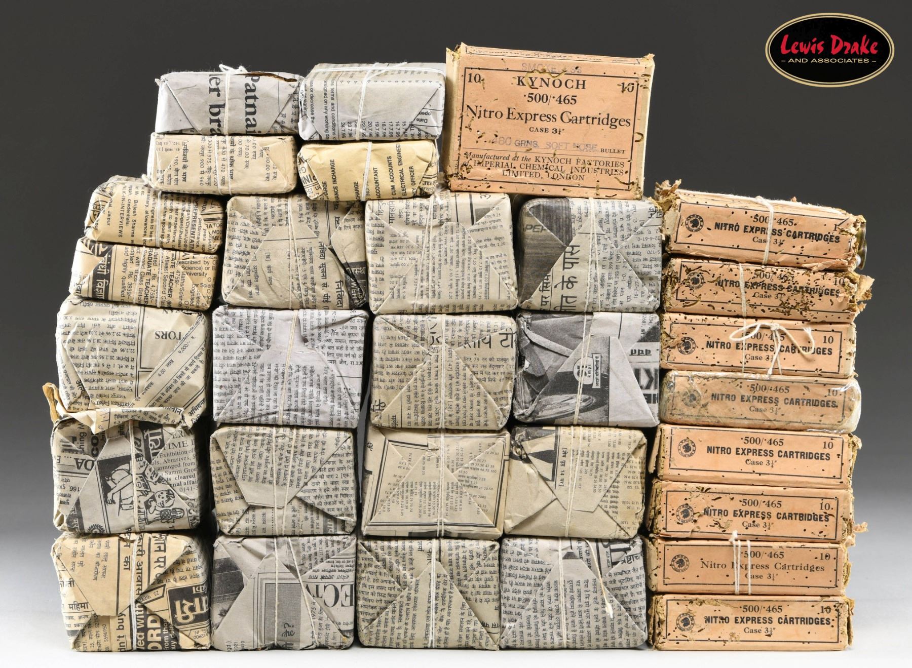 This lot consists of about 500 Rds. of 500/465 Nitro Express ammo. Some ammo is of vintage Kynoch mfr. Other ammo is wrapped in foreign newspaper & is of unknown mfr. CONDITION: wrappers & boxes show varying degrees of insect damage, flaking & wear. Ammo shows varying degrees of tarnishing & oxidation. PROVENANCE: from the renowned collection of quality sporting arms from Lewis Drake together with inventory of Lewis Drake Associates. (02-23571-19/MJC). $2000-3000 for lot.