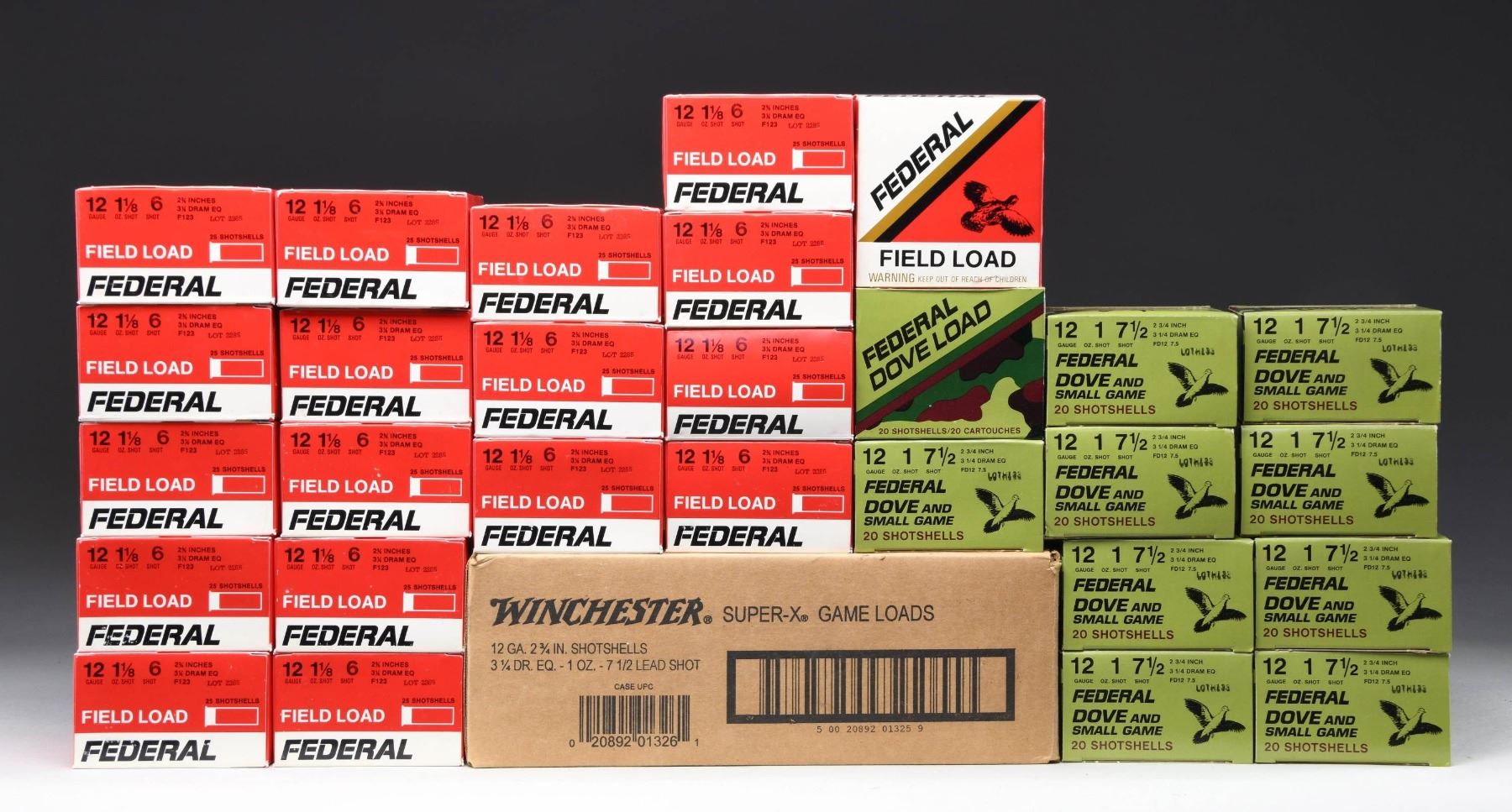 This lot consists of the following 12 Ga. shotshells: 1) 250 rd. case of Winchester Super-x Game Loads 2 3/4 #7 1/2 ammo. 2) 200 rd. case of Federal 2/34" #7 1/2 shot small game ammo. 3) 450 rd. case of Federal 2 3/4" #6 shot field load ammo. CONDITION: all ammo rates very good or better. (02-23229-58/MJC). $200-400 for lot.