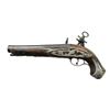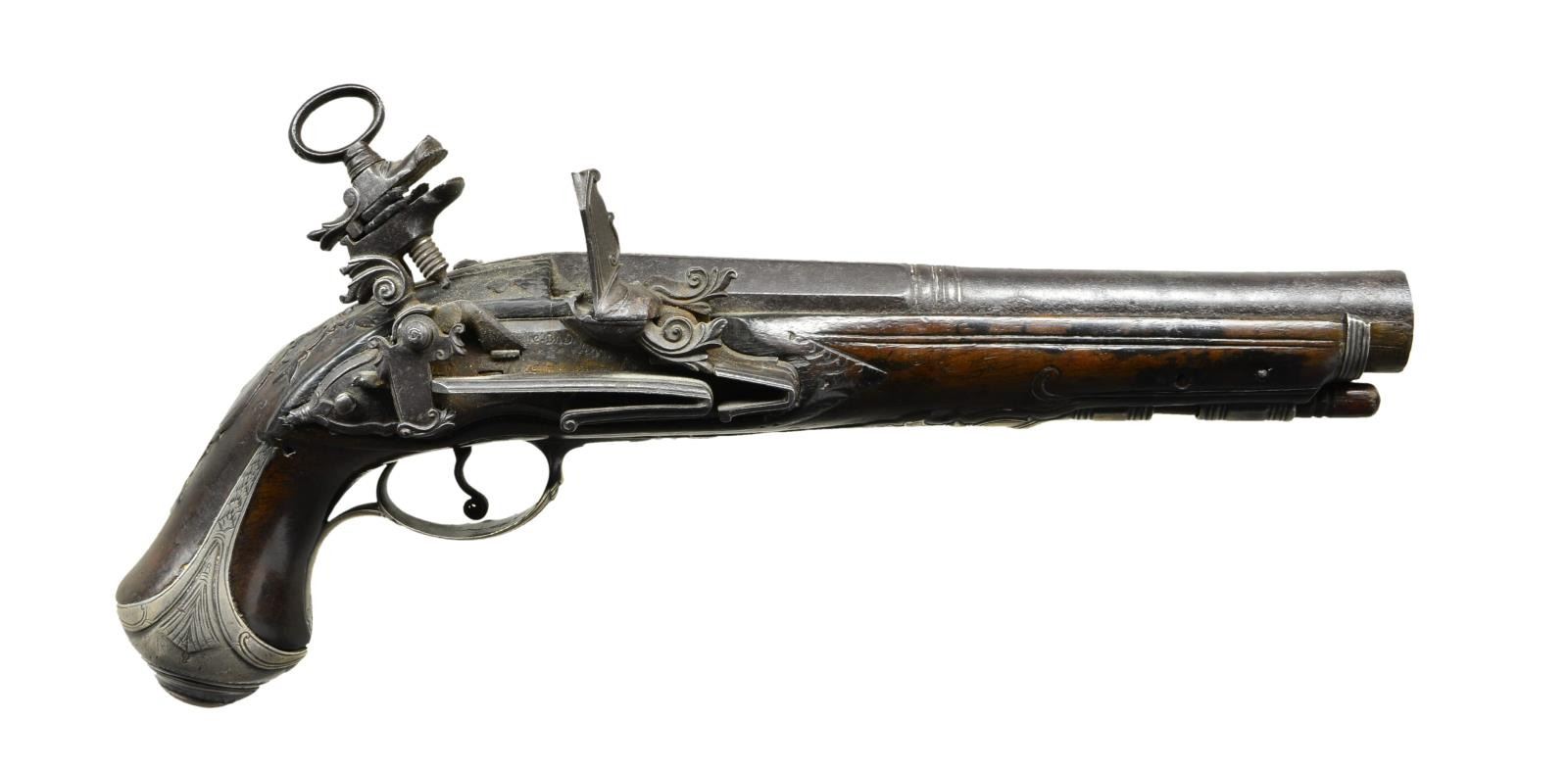 MIQUELET PISTOL. Cal. 62. NSN. Bbl. 7 1/2” w/ transition to octagon shank. Top flat has 3 proofs & a sunken mark of the Royal Arsenal of Naples. Miquelet lock is marked w/ markers name “Achille Badalaro”. Curled trigger. Pin fastened stock w/ ornate relief carving around top tang & forearm areas w/ incise carved double lines along bbl. & ramrod channels. Lock & ear have moldered borders. German silver fittings consist of engraved butt cap, trigger guard w/ fancy finial, pierced side plate, faceted thimble w/ fancy finial, single faceted pipe & grooved forearm tip band. CONDITION: metal has dark patina appearance w/ scattered pitting & surface corrosion. Stock has dark aged appearance showing light wear & marks. Tip section shows small cracks. Functioning lock. Dark heavily pitted bore. (01-23069/DS). ANTIQUE. $1,000-1,500.