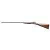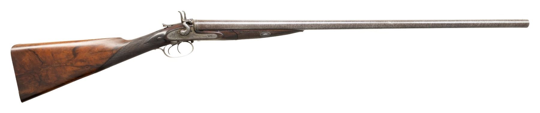 SxS SHOTGUN. Cal. 12ga, opened to 2 3/4". S# 231. Bbls 30" damascus steel. Rib is marked "ADAMS PATENT SMALL ARMS COMPANY 797 STRAND LONDON". Water table and bottom of bbl has London proofs with added 12ga, 70mm chamber length markings. Unusual action with rear sliding top lever release. Rebounding Bar-in-Wood locks, double triggers, and extractors. Locks and fittings have 50% coverage scroll engraving. Locks have Adams Patent markings. Wedge fastened horn tipped walnut forearm and straight hand stock of fancy English walnut. Stock features hand checkering and drop points. LOP: 14 5/16" to a checkered butt with engraved steel, heel and toe caps. DAC: 1 3/4". DAH: 2 1/4". Near neutral cast. BORE DIAMETER: (RT): .726. (LT): .729. CHOKE CONSTRICTION: (RT): .004. (LT) cylinder bore. MINIMUM WALL THICKNESS: (RT): .033. (LT): .027. WEIGHT: 6lb, 13.8oz. John Adams operated at the Strand address from 1864 to July, 1881 until the operation was re-established as the William Watts Locke Co. CONDITION: bbls have lightly faded browned finish. Action and fittings have faded brown appearance. Stock and forearm show moderate finish and checkering wear with scattered scratching and marks. Sound action and lock. Good bright bores. (01-28492/DS). ANTIQUE. $800-1,200.