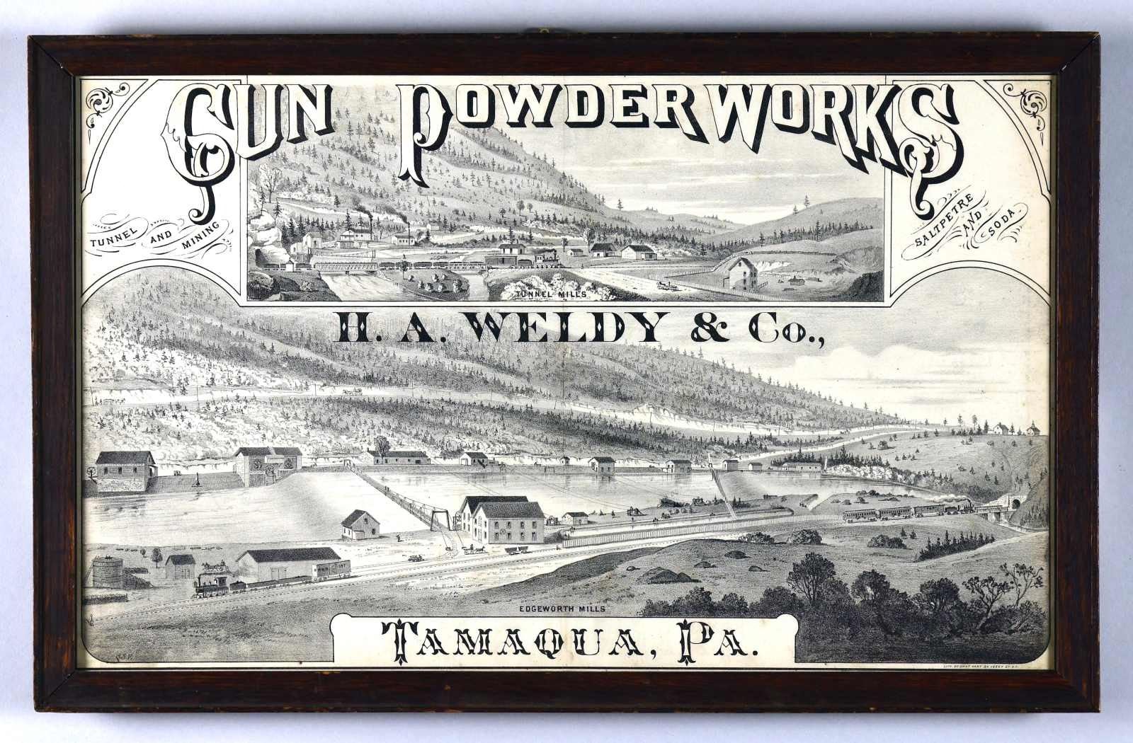 19th century. Landscape print for "H.A. Weldy & Co. Tamaqua, PA" at Edgeworth Mills. Housed in a simple oak frame under glass. SIZE: overall 16" x 25". CONDITION: very good. PROVENANCE: Martin Lane Historic & Western Americana Lifetime Collection. (02-21555/TG). $400-600.