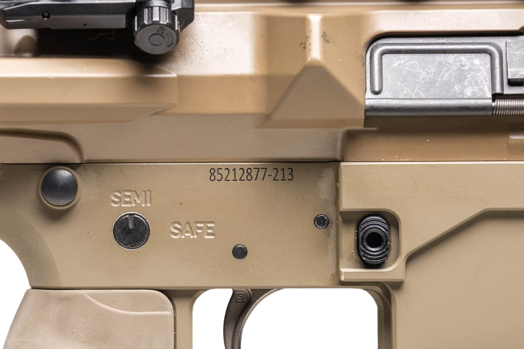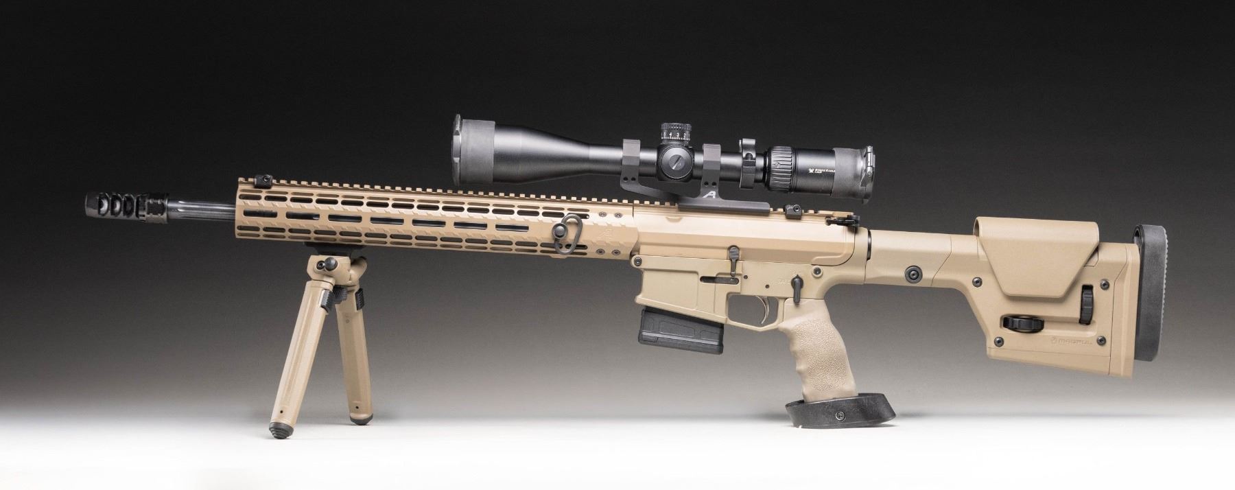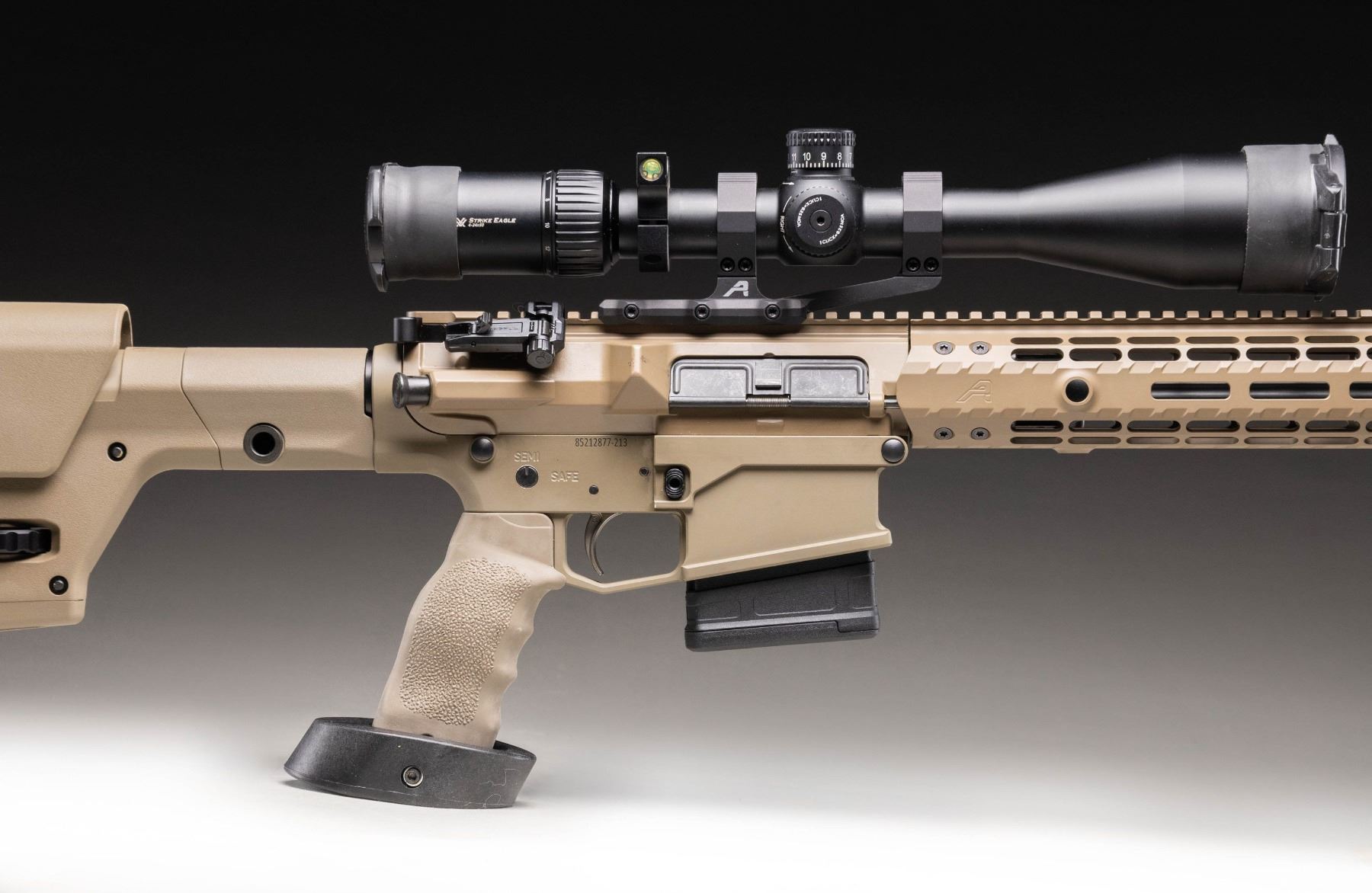 Cal. 308 Win. S# 85212877-213. Bbl. 18" fluted with Lambda VG6 PRS30 muzzle brake. Rifle is sighted with a Vortex Strike Eagle 4-24x50 scope on Aero mount. Scope has crosshair MRAD reticle, very good optics & Vortex folding scope cover. Offset Magpul back up iron sights also present. Upper has "A" Aero marking, lower lacks maker's markings but appears to be of earlier Aero production. Trigger appears to be an aftermarket upgrade marked "S". Balance of metal has FDE finish. Aero MLOK handguard. Gen 3 Magpul PRS stock. Rubber finger groove FDE grip. Magpul FDE bipod present. MAGS: 1-10 rd. PMAG. CONDITION: furniture shows light handling & usage wear. Metal shows some handling & usage marks with about 97% FDE finish. Action functions properly when hand cycled. Bright near excellent bore. (25-5242/MJC). MODERN. $1,100-1,600.