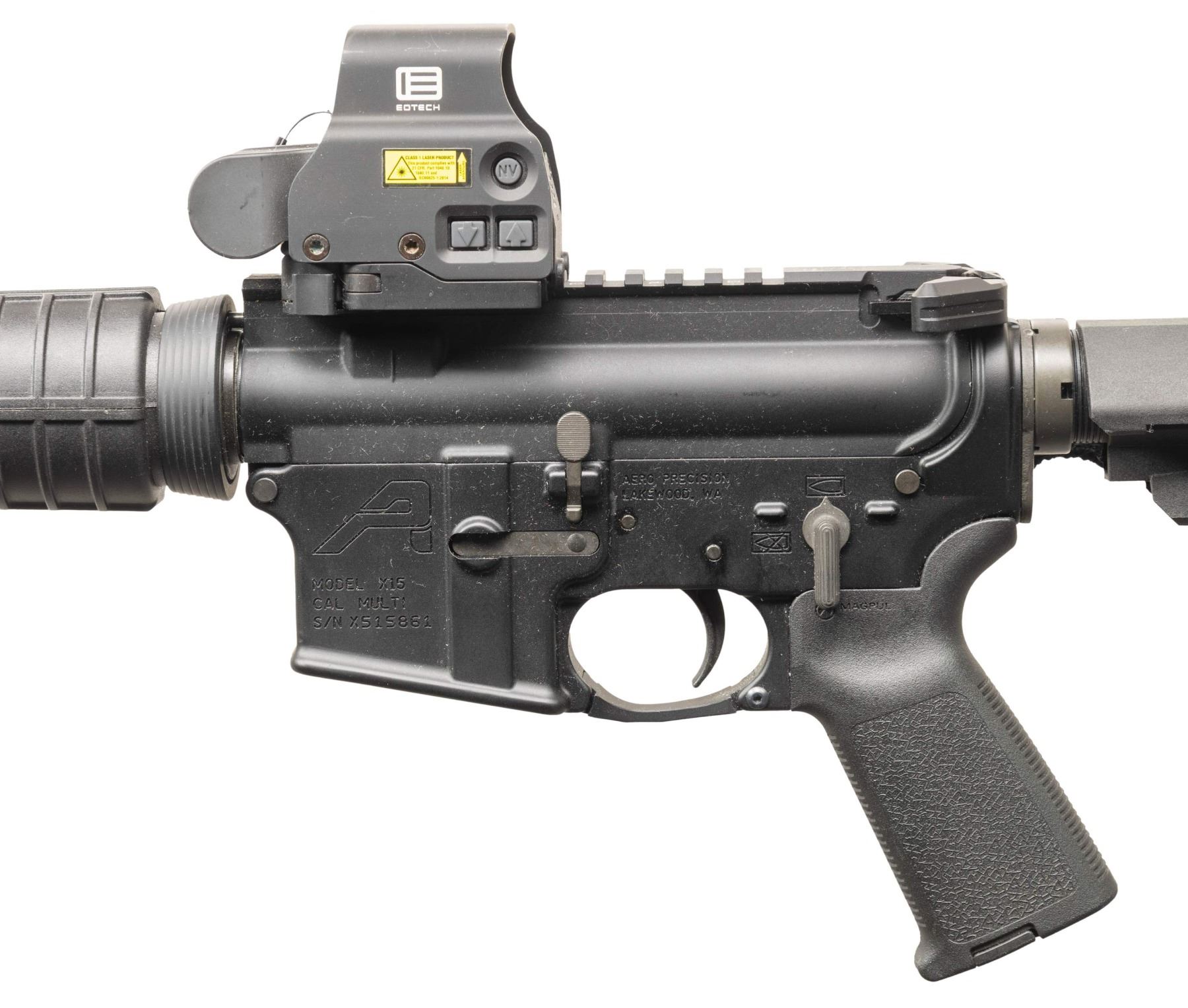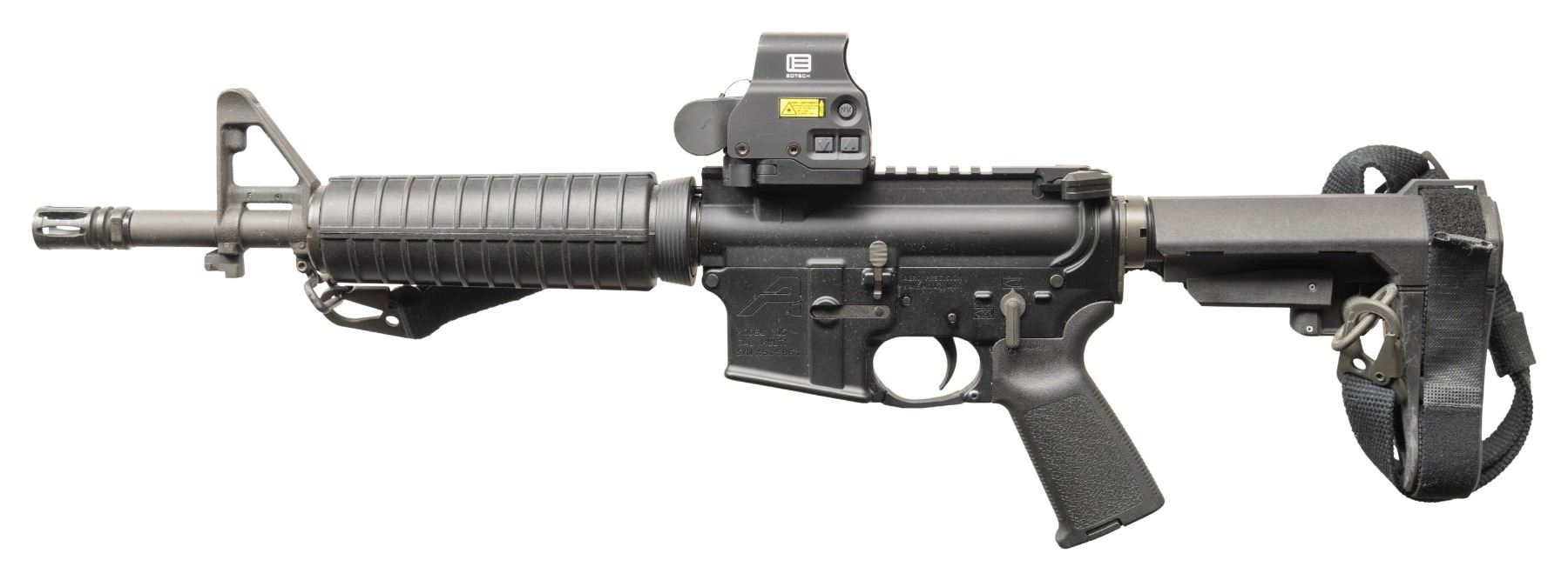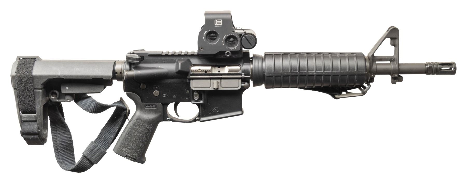 Cal. 5.56. NATO. S# X515861. Bbl. 11". 1/9 barrel terminated w/ A2 flash hider. Protected post front sight / gas block / bayonet lug. A2 style carbine handguards retained w/ tapered delta ring. Flat top upper receiver w/ round forward assist & brass deflector. Currently sporting EO Tech Holographic sight. Aero Precision ambidextrous charging handle. M16 profile bolt carrier. 5 position carbine buffer tube w/ collapsible brace. Black nylon sling. CONDITION: finish complete & consistent w/ little sign or prior use. Sight appears to function correctly, retaining sharp reticle. Bright bore w/ strong rifling. Fire control mechanism appears to function correctly when cycled by hand. (25-4708/JZ). MODERN. $500-800.