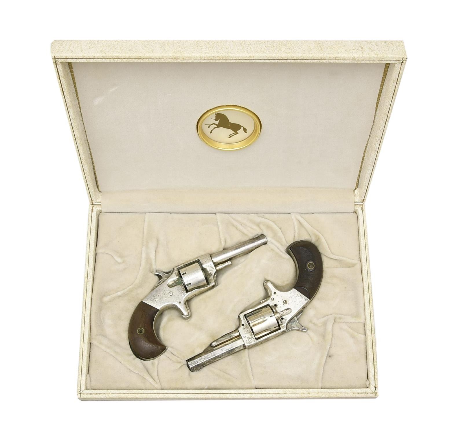 1) AETNA NO.1. Cal. 22 RF. S# 412 (under grips). Bbl. 2 3/8" oct. w/ semi circular sight. 7 Shot fluted cyl. Solid frame action w/ spur trigger. 2 Piece checkered hard rubber grips. UNATTACHED ACCESSORIES: Colt Lady Derringer 2 gun display box. Box shows light staining & tattering at edges. CONDTION: metal has renickeled finish over remaining deep pitting. Action is missing parts & will not function. Grips show light wear. Pitted bore. (01-20165/DS)