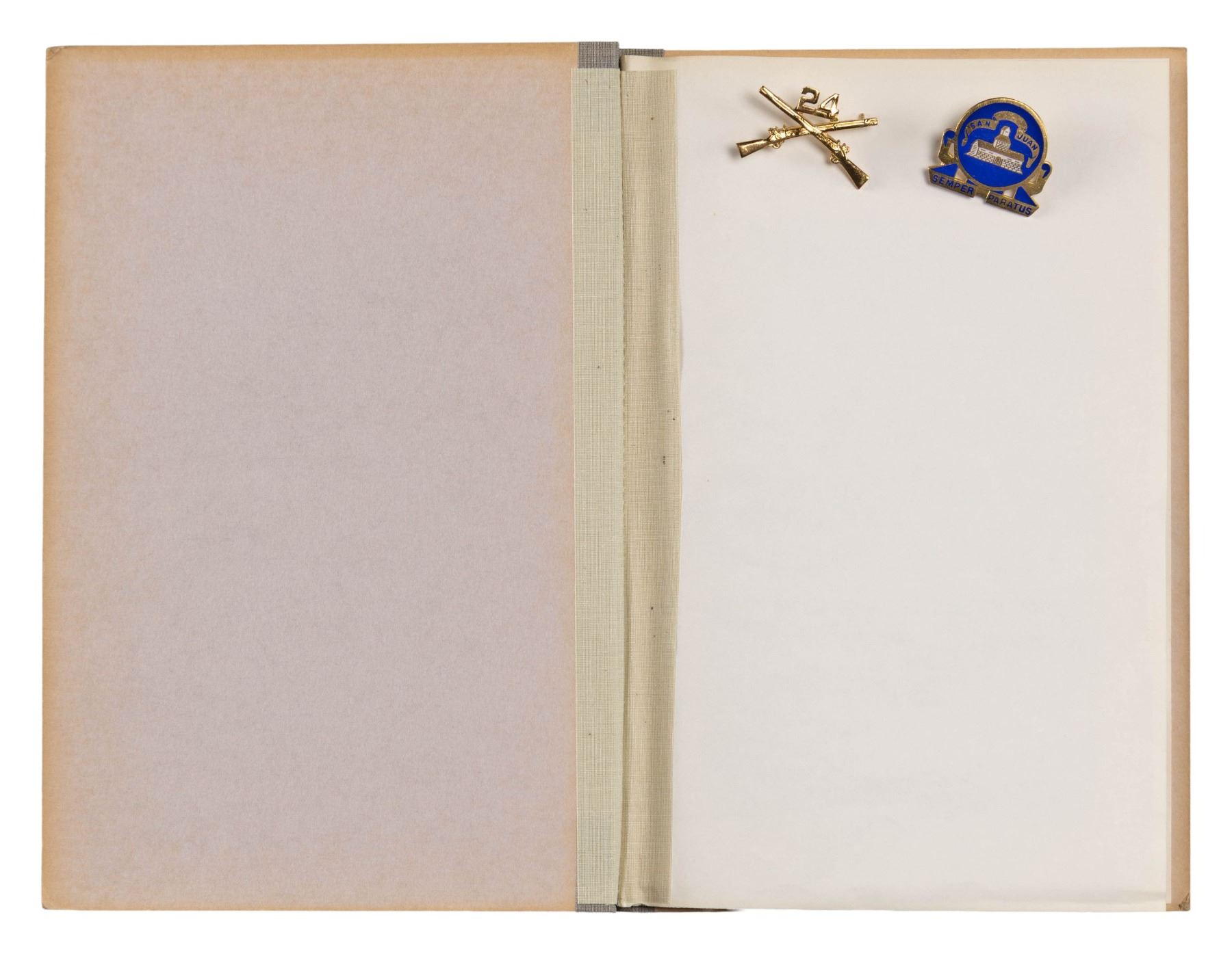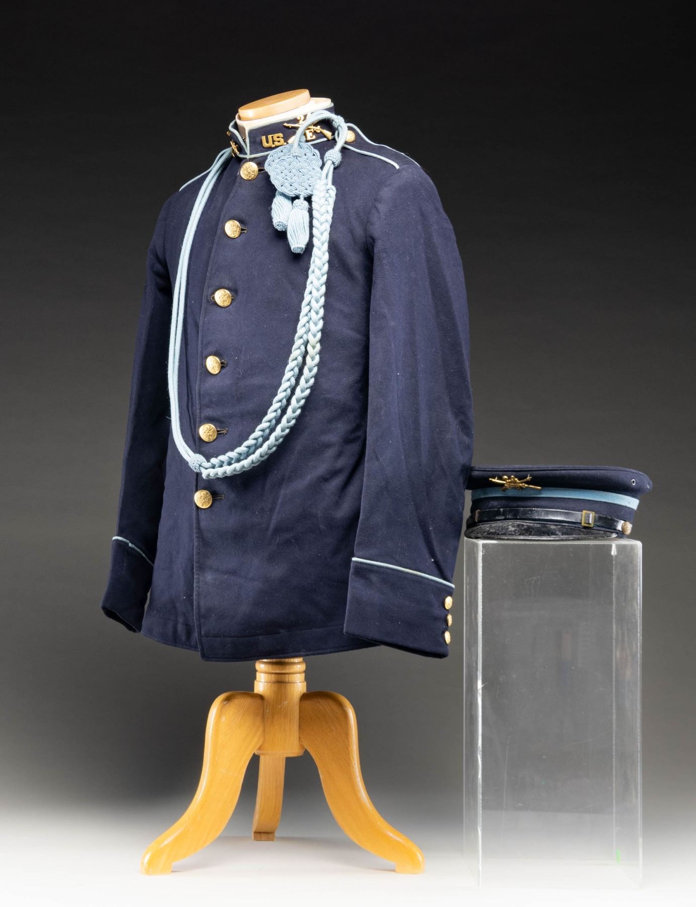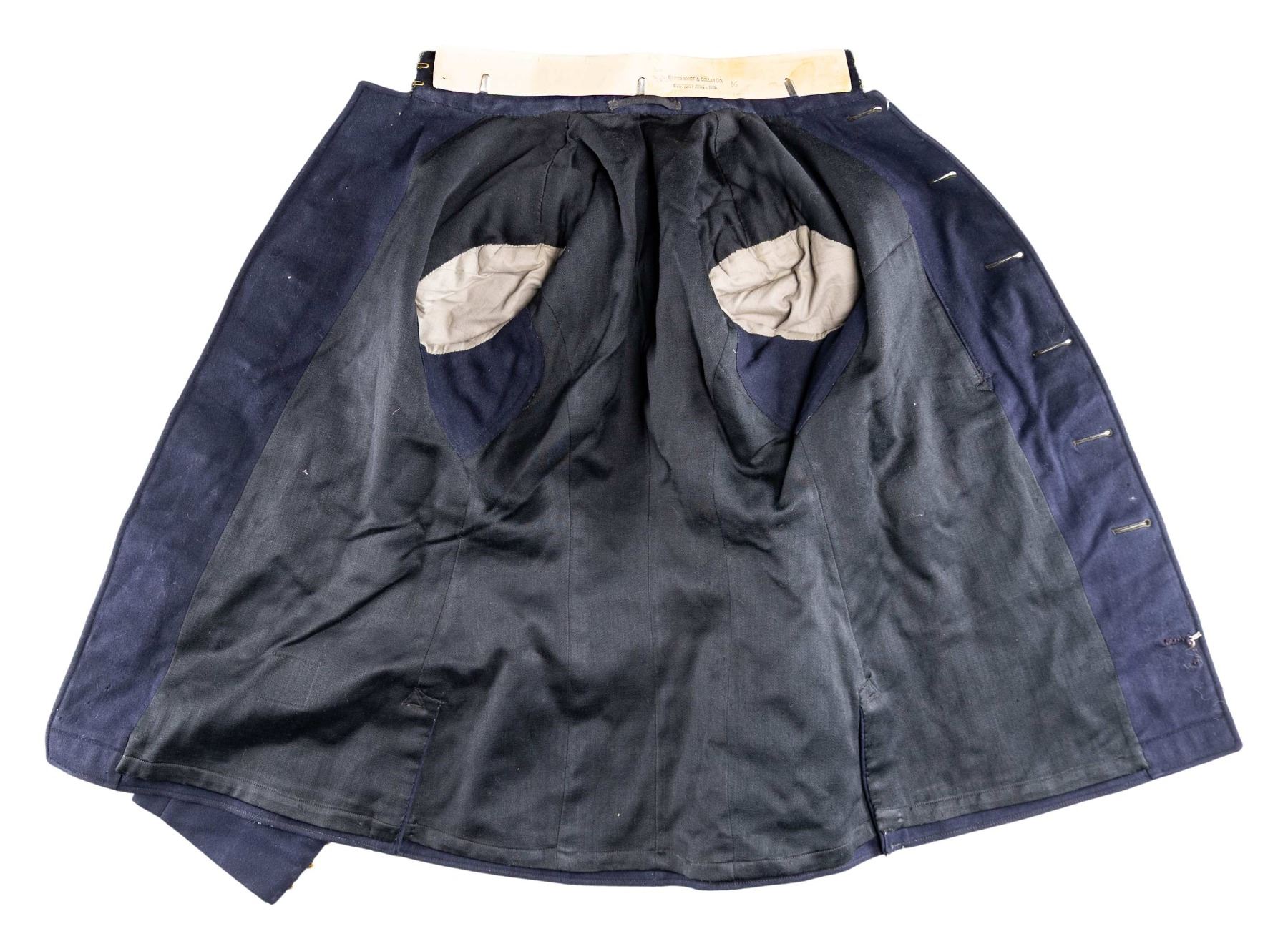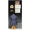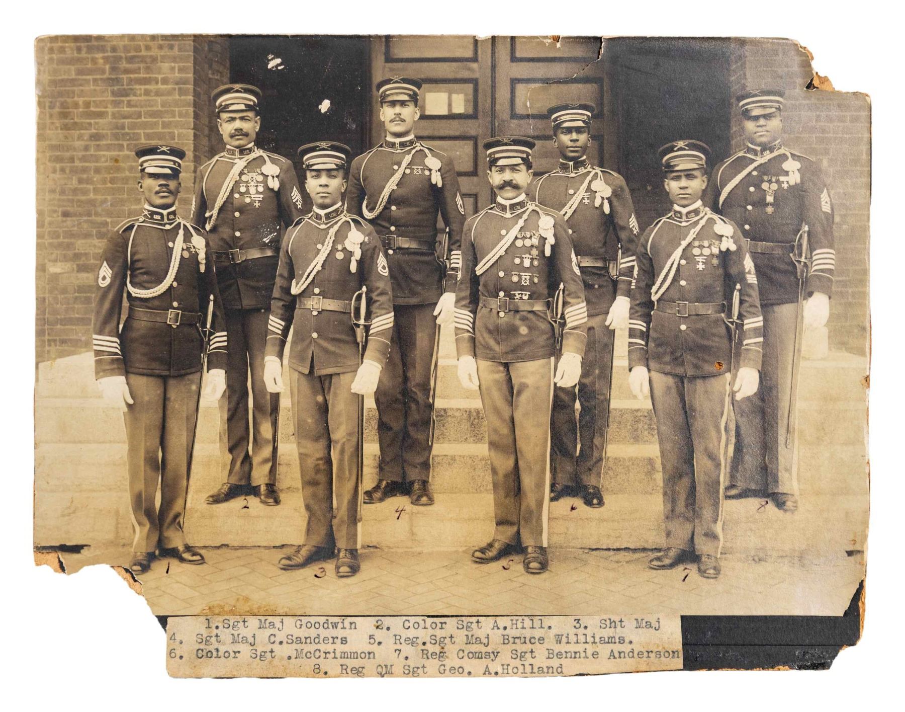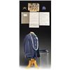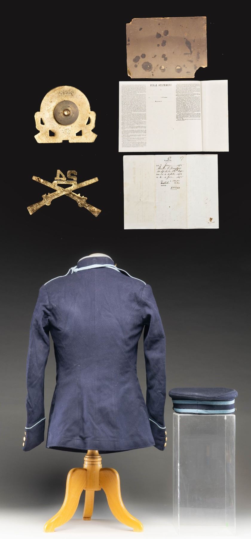 UNIFORM & EPHEMERA. 1902 style 6-button frock coat & visor cap both with 24th Infantry insignia, 9"x6" photograph of 8 identified NCOs of the 24th in uniform, 24th Inf discharge certificate of 1st Sgt. Reuben Douglas in 1875. The 24th was an original "Buffalo Soldier" infantry unit formed of all black enlisted soldiers. Also in lot are two officer's distinctive insignia and 1908 78-page Congressional "Brownsville Affray" report of the Buffalo Soldier racial unrest with white citizens and black soldiers. CONDITION: photo has chipped and broken corners, but crisp & clear content, pamphlet complete, yellowed cracking pages. Uniform is good overall. (02-26442-1/JS). NON-GUN. $400-800.