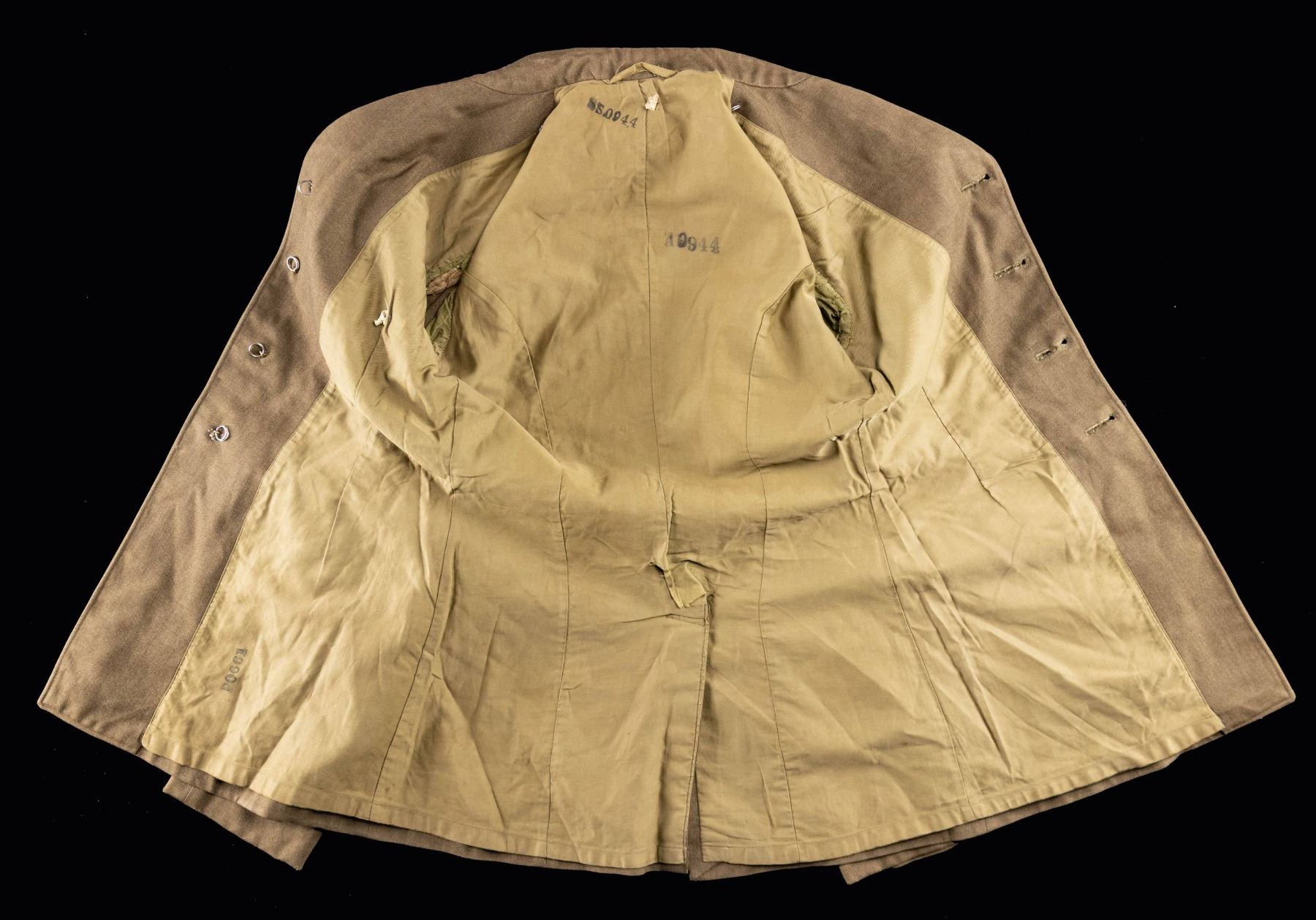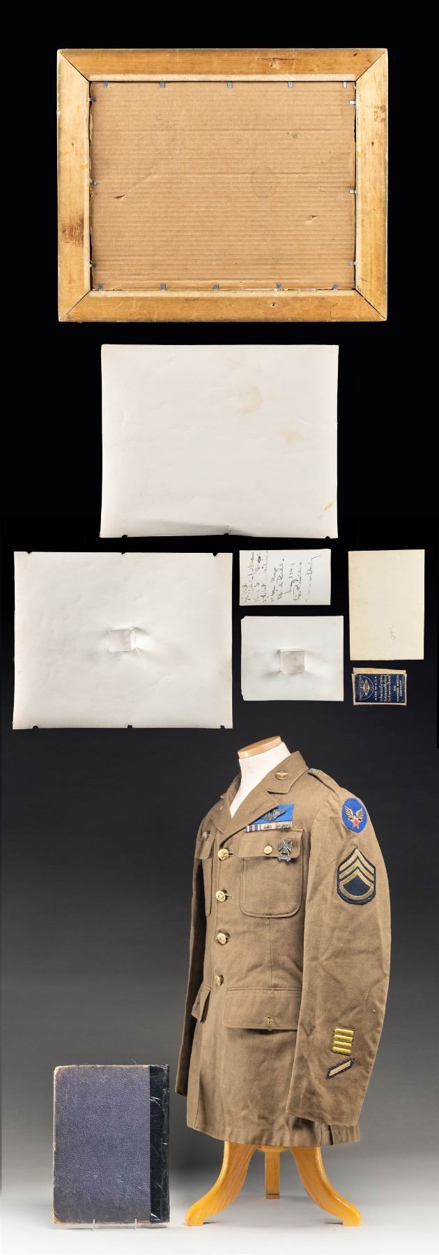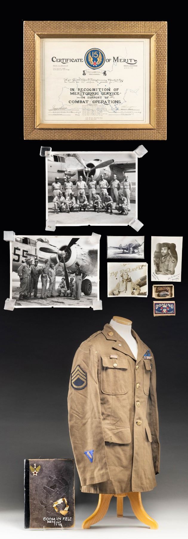 Jacket with Air corps insignia, Aerial Gunners wing, name tag "Raleigh Copeland", several photographs of airman & planes, matchbox with 2 pieces of "flak", framed 15th AC Certificate of Merit for Staff Sgt. William A. Dickinson, Goodman Field, Ft Knox, 1945 yearbook, all black aviation units. CONDITION: uniform has torn lining in right sleeve, fair to good overall, book is partially disbound, taped spine, damaged pages but complete. (02-26442-2/JS). NON-GUN. $400-800.