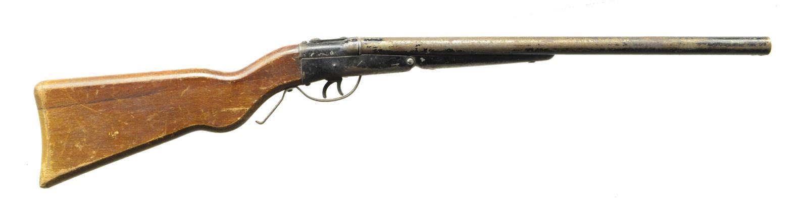 Black painted metal including forend. Wood 2 piece buttstock. UNATTACHED ACCESSORIES: 2 "cartridges". CONDITION: fair overall appearance w/ operating opening lever; non functioning triggers & firing pins. (02-16713/NW/MD). NON-GUN. $25-50.