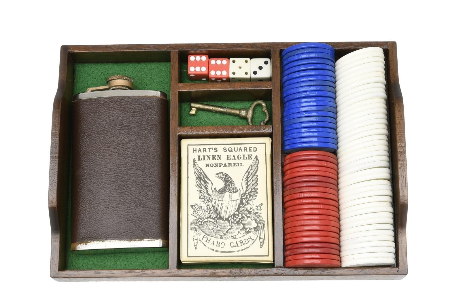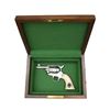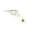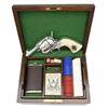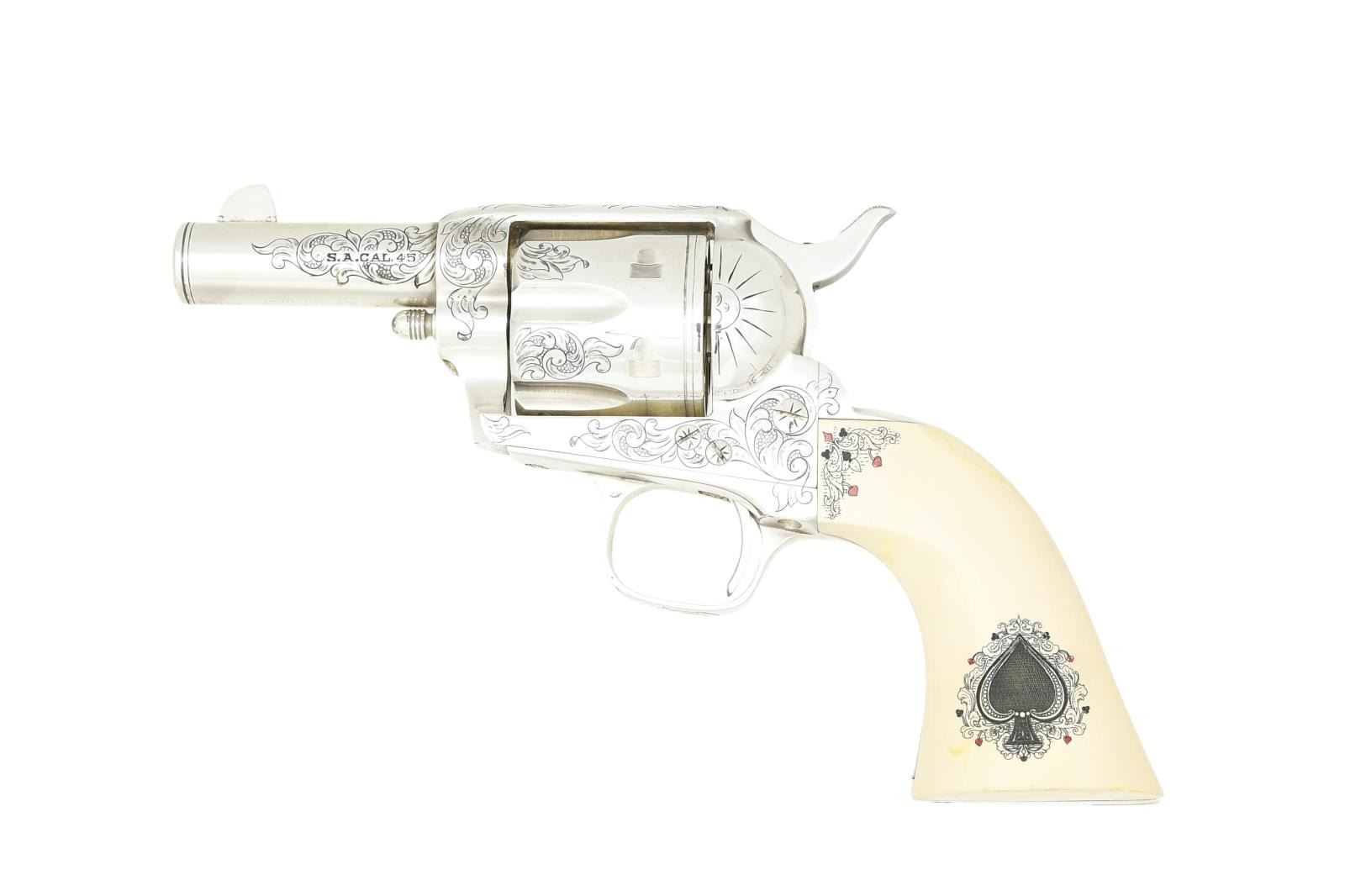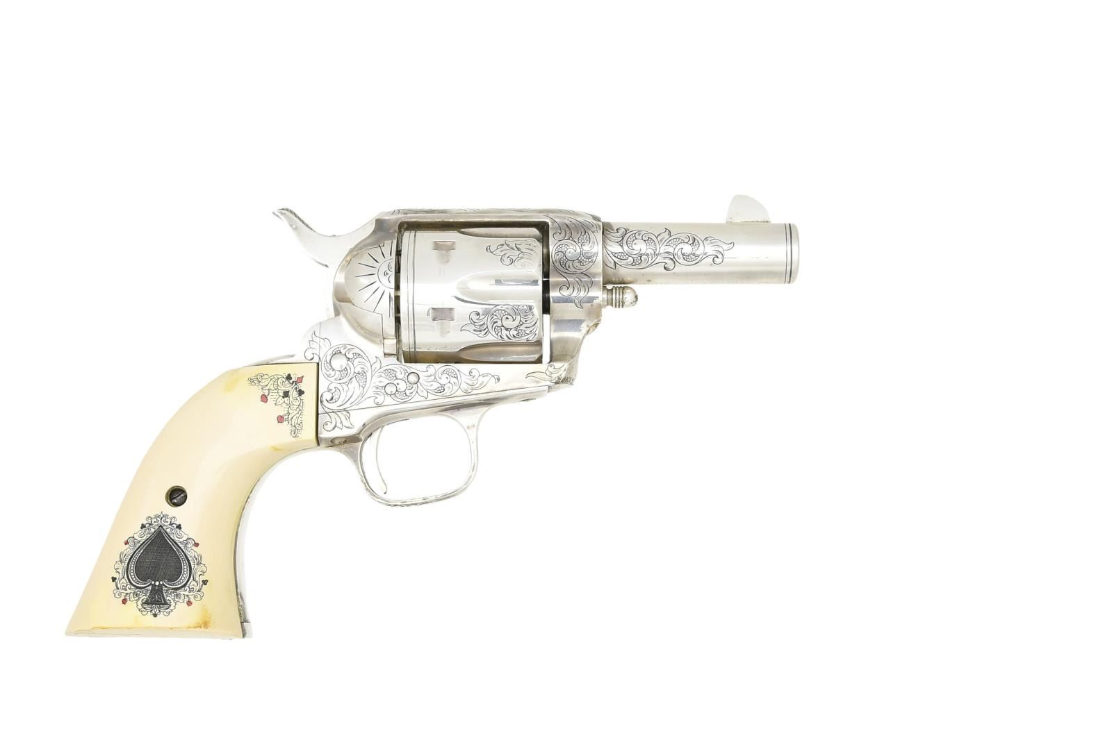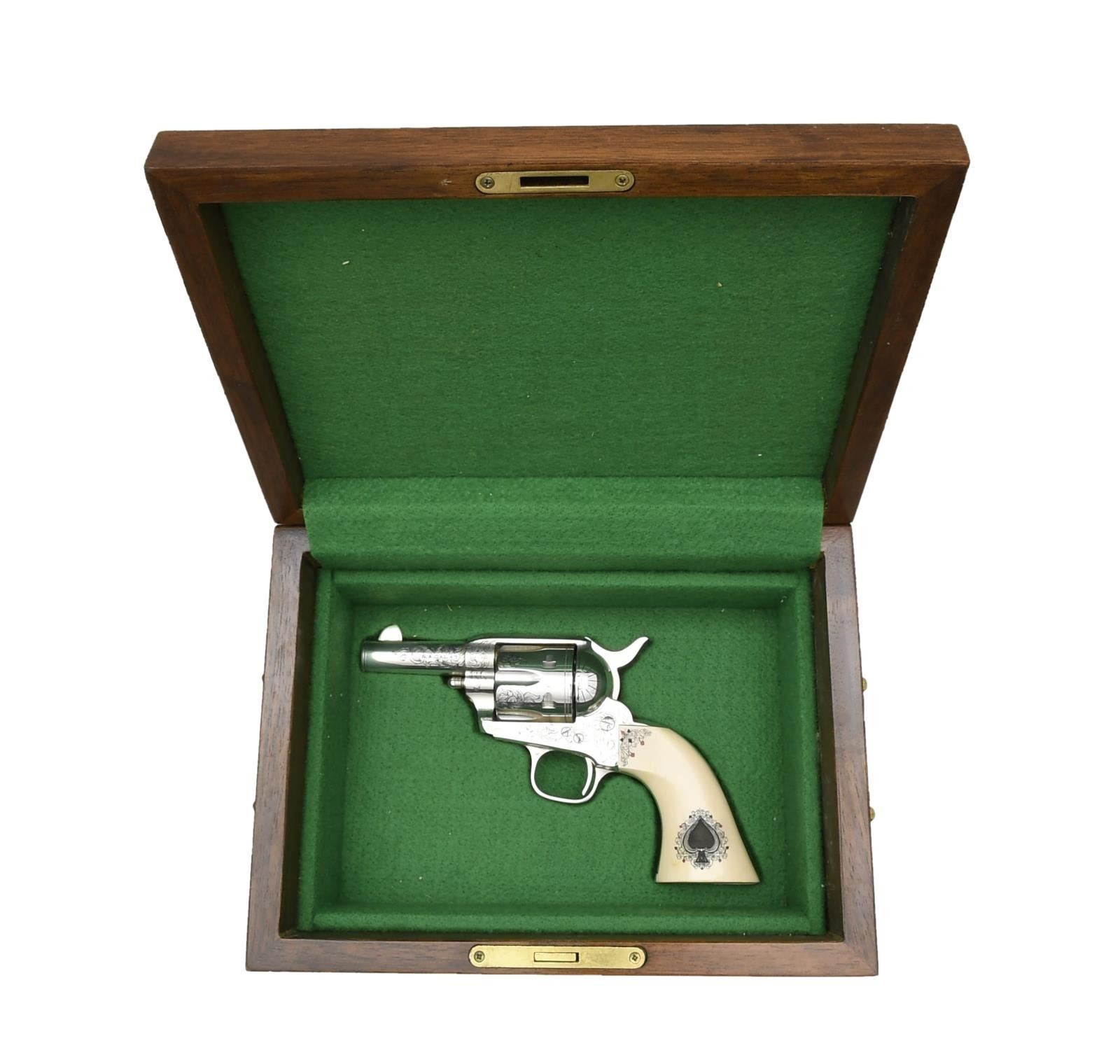 REVOLVER. Cal. 45 Long Colt. S# 109754. Bbl. 3" w/ blade front sight & frame notched rear. Mfg. by Uberti in Italy about mid 1990's & sold by American Historical Foundation in 1996. Hand engraved & sterling silver plated. Black powder style frame w/ simulated ivory one piece grips having scrimshaw appearing spade design at base of grips & other card symbols at top front of grips. Backstrap has "1 of 750" & butt numbered 058. UNATTACHED ACCESSORIES: green velvet lined walnut case w/ outlined compartment in base for rev. Upper section having lift out tray w/ gambler's accessories to include: 2 sets of dice, pocket liquor flask, vintage boxed deck of cards, key for case & assortment of poker chips in red, white & blue. Plain lid & vintage brass carry handles on sides. Some light scratches on lid & one more noticeable scratch on front of base. Envelope of AHF / Uberti paperwork to include polishing cloth. CONDITION: near excellent overall appearance that has had quality metal polish applied at time of cataloging but would benefit from further attention. Appears unfired. PROVENANCE: Collection of Alan Bradley Shepherd. (21-3433/NW). MODERN. $800-1,200.
