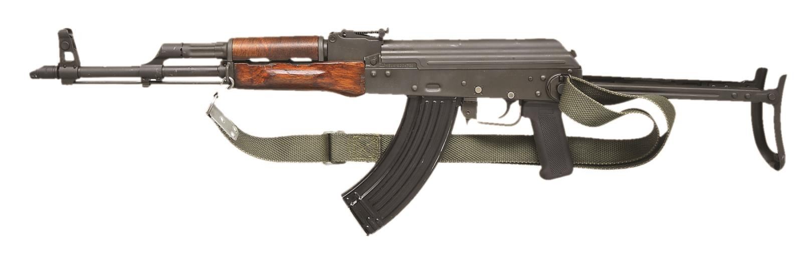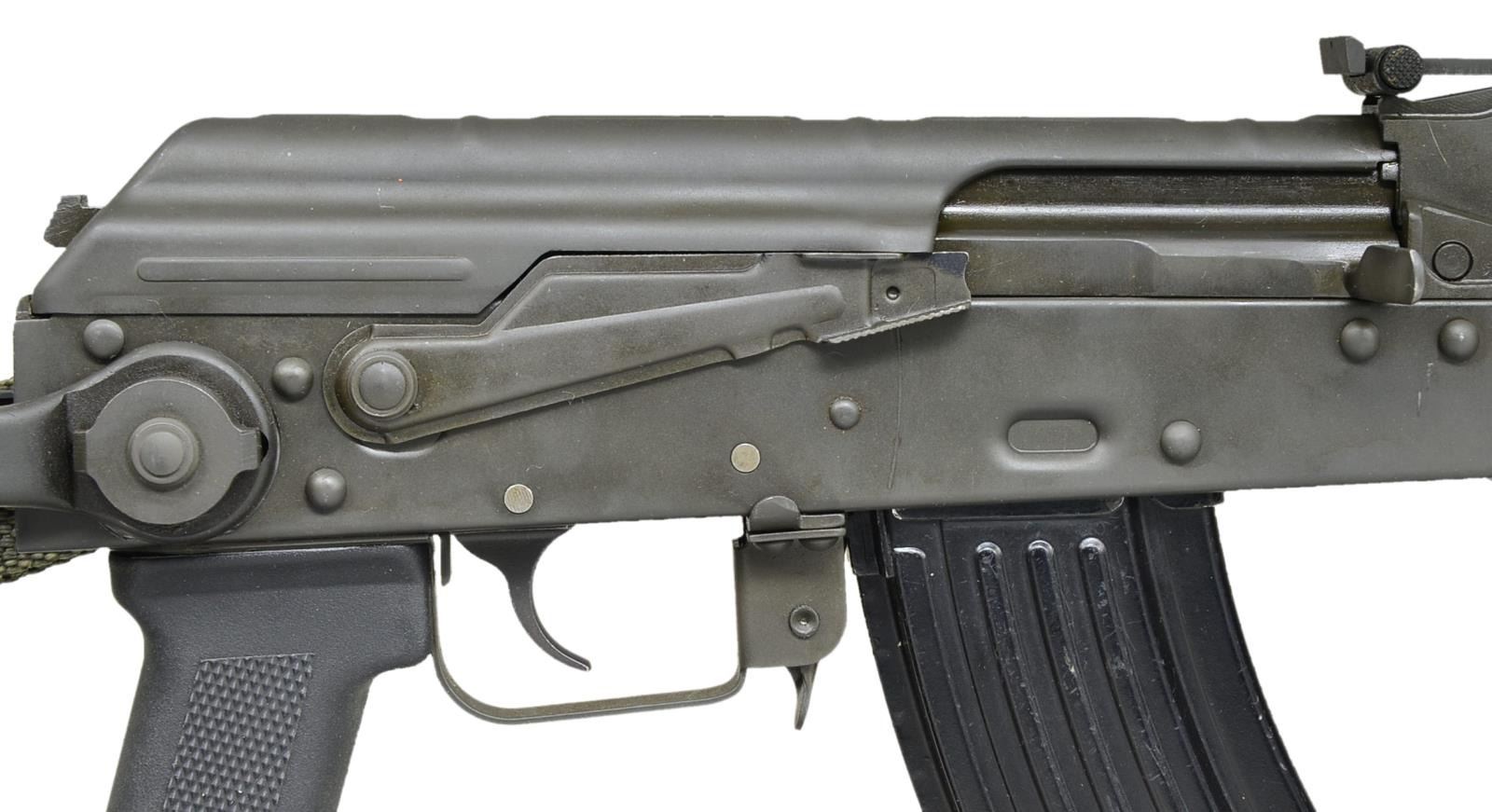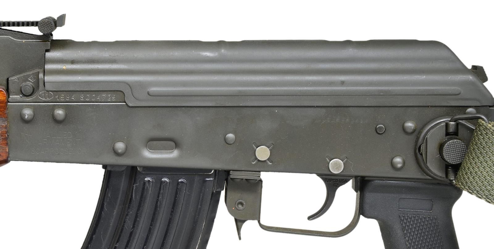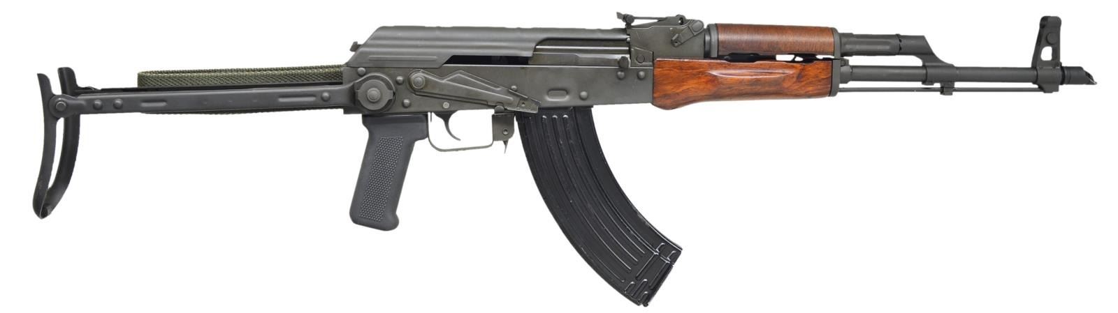 Cal. 7.62x39. S# G001743. Bbl. 16". Under folding AK variant w/ deep rich red/brown wood handguard. Black plastic checkered pistol grip. Muzzle is terminated w/ U.S. mfg. slant muzzle brake. Front gas block & bayonet lug dbl. also secure on board cleaning rod. Stamped NODAK Spud receiver. Front sight is protected post w/ a rear tangent sight variable in elevation to 1,000m. Right side controls. Tapco G2 trigger. Dark matte phosphate style finish. Sling swivels on left side w/ green canvas sling. MAGS: 1-30 rd. metal. UNATTACHED ACCESSORIES: VISM nylon bag. CONDITION: finish is complete & consistent w/ only a thin line between selector & receiver on finish. Unclear whether front brake is permanent, though spring loaded lock moves freely. Sm. area of rolled metal on slanted surface. Wood furniture has normal arsenal impressions. Folding stock locks tightly in open & closed position. Bore is shiny w/ aggressive rifling. Fire control mechanism appears to function correctly when cycled by hand. (21-779/JZ). MODERN. $600-900.