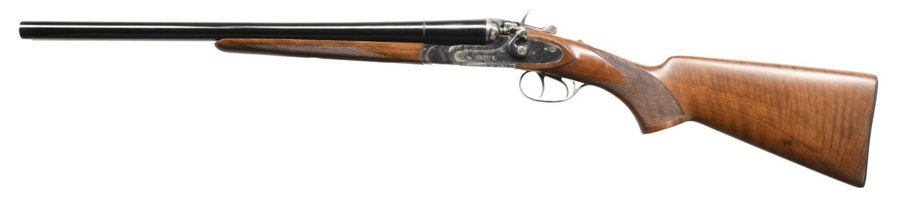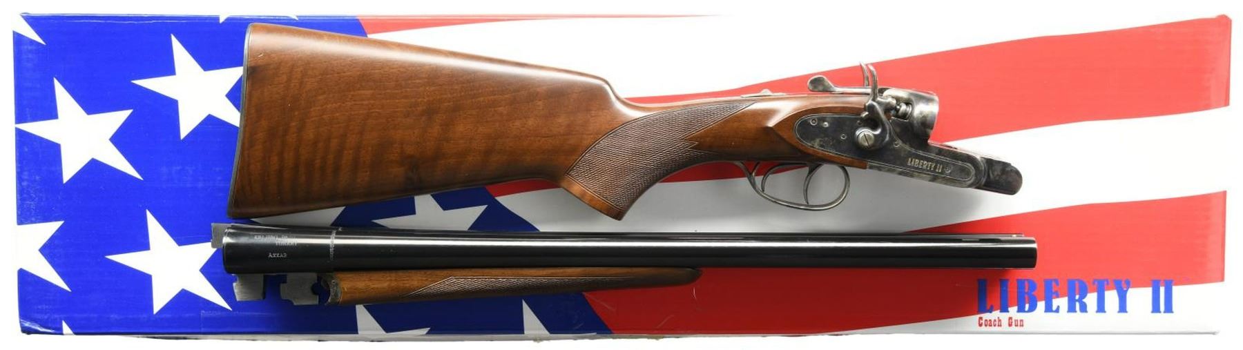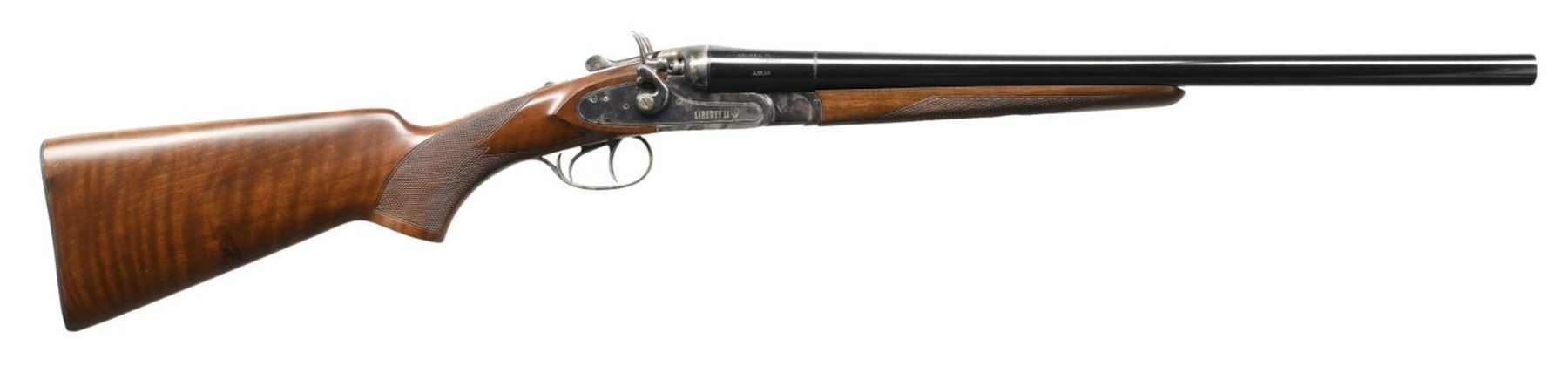MATCHING IMPORTER BOX. Cal. 12 GA, 3". S# 02C4343. Bbl 20 1/8". Liberty II SxS shotgun mfg. by Akkar in Turkey and imported by KBI of Harrisburg, PA. Left side of bbl. is marked "LIBERTY II" above the cal. designation, with KBI's importer information above "TURKEY" and "AKKAR" on the right. Receiver sideplates are marked "LIBERTY II". Case color hardened receiver, sideplates, hammers, lever, trigger guard, and buttplate, with blued bbls. Checkered wood pistol grip buttstock and forend. Brass bead front sight. UNATTACHED ACCESSORIES: matching importer box. CONDITION: excellent, with metal components retaining bountiful amounts of their original factory finishes, exhibiting some light oxidation on the sides of the receiver and on the sideplates. Mirror bores. Wood furniture shows a few scattered marks from handling and storage, but otherwise is very good overall. Box shows some mild exterior wear. (23-4935/MLW). MODERN. $300-500.