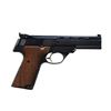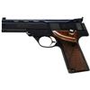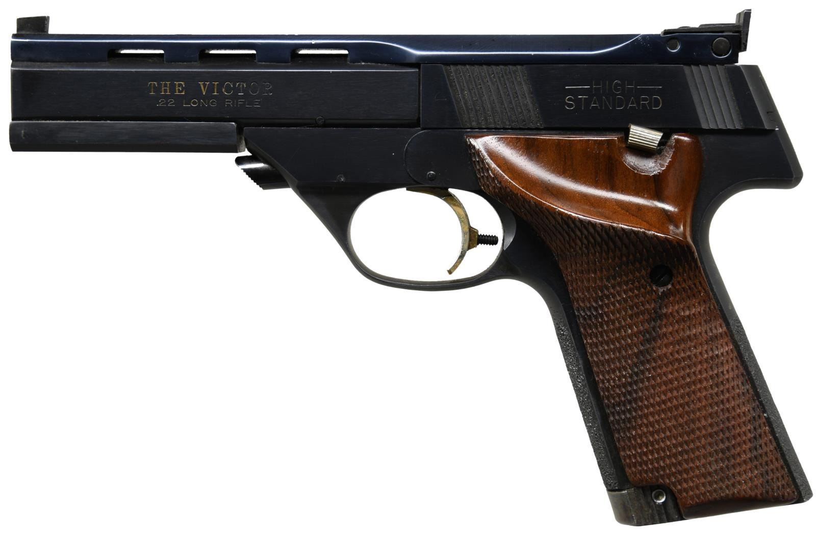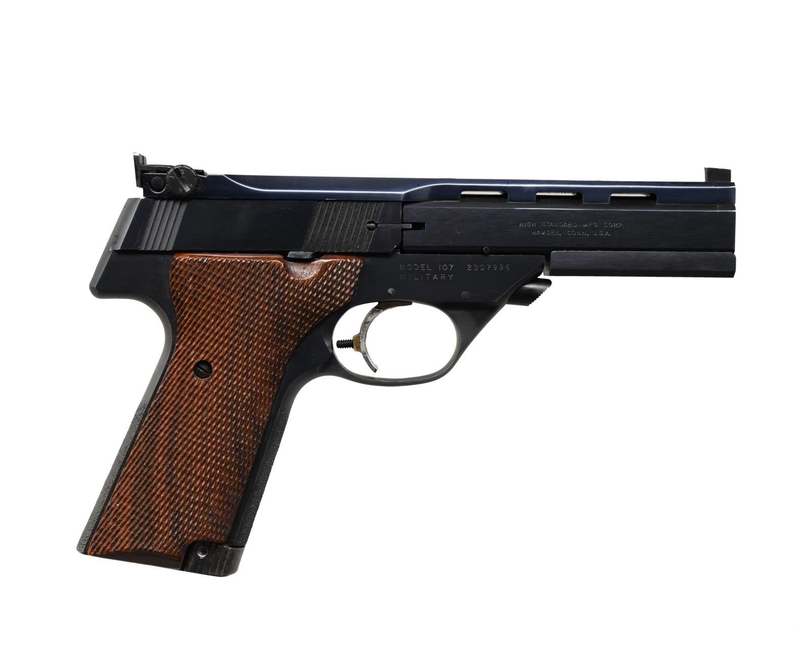 STANDARD MODEL 107 MILITARY "THE VICTOR" SEMI-AUTOMATIC PISTOL WITH ACCESSORIES. Cal. 22 LR. S# 2307995. Bbl. 4 1/2". Model 107 Military "The Victor" semi-automatic pistol mfg. by High Standard and subsequently accurized by Al Dinan, whom is known for customizing 1911 pistols. Left side of bbl. is marked "THE VICTOR" over the cal. designation, with High Standard's mfg. information marked on the right. Left side of slide is marked "-HIGH-/ STANDARD". Right side of frame is marked "MODEL 107/ MILITARY" followed by the S#. Metal components exhibit a blue finish overall. Frame is mounted with 2-piece checkered wood thumb rest grips. Aluminum V/R with patridge front sight and adjustable square notch rear sight. MAGS: 5 10-rd. UNATTACHED ACCESSORIES: non-original box containing original factory styrofoam inserts, 1 spare bbl., and spare mags. CONDITION: excellent, with metal components retaining bountiful amounts of their original factory blue finish overall, save for a couple small spots of light wear, and a few light superficial handling marks. Mirror bore, exhibiting well defined rifling throughout. Grips show a few nicks to the diamonds, but otherwise are good overall. PROVENANCE: Used by MSGT Pestilli at National Match, Camp Robinson, Little Rock, AK. From the Working Reference Collection of Military Arms Instructor, Master Sergeant Vincent Pestilli. (23-7518/MLW). MODERN. $600-900.