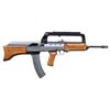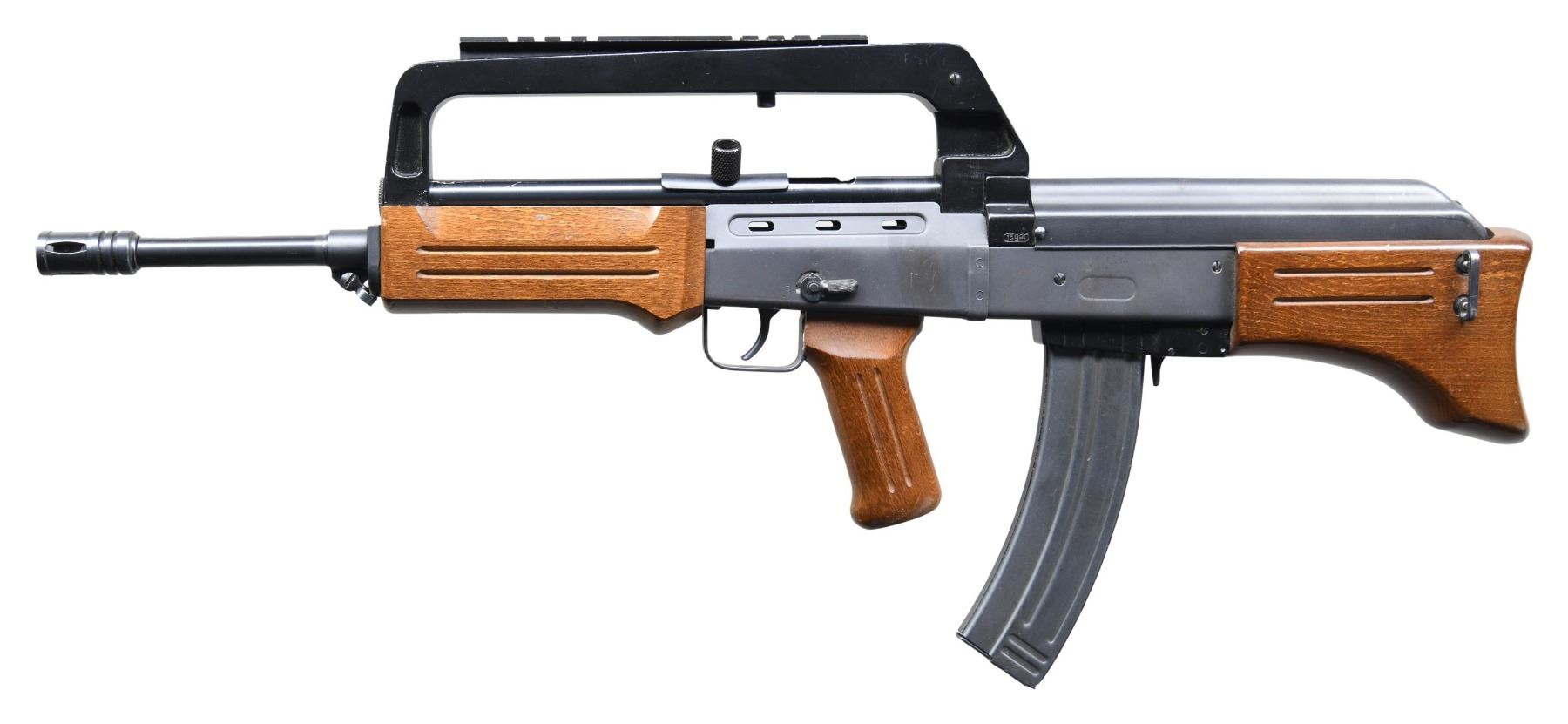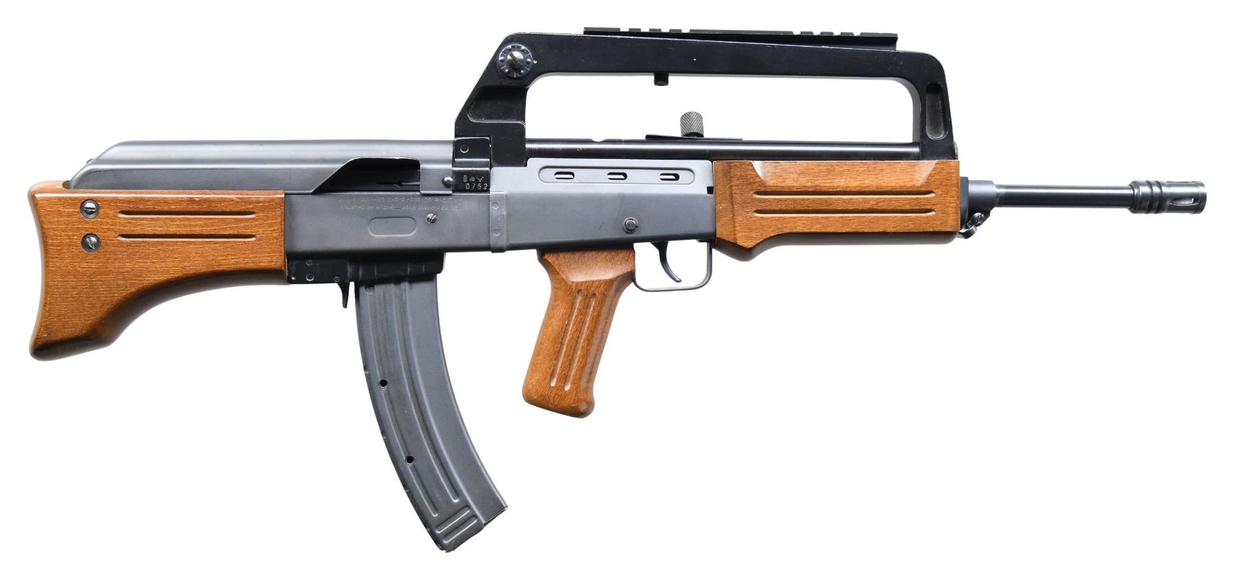 Cal. 22lr. S# 0752. Bbl. 18". Threaded muzzle, sporting A2 style flash hider. An Italian manufactured rimfire rifle in the style of the French FAMAS bullpup, for the commercial market. Black / blue finish on exposed metal components. Exposed pin front sight post located inside of carry handle. Hardwood forend w/ matching pistol grip & shoulder stock. Left side safety / selector above pistol grip. Top mounted, knurled charging handle above pistol grip, inside carry handle. 7.5" weaver style scope base above carry handle. Dual aperture rear peep sight. Left side rear sling swivel w/ front swivel below barrel. MAGS: 3 factory 30 rd. CONDITION: Finish complete & consistent w/ some gentle patina on receiver under close inspection. Bore is bright w/ visible rifling. Fire control mechanism appears to function correctly when cycled by hand. (25-2237/JZ). MODERN. $600-1,000.