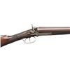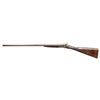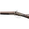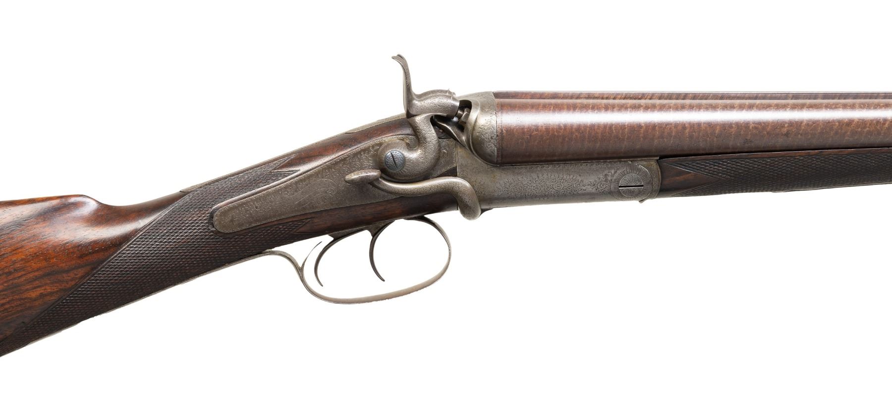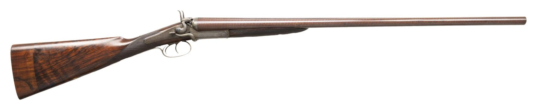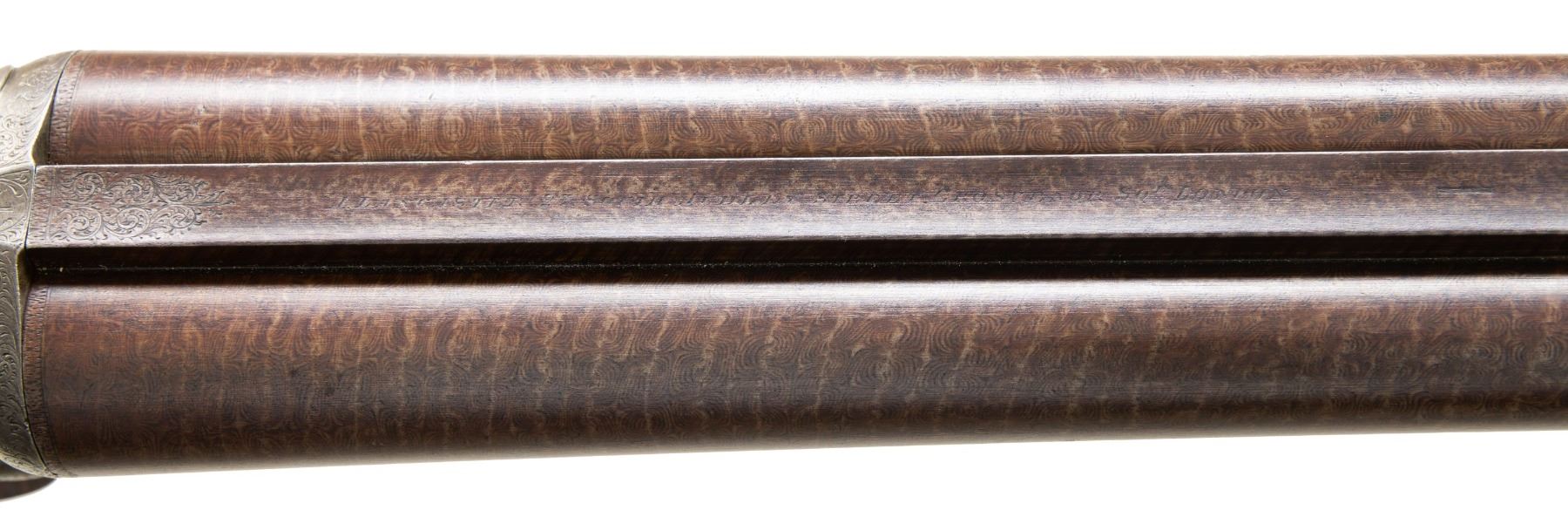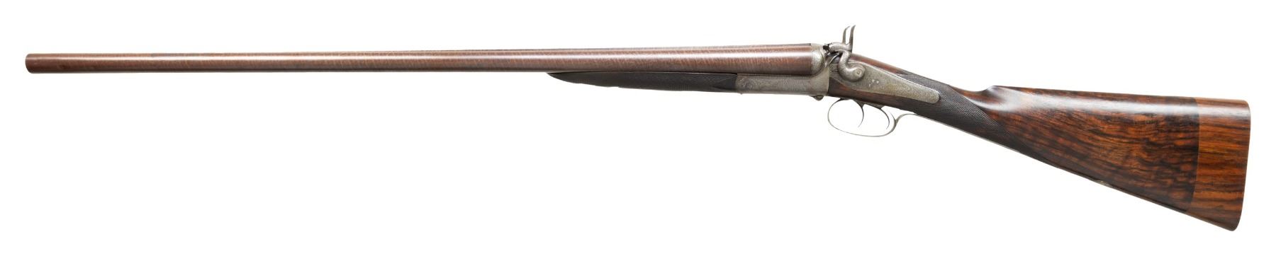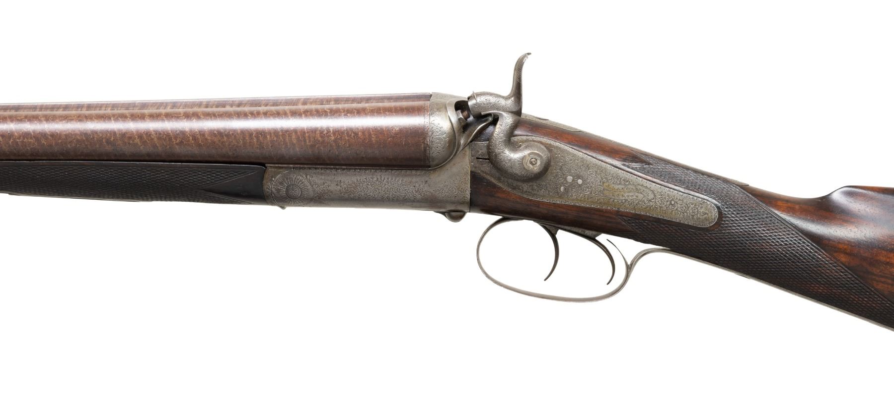 SXS HAMMER SHOTGUN. Cal. 12 Ga. S# 4020. Mfg. approx. 1873. Damascus 29.75" barrels have London black powder proofs; chokes measure cyl. & chambers appear reamed out. The gun rib has maker's address & "1" indicating this was once part of a pair. Round bodied receiver with right side opening lever. Rebounding back hammer locks; left hammer has broken screw head. Action has generous coverage of acanthus scroll engraving. Checkered walnut splinter forearm with Deeley release & metal tip; forearm iron is matching numbered with wood numbered "681701". Checkered walnut stock w/ oval name plate. Stock has added 2" walnut extension to butt having an LOP: 14" to grooved butt. UNATTACHED ACCESSORIES: hammer screw head. CONDITION: gun appears to have been re-freshened with re-browned barrels & refinished buttstock having re-cut checkering. Barrels have good brown finish with scattered pinprick prior pitting & marks. Bottom rib shows detached face at muzzle. Action has cleaned gray appearance with faded case colors visible on water table. Wood has very good appearance with sm. chips on edges of forearm barrel edges, scattered dings & wear to finish. Bores show pitting & scratches. (01-28488/MD). ANTIQUE. $500-700.