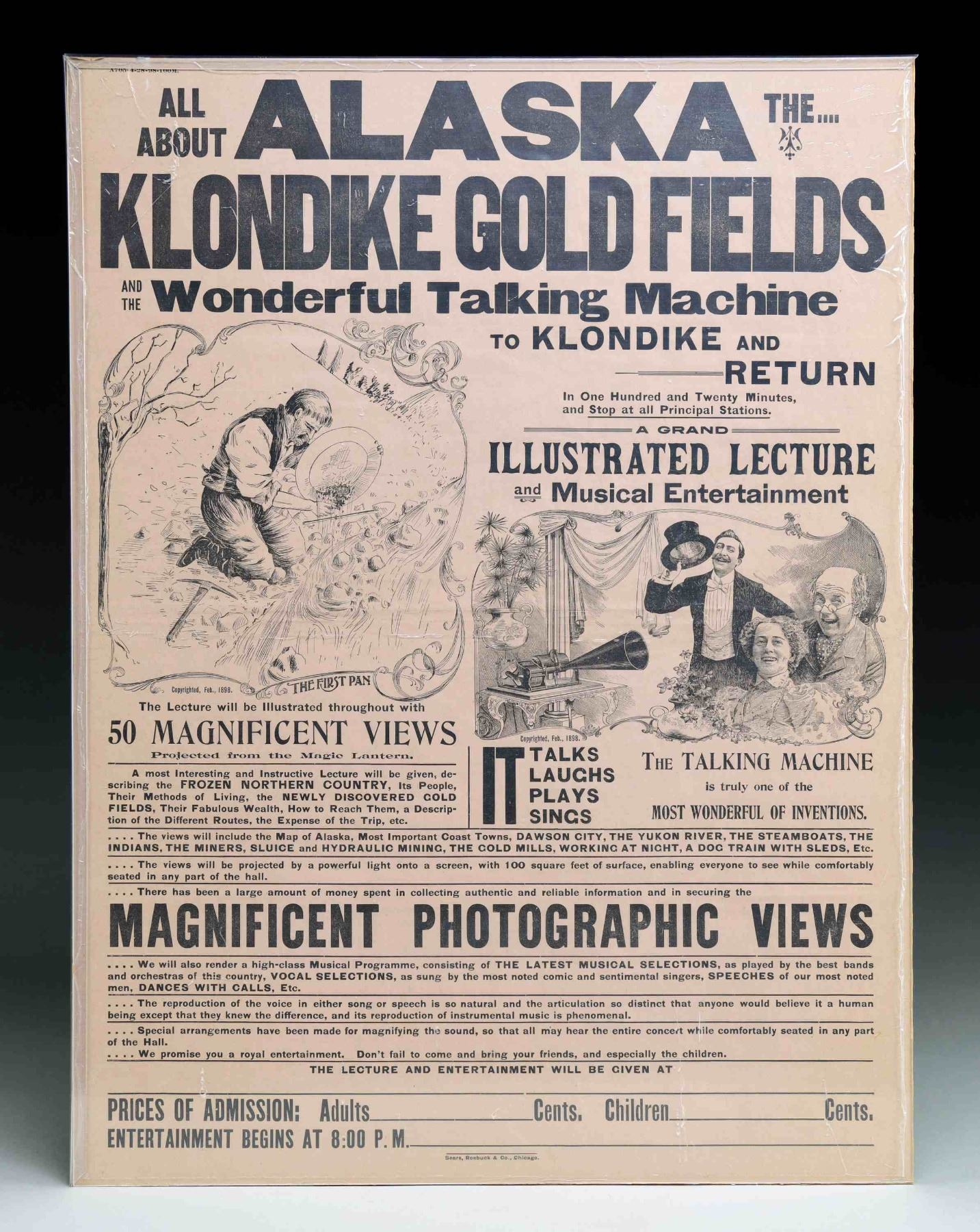 THE WONDERFUL TALKING MACHINE TO KLONDIKE AND RETURN" BROADSIDE. Late 19th century. Broadside for Sears, Roebuck & Co, Chicago. This example announces "A Grand Illustrated Lecture and Musical Entertainment" aided by "The Talking Machine" touted as "truly one of the most wonderful inventions". The announcement also indicates " Magnificent Photographic Views" and more. One image shows The First Pan with a copyright Feb., 1898, the other image people enjoying the "talking machine" with a copyright Feb., 1898. Mounted under plexiglass. SIZE: overall 24" x 18". CONDITION: light wear to very edges not covered by plexiglass. Good overall. PROVENANCE: Martin Lane Historic & Western Americana Lifetime Collection. (02-21591/TG). $400-600.