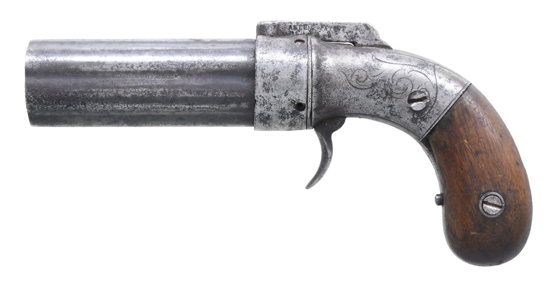 Cal. 32. S# 395 (beneath left grip panel). Bbl. 3 1/4". Percussion pepperbox revolver mfg. by Allen & Wheelock, circa. 1850s-1860s. Six-shot bbl. cluster is marked "ALLEN & WHEELOCK," with "ALLEN'S PATENT" marked on the left side of the hammer. Sides of receiver feature light foliate engraving. Frame is mounted with 2-piece smooth wood grips. S# "395" is marked on the frame, recoil mainspring, as well as on the interior of the grips. Trigger guard is absent. CONDITION: metal components exhibit a gray patina, with varying degrees of pitting present overall. Action functions appropriately when cycled by hand. Grips show scattered marks and impressions from handling and storage, with a gouge present on the butt of the right panel. (01-26080/MLW). ANTIQUE. $200-400.