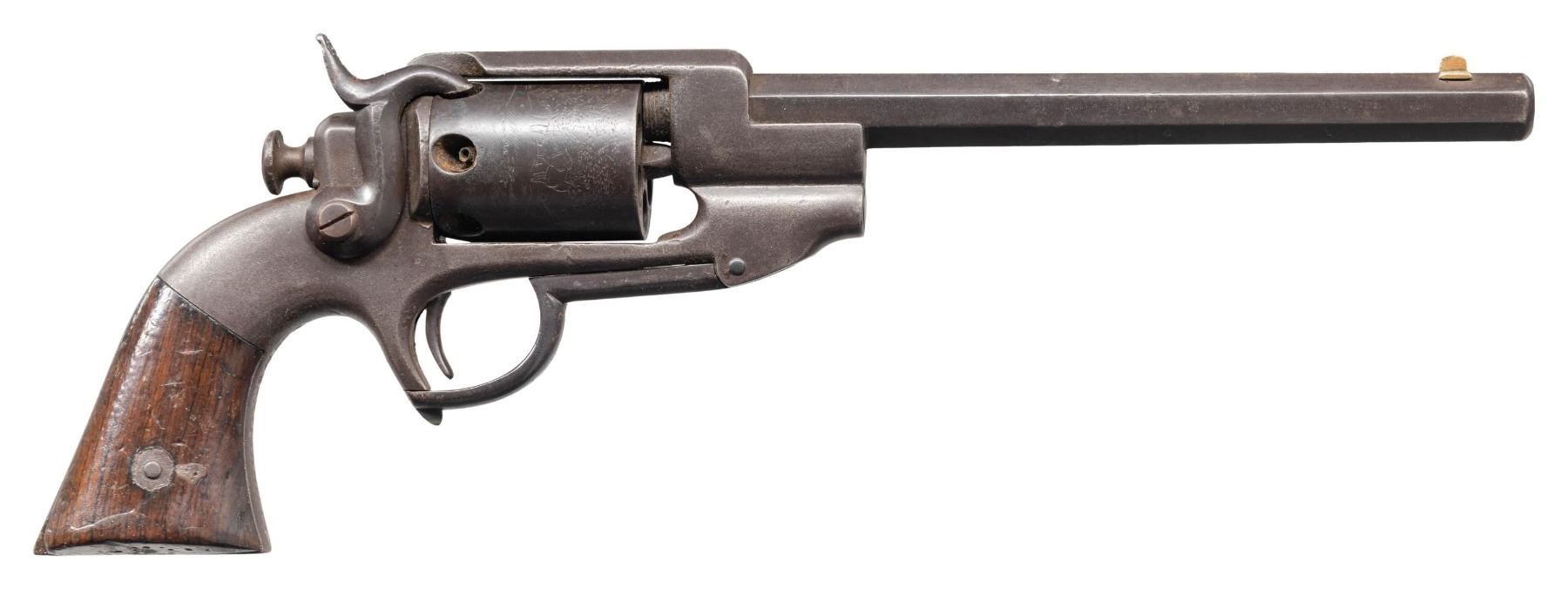 Cal. 36. S# 536. Bbl 8" oct with brass blade sight. 6-shot round roll engraved cyl. Late model having a spring loaded catch for the trigger guard/loading lever mounted on rear of the trigger guard. 2-pc walnut grips. Front grip strap has a hand inscribed number that appears to an owner's social security number. Approx 750 mfg 1858-1861. CONDITION: metal has a dark brown patina appearance. Cyl retains visible scene. Grips show heavy wear with chips at butt. Functioning action. Lightly pitted bore retains intact rifling. (01-28511/DS). $1,000-1,500.