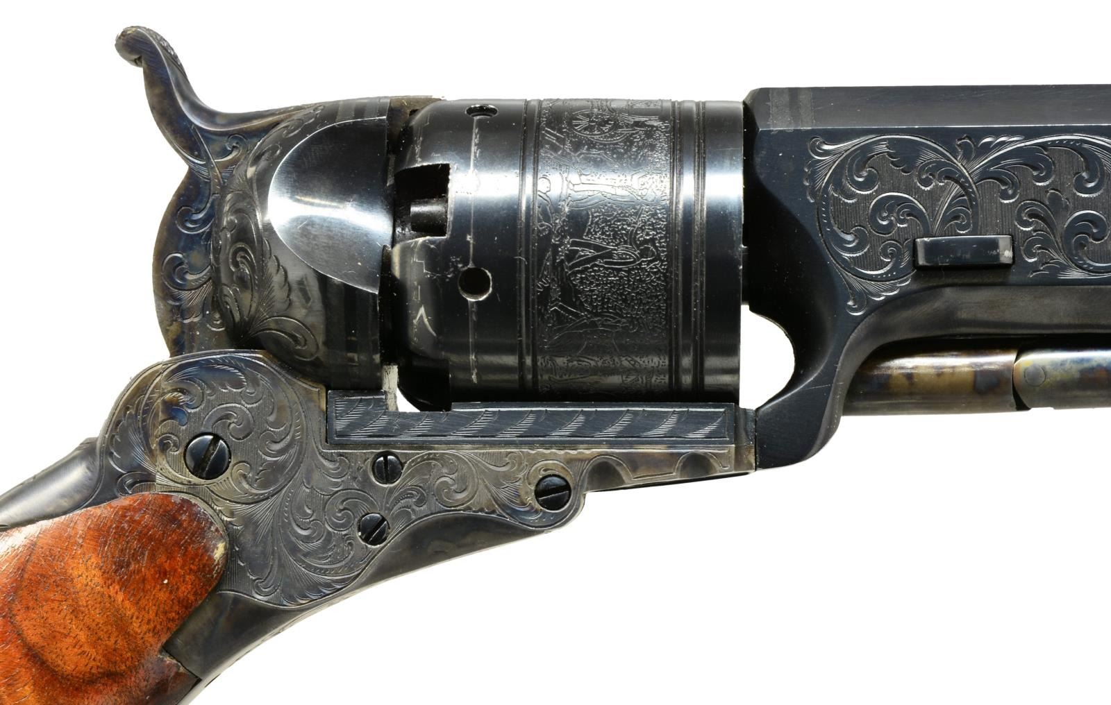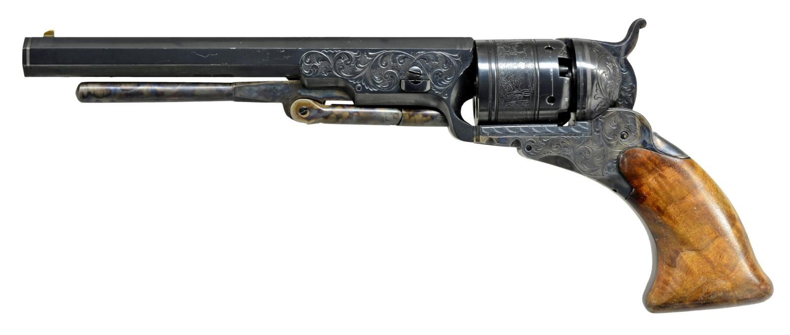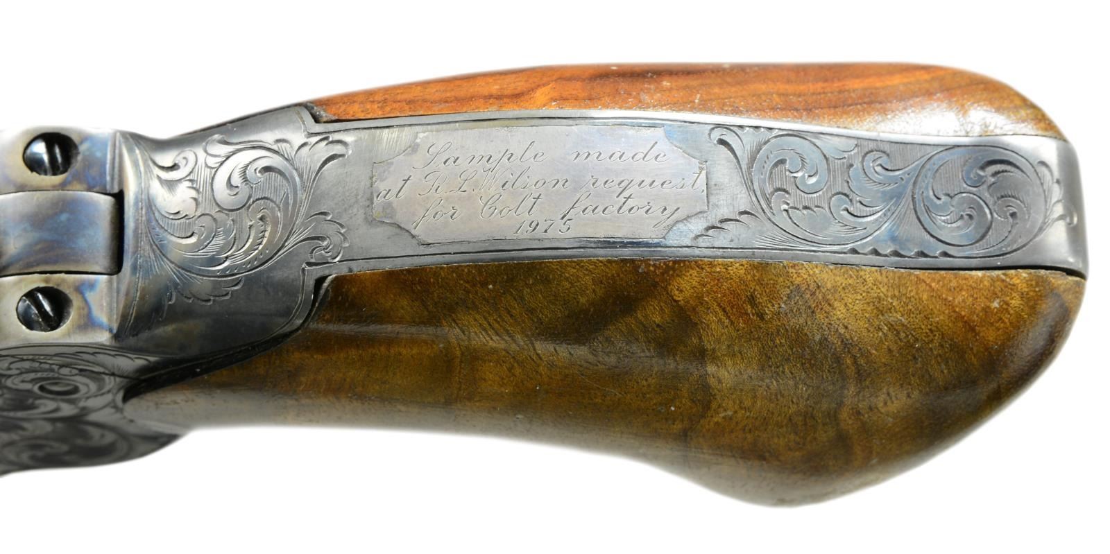 FACTORY IN 1975. Cal. 36. S# P1. Alvin White oversaw the Colt Custom Shop when this revolver was made in 1975. Silver inset plaque in backstrap engraved in script: “Sample made / at RL Wilson request / for Colt factory / 1975”. Standard configuration 13" overall, 7.5" bbl. w/ 1 line Colt Paterson NJ address w/ snake & star terminations; Ehlers lever. 5 silver bands are found on bbl. & recoil shields. Cyl. has stagecoach holdup scene. Frame, bbl. housing & grip frame finely scroll engraved by the master Alvin A. White. UNATTACHED ACCESSORIES: custom Lucite stand & 1999 appraisal letter. CONDITION: extremely fine, retaining virtually all original blue & case colors w/ a few scratches & drag line on cyl. Mechanics need attention, cocks & indexes OK, but folding trigger only extends halfway when cocked. Crisp dirty rifled bore. (01-19965/JS). ANTIQUE. $3,000-4,000.