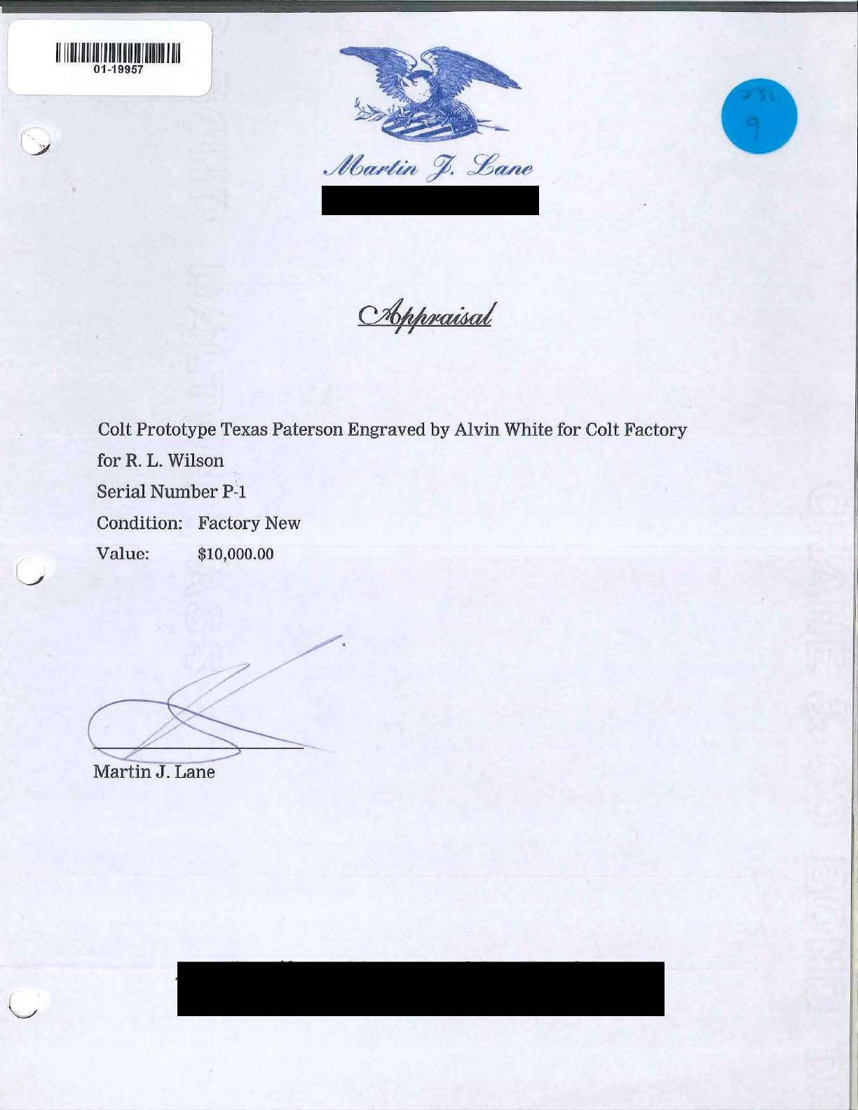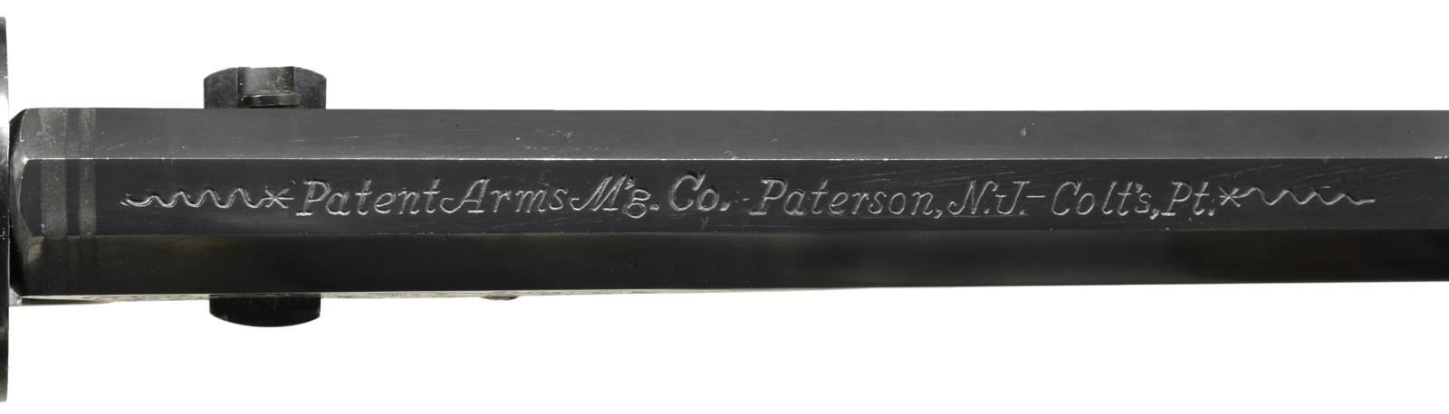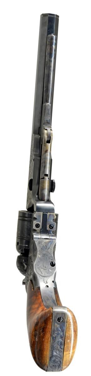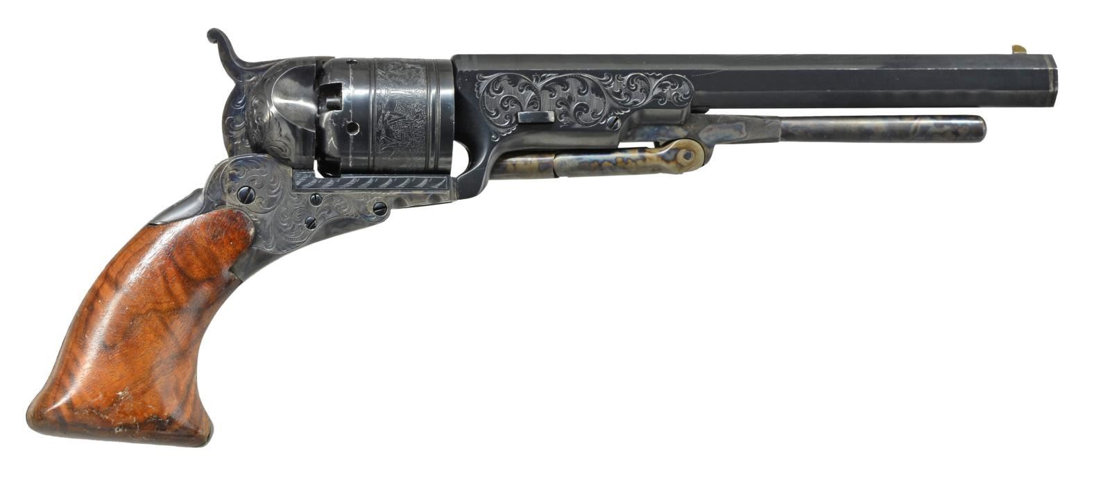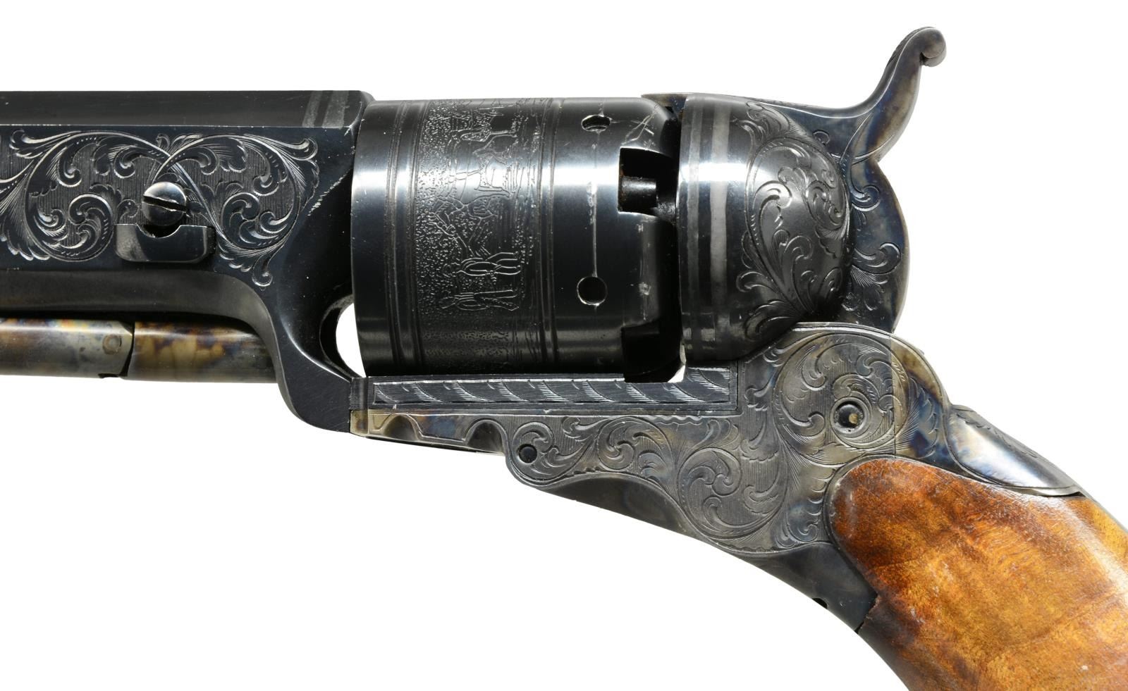 FACTORY IN 1975. Cal. 36. S# P1. Alvin White oversaw the Colt Custom Shop when this revolver was made in 1975. Silver inset plaque in backstrap engraved in script: “Sample made / at RL Wilson request / for Colt factory / 1975”. Standard configuration 13" overall, 7.5" bbl. w/ 1 line Colt Paterson NJ address w/ snake & star terminations; Ehlers lever. 5 silver bands are found on bbl. & recoil shields. Cyl. has stagecoach holdup scene. Frame, bbl. housing & grip frame finely scroll engraved by the master Alvin A. White. UNATTACHED ACCESSORIES: custom Lucite stand & 1999 appraisal letter. CONDITION: extremely fine, retaining virtually all original blue & case colors w/ a few scratches & drag line on cyl. Mechanics need attention, cocks & indexes OK, but folding trigger only extends halfway when cocked. Crisp dirty rifled bore. (01-19965/JS). ANTIQUE. $3,000-4,000.