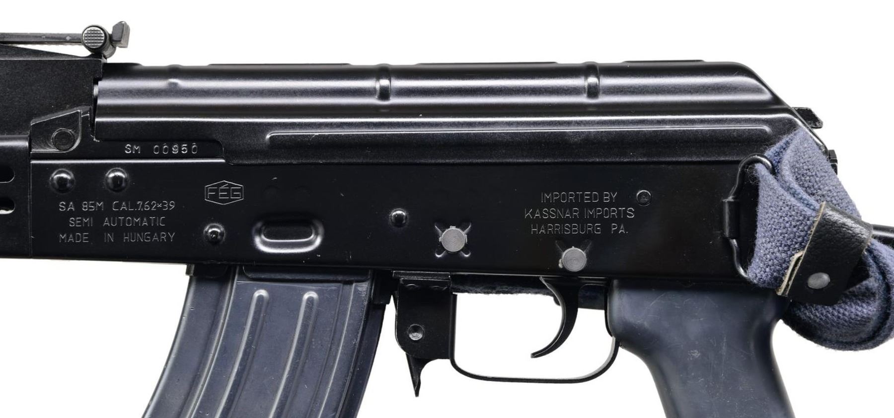 Cal. 7.62x39. S# SM00950. Bbl. 16.5" over muzzle device. Dark black finish on all exposed metal surfaces. Protected post front sight. Rear tangent sight adjustable from 100 to 800 meters w/ CQB setting. Grey rubber forward & rear pistol grips as typically found on rare AMP-69 rifle. Right side folding wire shoulder stock w/ black rubber butt plate. Right side controls. Left side receiver marked "SA 85M CAL 7.62X39 / SEMI AUTOMATIC / MADE IN HUNGARY" in front of mag-well & "IMPORTED BY / KASSNAR IMPORTS / HARRISBURG PA." above trigger. Sling swivels front & rear, currently sporting blue canvas sling. MAGS: 2 steel 20 rd. UNATTACHED ACCESSORIES: Green camoflauge Eagle nylon case. CONDITION: Factory finish complete & consistent w/ light thinning in areas of mechanical intervention. Bright bore w/ strong rifling. Fire control mechanism appears to function correctly when cycled by hand. PROVENANCE: From the Working Reference Collection of Military Arms Instructor, Master Sergeant Vincent Pestilli. (23-7536/JZ). MODERN. $500-800.