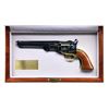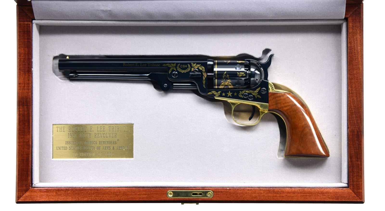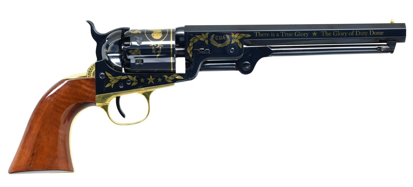 REVOLVER. Cal. 36. S# A95745. Bbl. 7 1/2". Brass post front sight. Italian-made 1851 Navy revolver commissioned by America Remembers as a commemorative revolver to the famous Confederate General Robert E. Lee. This revolver is number 98 of only 1000 made. Blued finish w/ 24 karat gold inlays, including a portrait of Robert E. Lee, "CSA", and the quotes "There is a True Glory" & "the Glory of Duty Done". Polished brass trigger guard & grip frame. Smooth walnut grips. UNATTACHED ACCESSORIES: display case w/ Certificate of Authenticity. CONDITION: all aspects are near excellent. PROVENANCE: the collection of Gun Sport Ltd., owned by Jon R. Thomas. (01-24163/MJC). ANTIQUE. $1,250-1,750.
