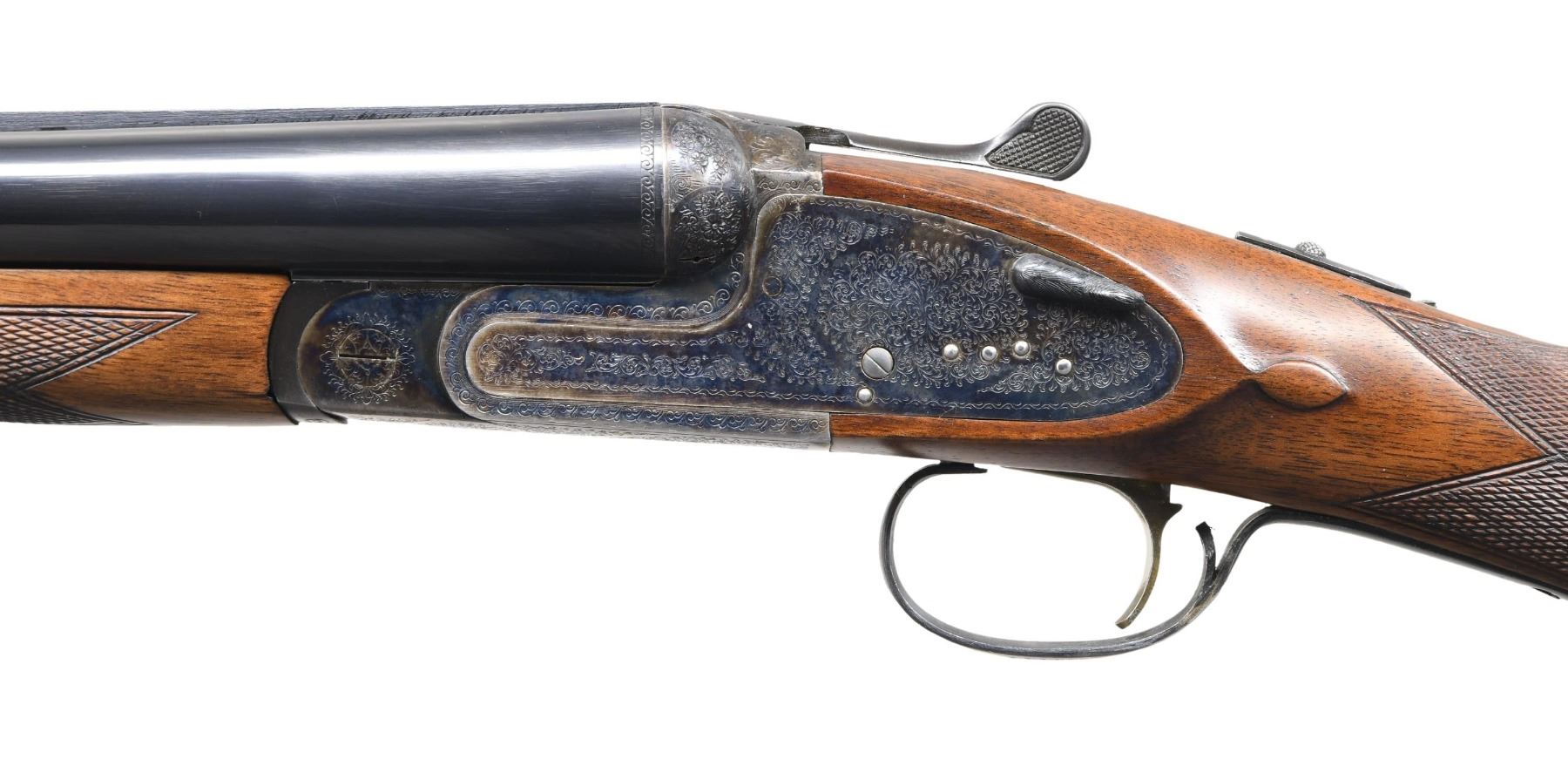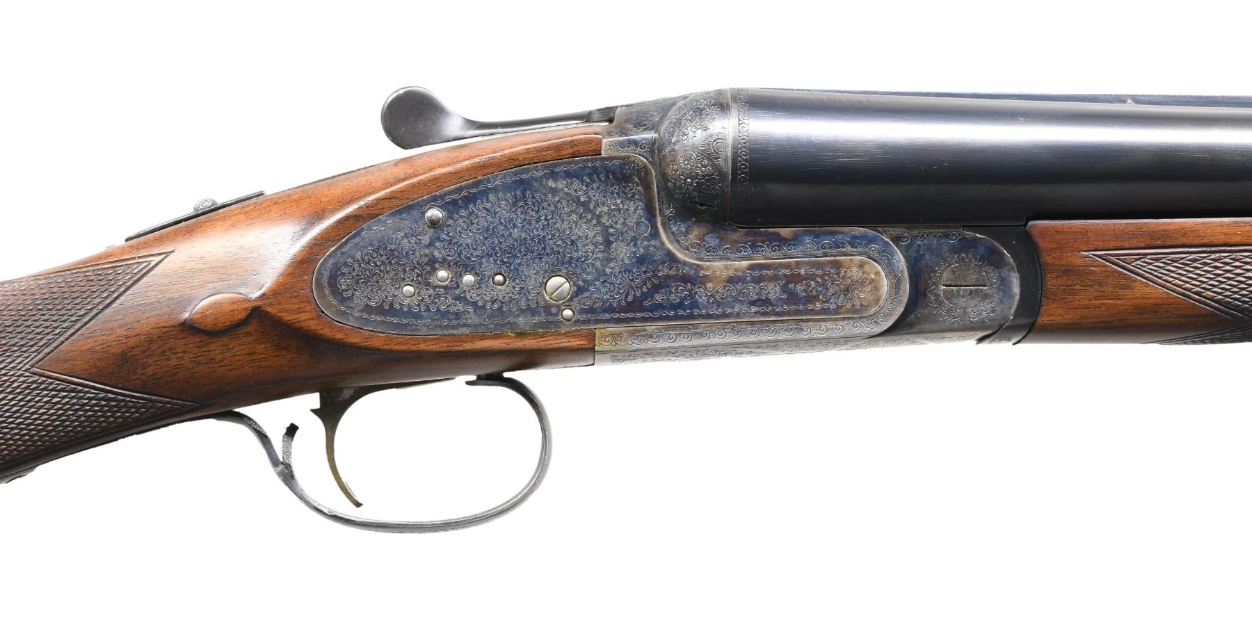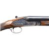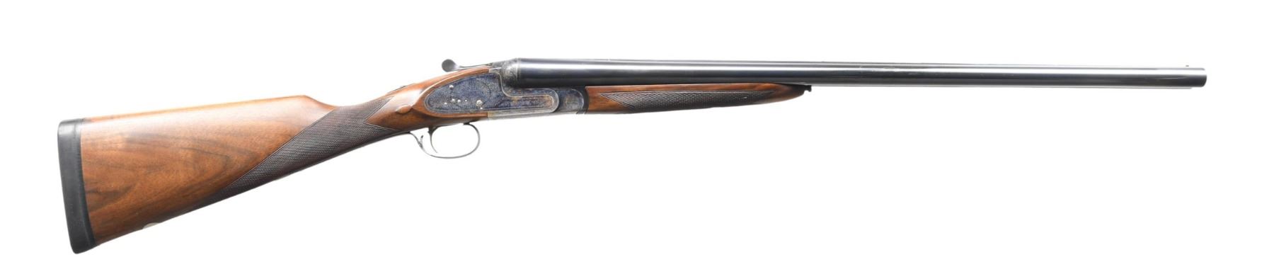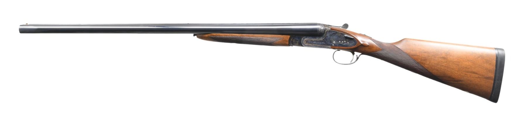 Cal. 12 ga 2 3/4". S# 383862. Bbls. 26" with white front & mid beads. Fixed Imp Cyl. and Mod chokes. Case-colored sidelock action features hand-detachable locks, cocking indicators, non-selective single triggers, and ejectors. Full coverage scroll ornamentation. Splinter forearm and straight grip stock of satin-finished checkered walnut with an oval nameplate in the toeline. LOP: 13 3/4" over solid black decelerator pad. DAC: 1 3/8". DAH: 2 3/8". Neutral cast. WEIGHT: 7 lbs., 3.2 oz. Mfg. in Spain by Diarms. CONDITION: over 98% bbl. blue. Action retains over 80% of its case colors, showing carry wear. Very good wood finish. Very good, bright bore. (24-4018/DS). MODERN. $800-1,200.