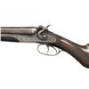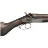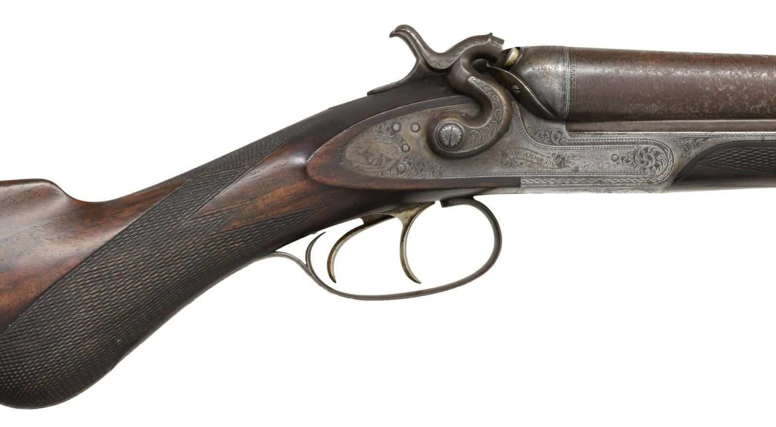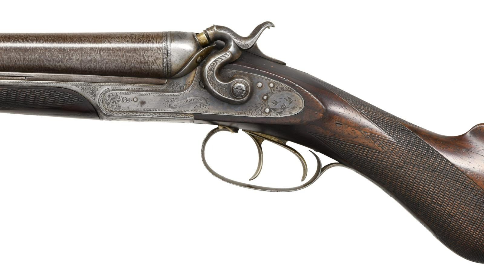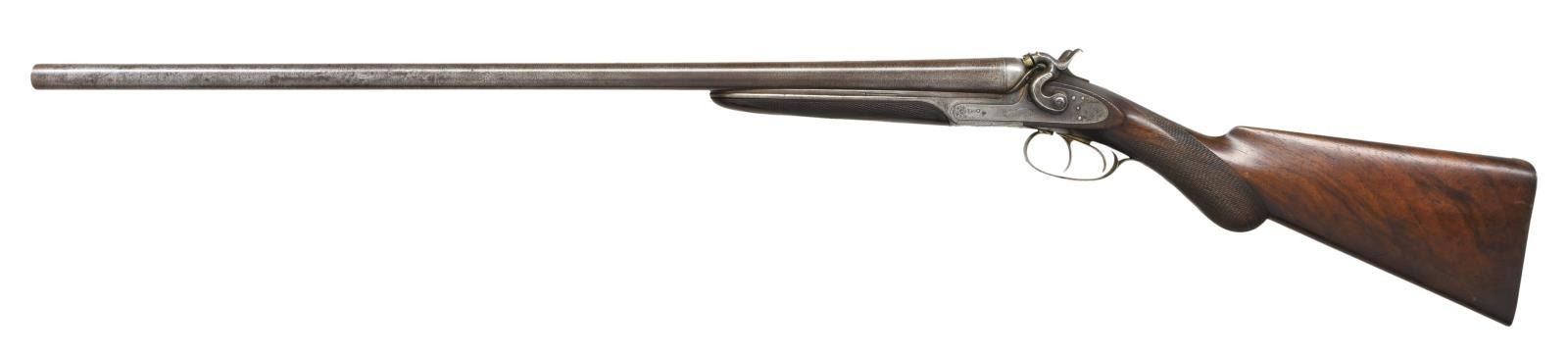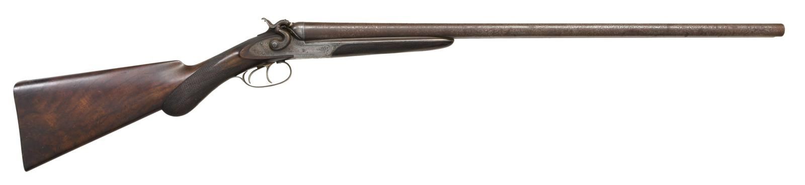 Cal. 12 Bore. S# 1245. Bbls. 28" Damascus steel. Brass bead front sight. Mfg. in Boston. Unique breech design w/ top tang release allowing bbls. to swing to right side. Dbl. Triggers. Extractors. Action & hammers have floral engraving. Action also has engraved game & dog scenes. Bbls. exhibit play. Checkered pistol grip walnut stock & forend. LOP: 14 1/8". CONDITION: stock set appears lightly sanded w/ a repaired chip at rear of forend, scattered dings & handling wear. Metal is mostly a gray patina w/ scattered oxidation & traces of original finish. Good bright bores w/ a few spots of pitting. (01-24203/MJC). ANTIQUE. $500-900.