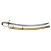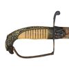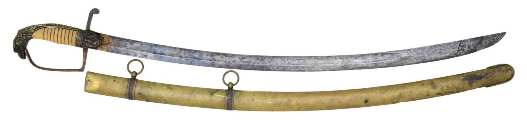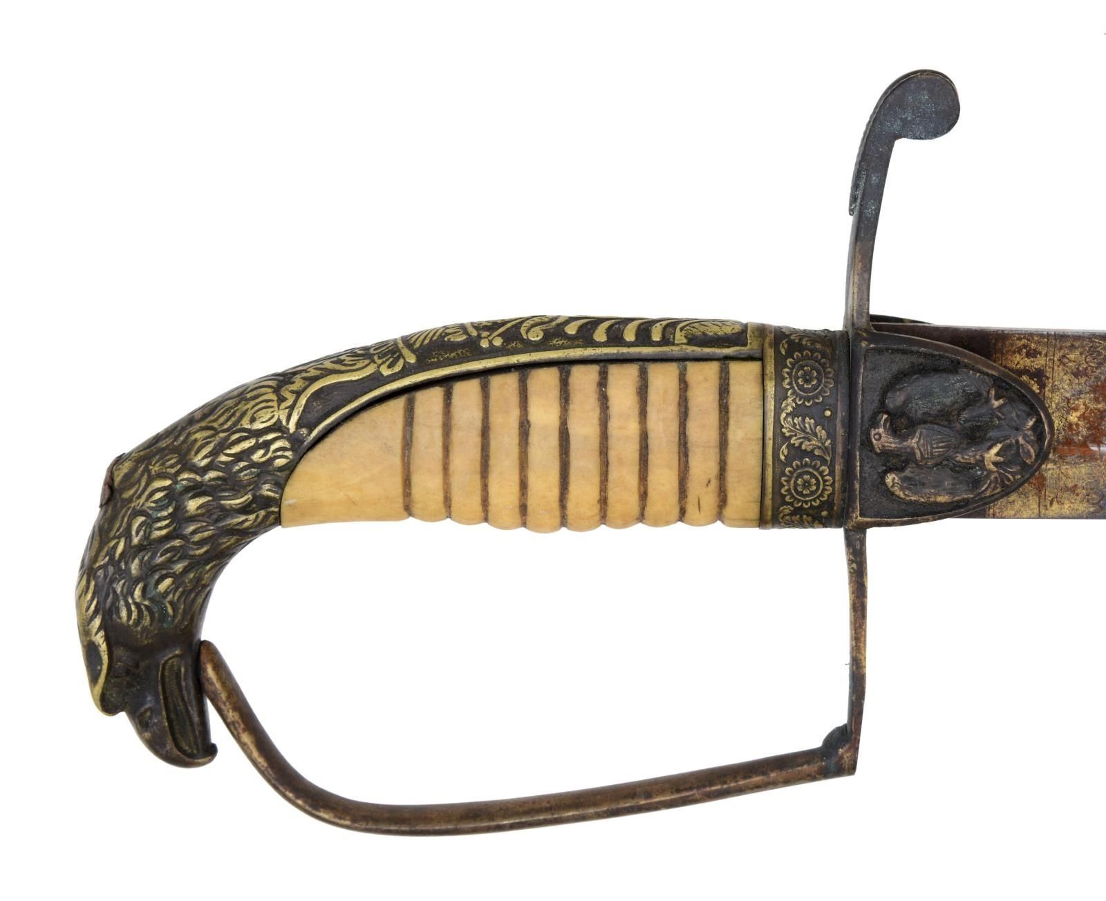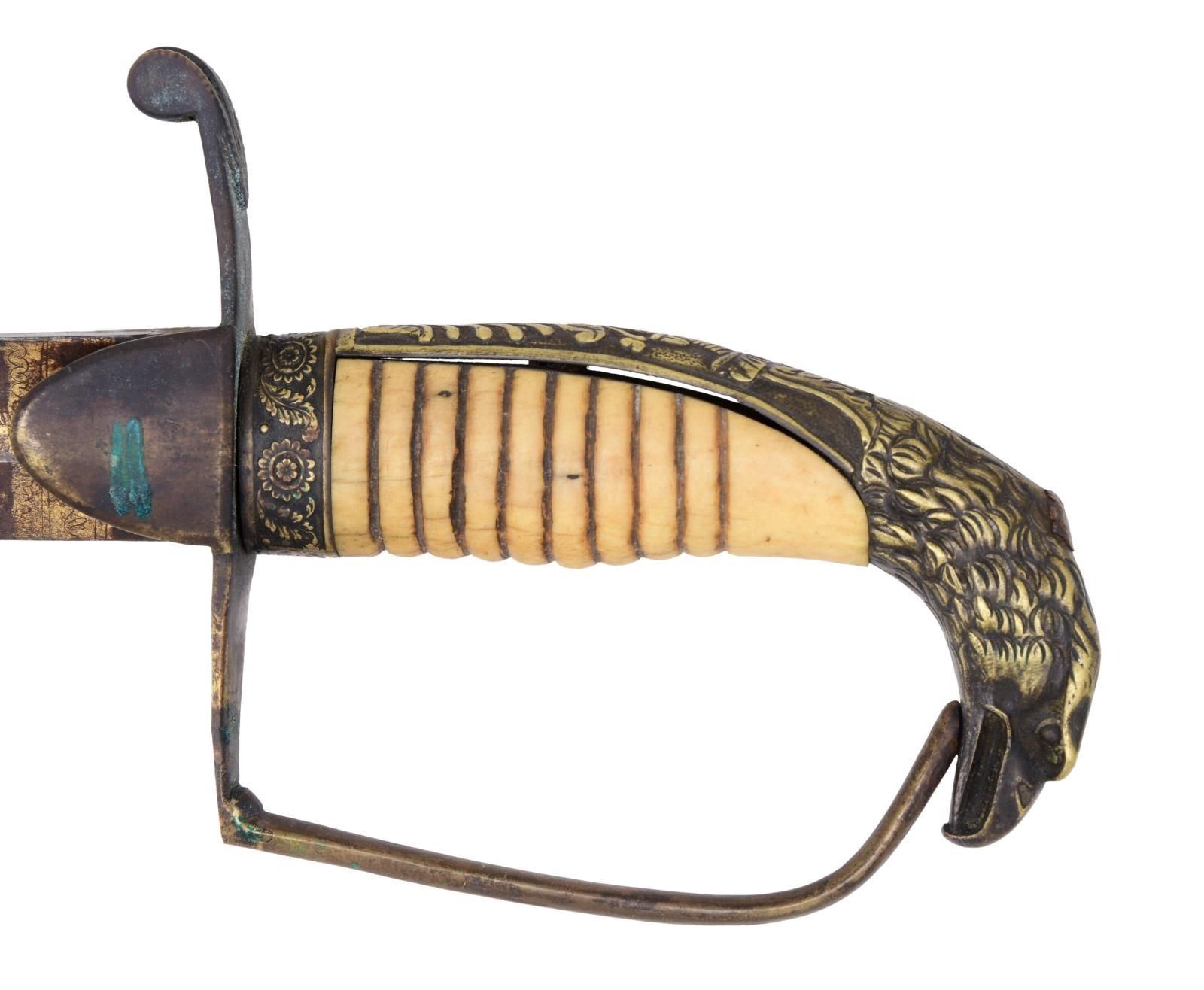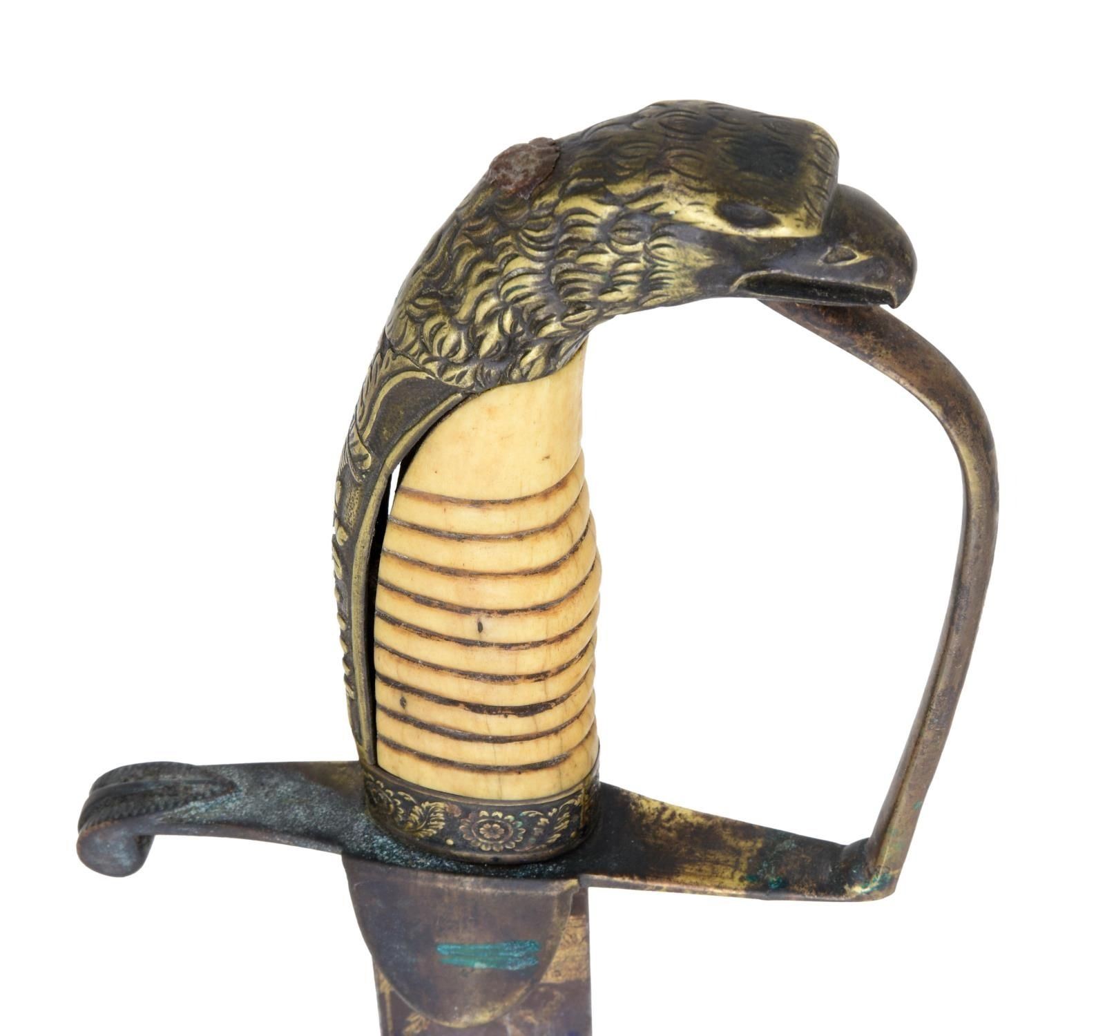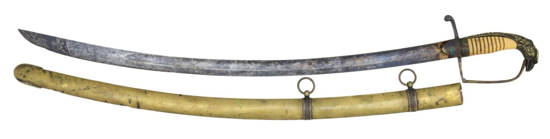 PERIOD. Overall length: 34 3/4". Blade length: 29”. An interesting eagle head of English manufacture with a very well-fitting scabbard of French manufacture. The blade has a single wide fuller with gold-highlighted etching on a blued field over the first 12 1/2". Etching includes a spray of arms, a spray of arms with a federal shield/liberty cap, and foliate motifs. Gilded brass hilt featuring an eagle on the front languet. Plain crossguard with a downturned quillon and a plain knuckle bow. Highly embellished backstrap with foliate motifs terminating in a well-articulated eagle head pommel. Certifiably antique ivory grip. Gilded brass scabbard of French manufacture. CONDITION: blade has a dark, mottled patina with evidence of a broken and re-welded tip. The blued field is only about 10%. Gilded highlights are 60%. The hilt retains no original gilded finish. The grip shows wear but is complete with a few tiny age cracks. Scabbard has several shallow dents, particularly on the edge. PROVENANCE: The Collection of Edward Scott Meadows. (02-22066/BF). $300-500.