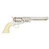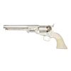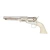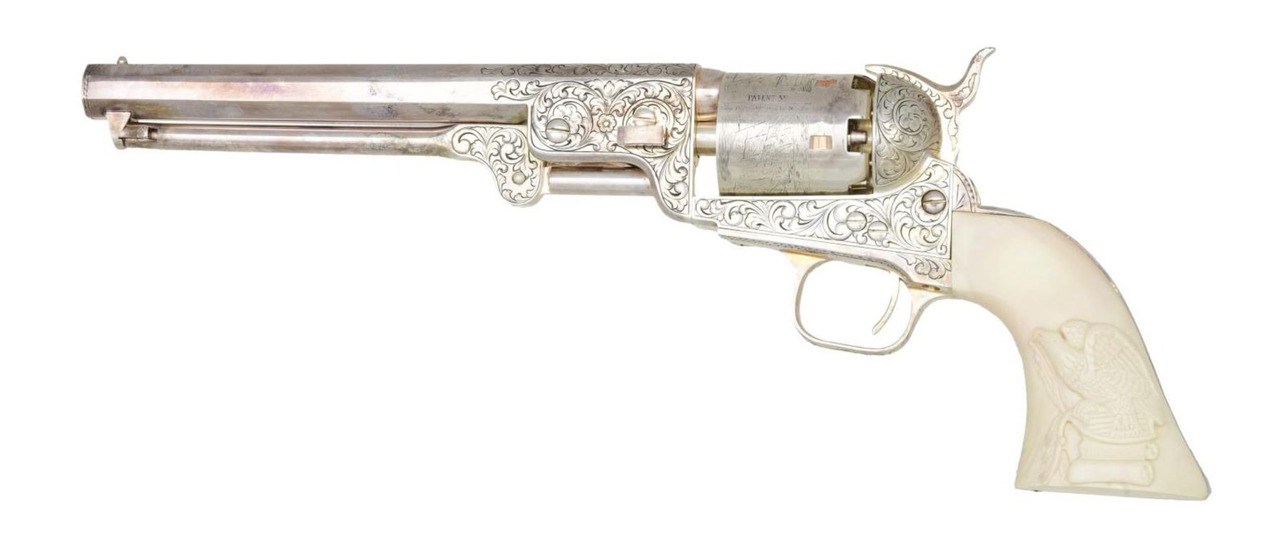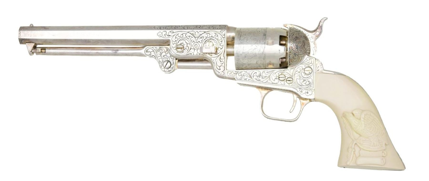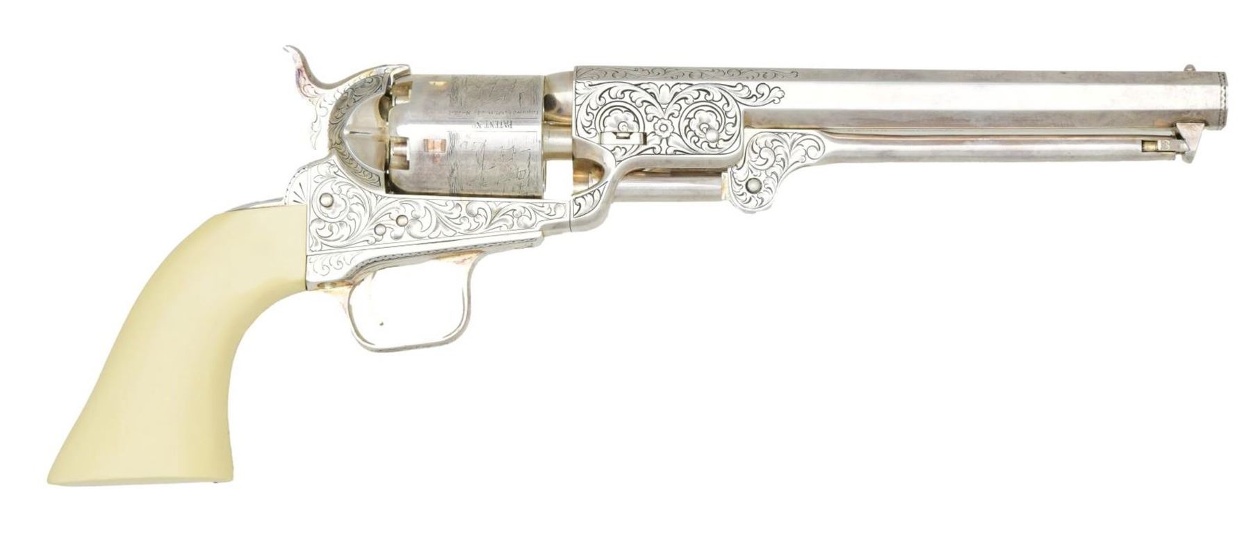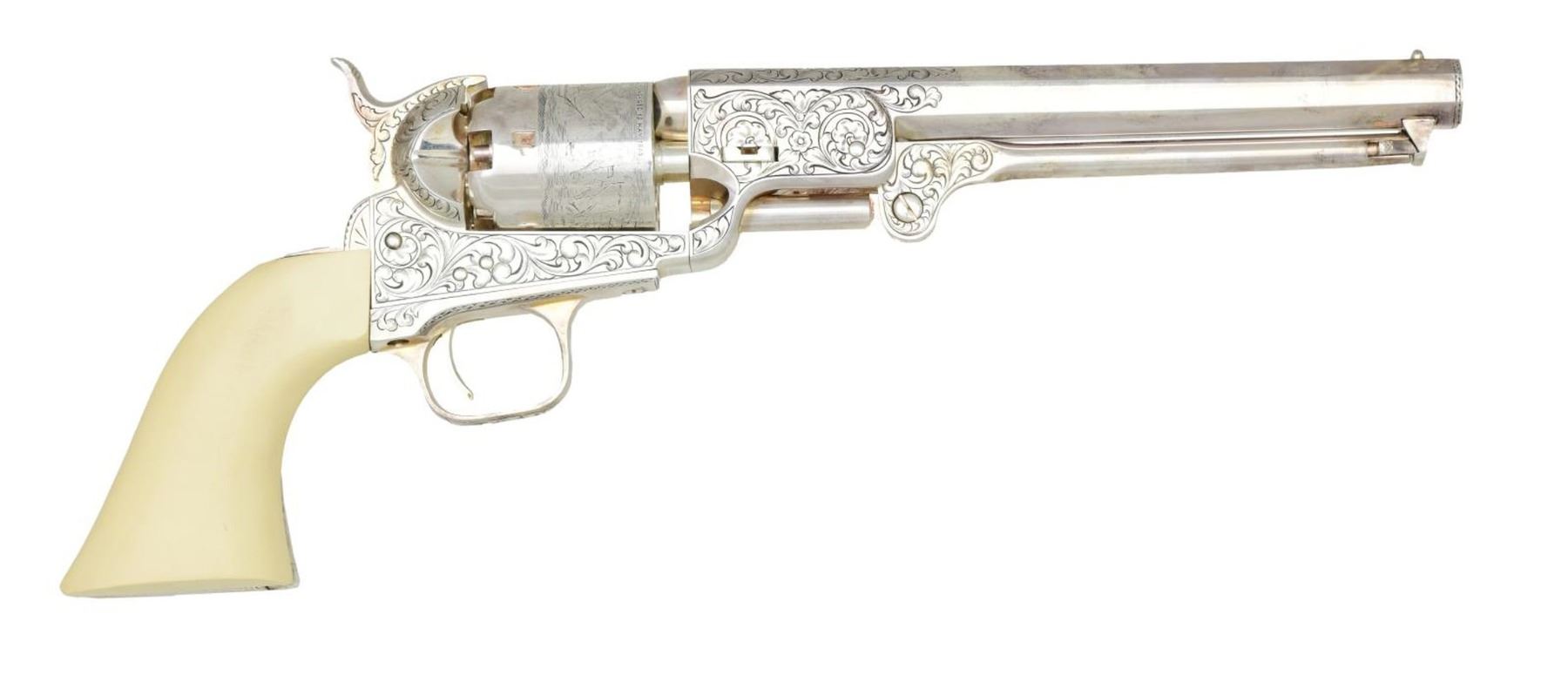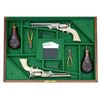 1851 NAVY REVOLVERS. S#: JBH100 & JBH101. This attractive set was presented as the "Best of Show" award by the Colorado Gun Collector's Association at their 2012 Denver show. The winning display, titled "Winchester Model 42 Elite Grades," was the winner among a field of 78 displays. Both cals. are .36. Bbls. are 7 1/2", octagon with cone-type sights. Six-shot round roll-engraved cyls. Bbls., frames, grip straps, loading levers, and hammers have 75% coverage of open-pattern foliate scroll hand engravings. Full silver finishes. Synthetic ivory American Eagle grips. A limited edition of 500 was issued as a tribute to "Prince of Pistoleers," as Bill Hickok was known. These ornate revolvers were issued only in pairs, as Hickok always carried two. Mfg. in Italy by Uberti. UNATTACHED ACCESSORIES: original glass top French fit case with segmented green interior. The centerpiece of the case is a synthetic leather commemorative plaque holding a dead man's hand (aces & eights) of playing cards. The case also holds two powder flasks, two nipple wrenches, two bullet molds, and the case key. CONDITION: both revolvers appear unfired. Silver finishes have acquired light-age-related tarnishes. The right grip panels show some age-related yellowing. (01-24679 & 01-24680/DS). ANTIQUES. $1,000-1,500.