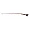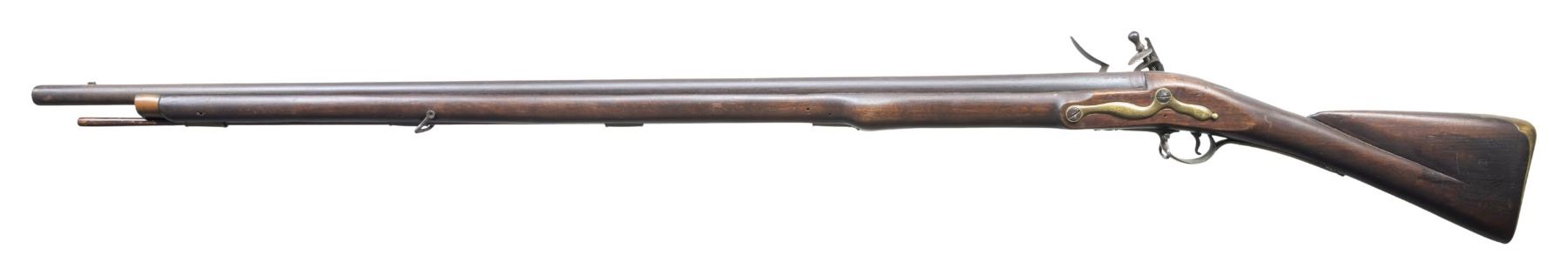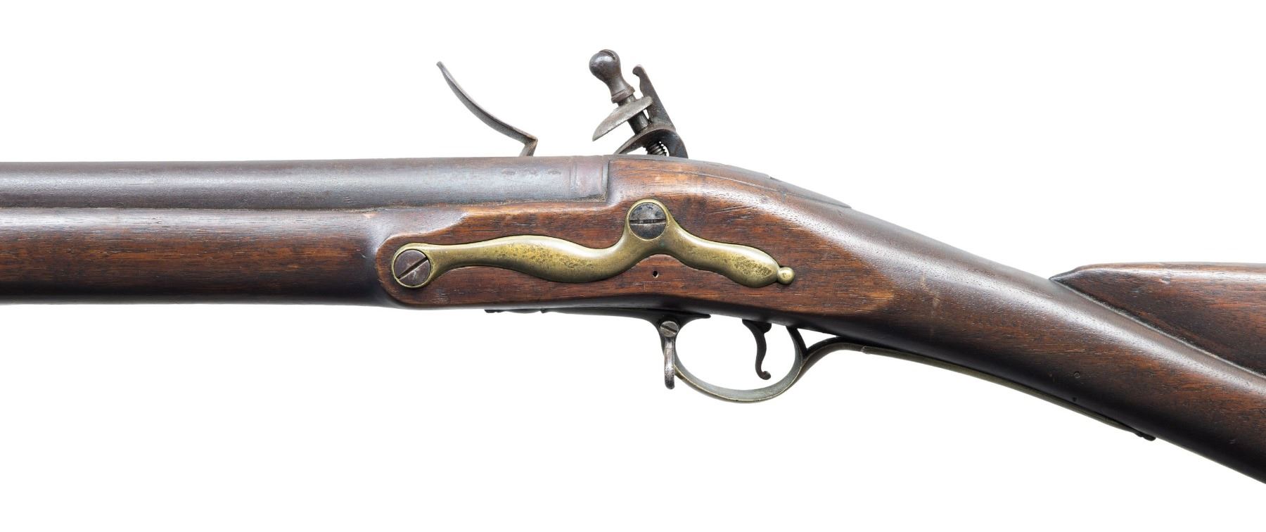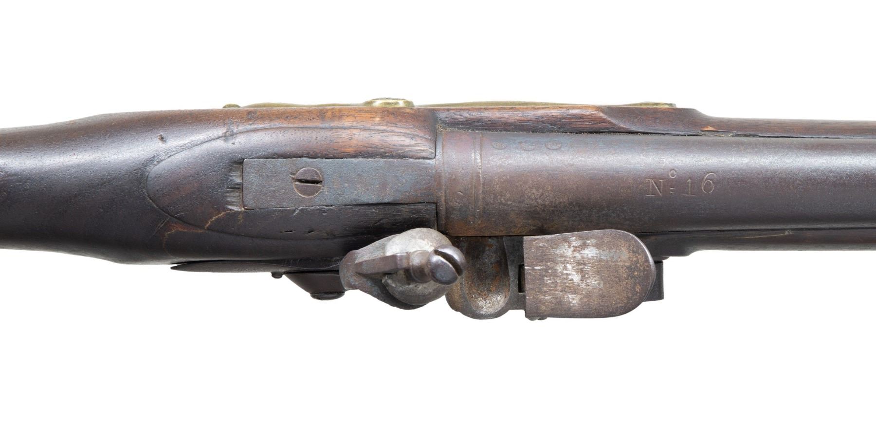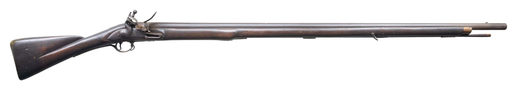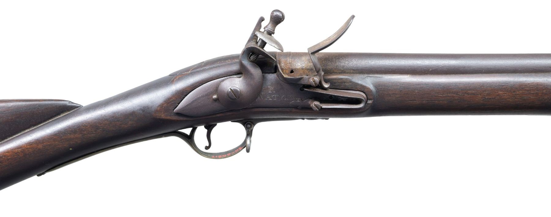 COMMERCIAL "BROWN BESS". Cal. 77. S# NSN. The 46-1/4" barrel with London black powder proofs and "RW" stamp at breech end is engraved "No. 16" on top. Lock with rounded and arched plate is built with serpentine cock, integral pan, bridled friction frizzen and feather spring with foliate finial. "R." Watkins" is under pan. No government marks are found. Stock of American walnut mimics original "Brown Bess" in style with handrail comb, palm swell, slight beavertail around barrel tang and brass forend tip about 4" from muzzle. Stock however, is much heavier and thicker than regulation. No marks are present. Brass furniture is of 1742 type and sling loops are present. A hickory ramrod mounts through three beaded pipes and matching thimble. CONDITION: good to fine as restocked. Iron and steel parts present an even brown patina. Stock retains most of its original oil finish. Brass is nicely toned. Bore is dark. Lock is operable. (01-27880/MGM). ANTIQUE. $3,500-6,000.