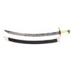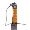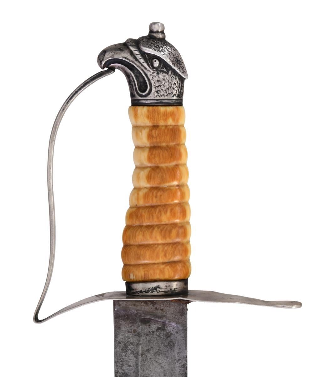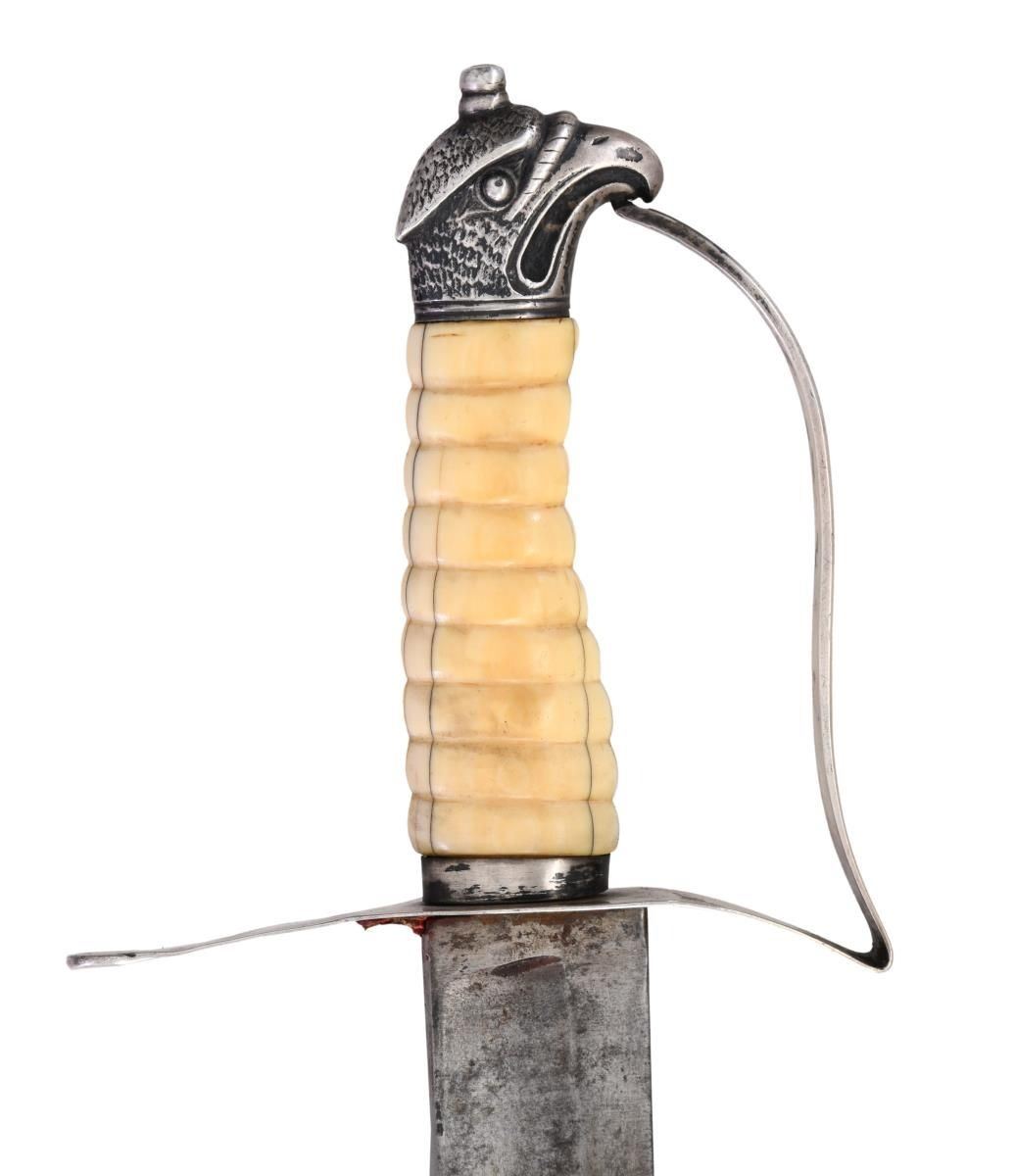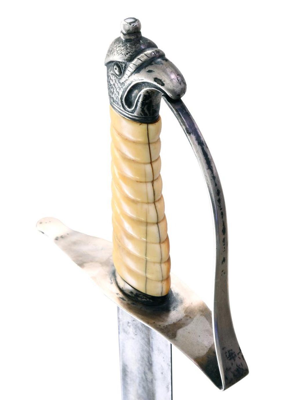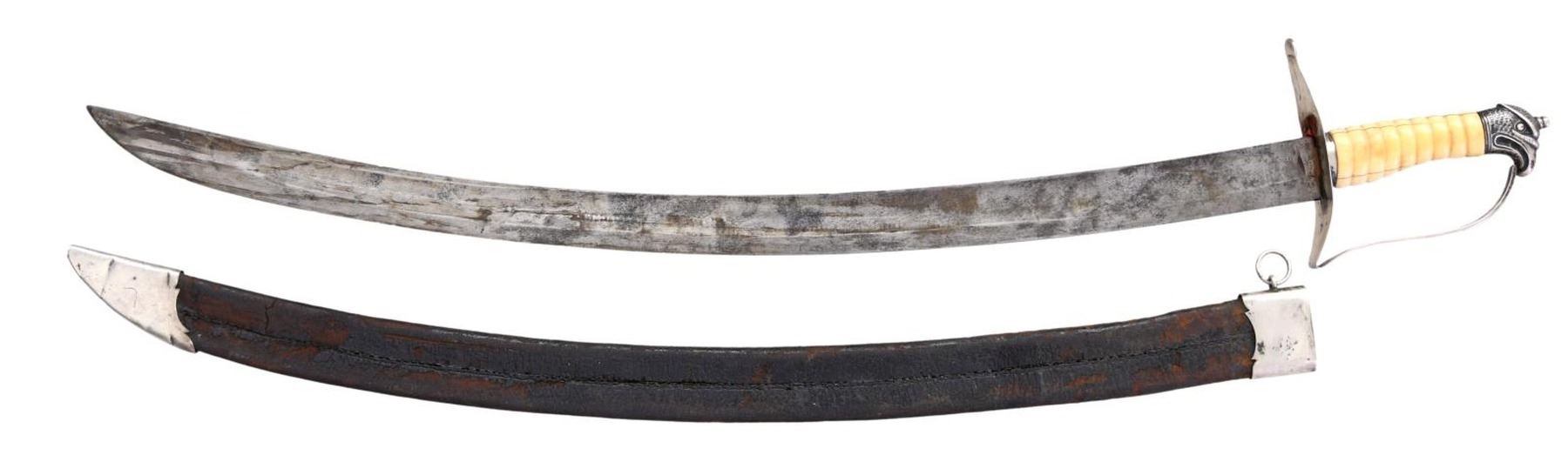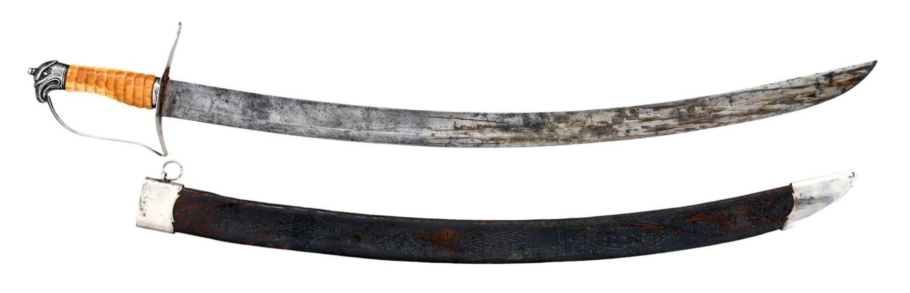 Overall length: 34 3/4". Blade length: 29 1/8”. Plain blade with an exceptionally large fuller. Silver hilt with a relatively plain guard and expanded quillon. Unadorned knuckle bow enters the exceptionally expressive eagle head pommel just below the beak. 2-Level capstan with a silver ferrule at the base of the grip. Certifiably antique ivory, 9-rib grip. Leather scabbard with original silver throat & drag. Scabbard has a discernible incised line design. CONDITION: blade has a medium gray, mottled patina with some staining but no evidence of pitting. Guard & knuckle bow are complete and undamaged, though slightly bent. Pommel is undamaged, but hilt is a bit loose overall. Grip has a few tight age cracks with some discoloration on one side, possibly from being in contact with leather for an extended period of time, or it may be simply the bark of the ivory blank. Scabbard is quite flaked but remains amazingly solid for its age. Throat & tip exhibit expected dents & dings but no major issues. A truly exceptional American silver hilted saber. (02-20964/BF). $3,000-4,000.