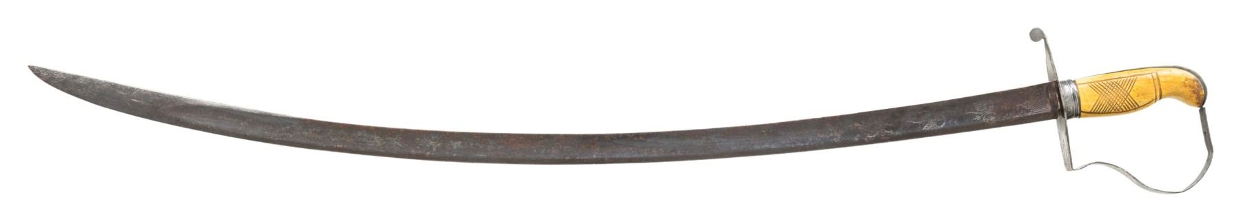 This War of 1812 era silver hilted officer's sword measures 38" overall with a 32 7/8" etched blade featuring a single wide fuller. Etching includes sprays of arms and foliate motifs combined with swags. The silver hilt has an engraved crossguard showing foliate motifs with a drop quillon. The knuckle bow has similar motifs and is of reverse "P" design. The backstrap has lineal engraving topped by an elaborately engraved bird's head pommel. Above the ornate silver ferrule is a dual crosshatch grip of organic cream colored material. No scabbard. CONDITION: blade has a dark patina, but etching remains quite clear. Hilt is undamaged and engraving is readily apparent. Grip has a wonderful early patina with no losses, but a few tight age cracks. (02-26072/BF). NON-GUN. $1,000-1,400.